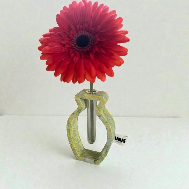 ※ご購入前にご確認ください 当アイテムはすべて手作業で色材を調合・成形しているため、仕上がりにわずかな色ムラや濃淡の違い、気泡が生じる場合がございます。 一点ものならではの風合いとしてお楽しみいただければ幸いです。 ジェスモナイトでひとつひとつ丁寧に作った本体に、試験管をゆらゆらっと通した、遊び心のあるフラワーベースです。 お花や水耕栽培のグリーンを生けると、まるで植物が宙に浮いているみたい。 デスクやリビングはもちろん、玄関にちょこんと飾れば、お家の空気が華やかになります。 すべて手作業で仕上げているので、同じ模様はひとつもありません。 毎日目にするたびに、ちょっとだけ心がきゅんとする——そんな存在になれたら嬉しいです。 ■ カラー / サイズ / バリエーション ・カラー:イエロー ・サイズ:約 直径10.7cm × 高さ16.3cm ■ 素材 ・素材:ジェスモナイト ■ お手入れ / 取り扱いのご注意 ・やわらかい布で軽く拭くだけでお手入れOK ・試験管部分を取り外して、洗ったり水の補充をしてください ・直射日光・高温多湿は避けて保管ください ・落としたり強い衝撃を与えないようご注意ください ■ 発送・ご注文について ・ご注文から3〜4営業日以内に発送 ・在庫状況により、お届けまでお時間をいただく場合がございます ■ その他のご案内 ・手作り品のため、模様や質感に個体差があります ・返品・交換は「未使用品」のみとなります