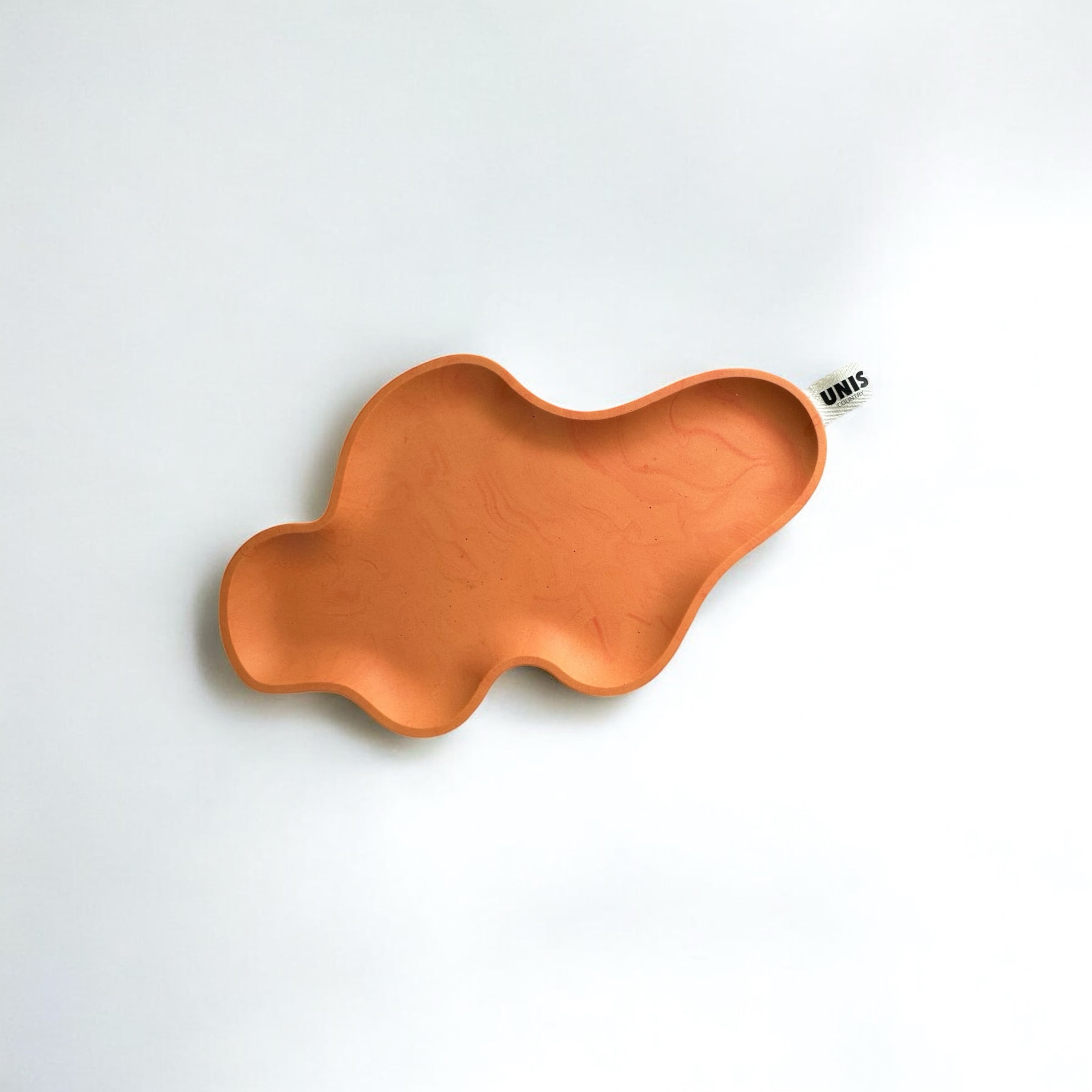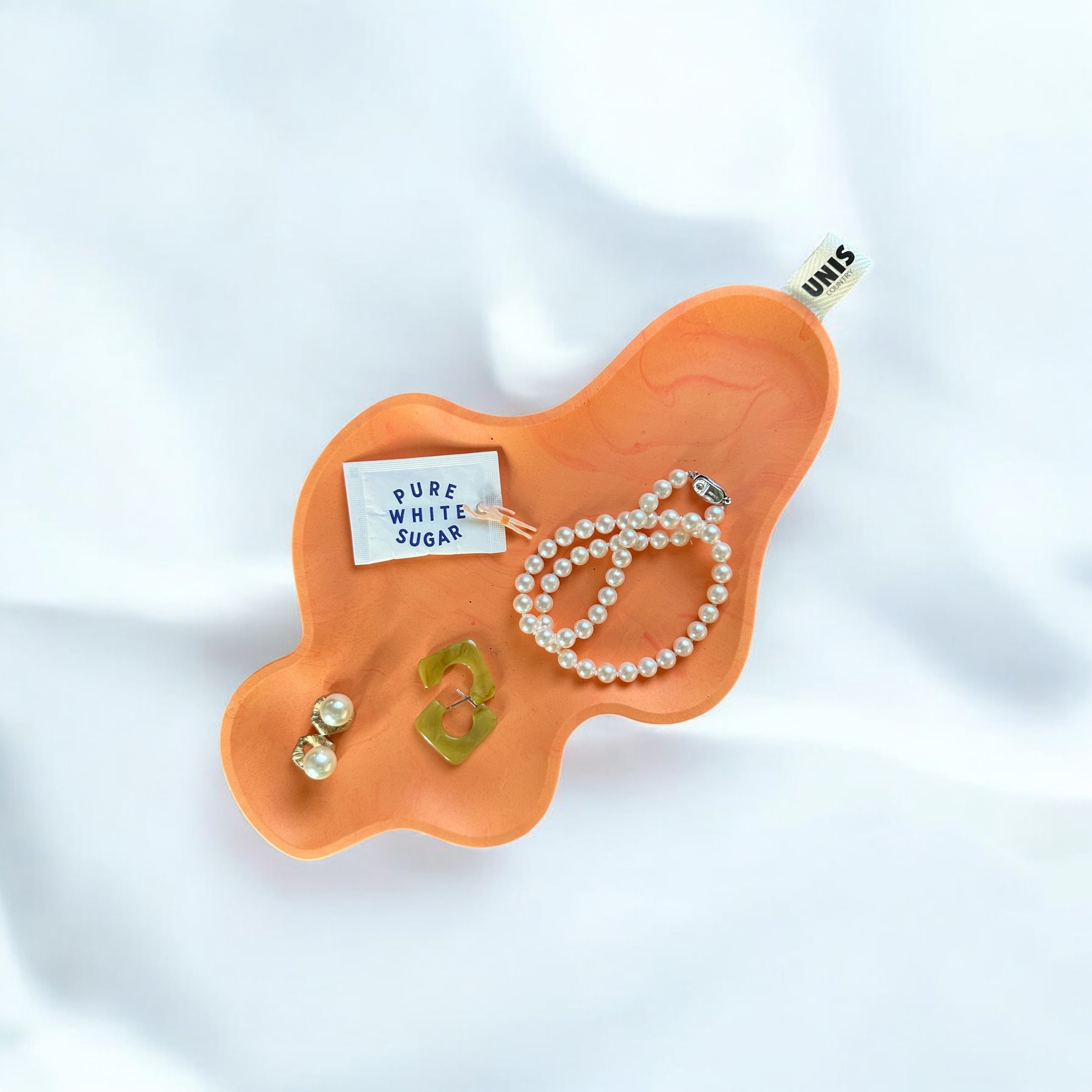 個性的なフォルムが目を惹く、オレンジカラーのアクセサリートレイ。