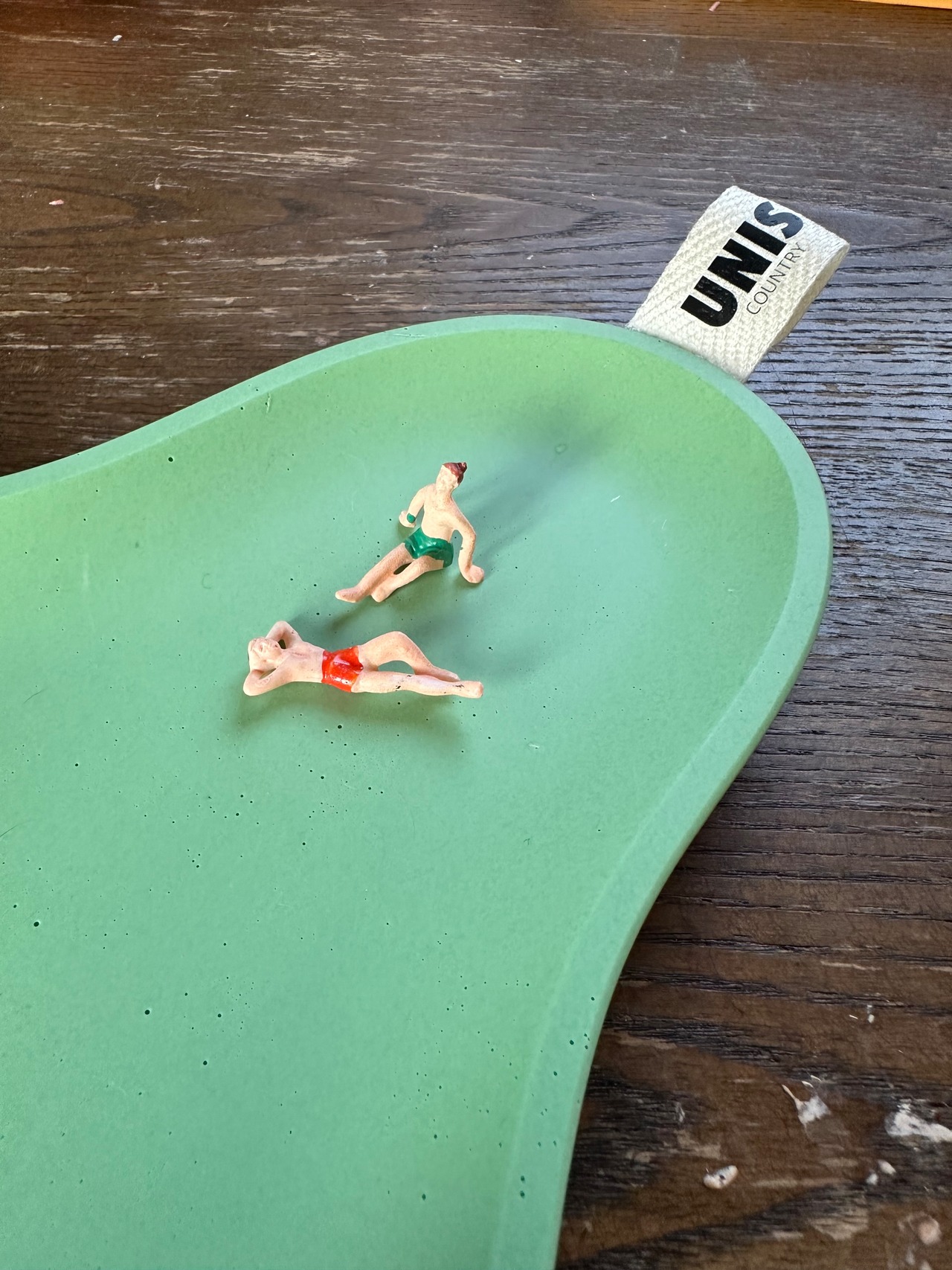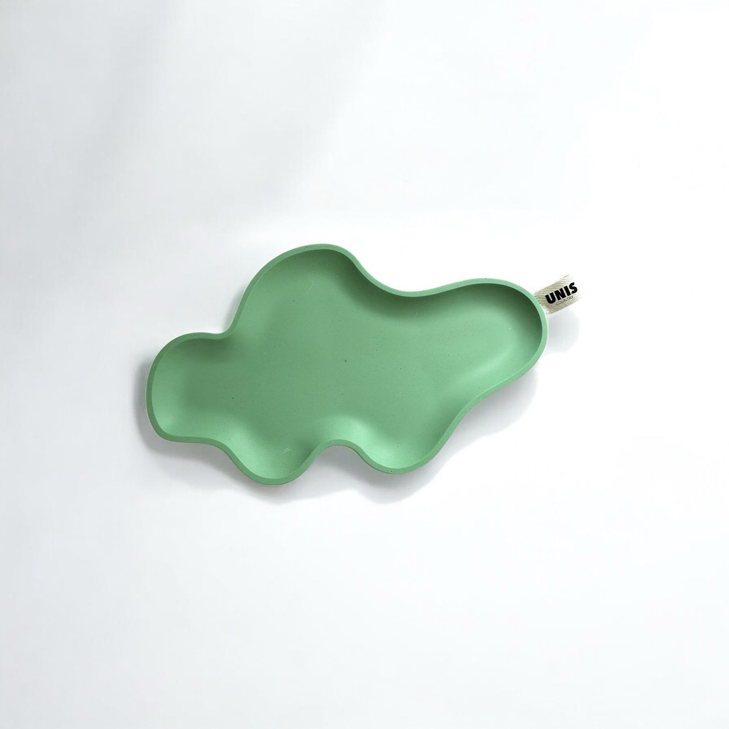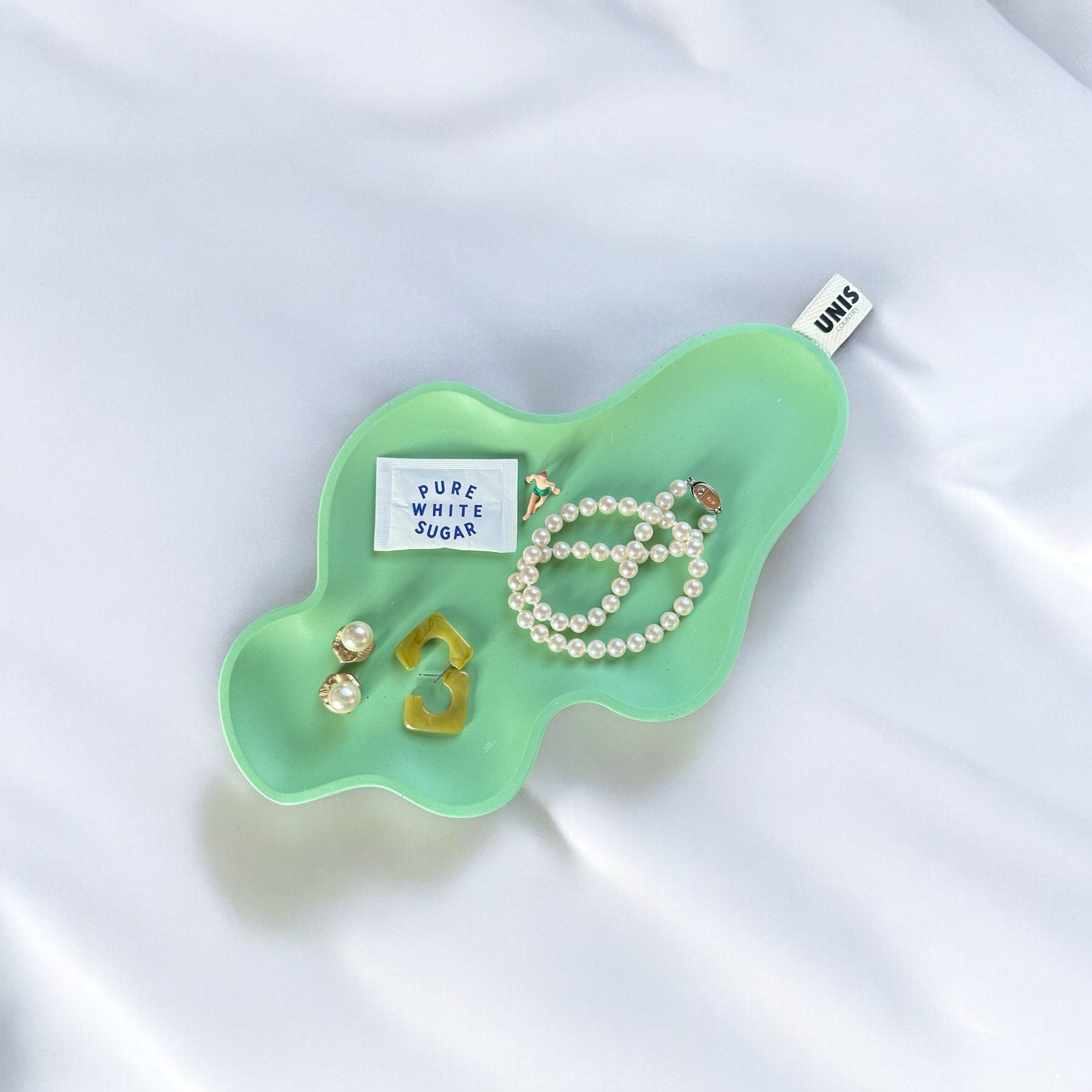 個性的なフォルムが目を惹く、グリーンカラーのアクセサリートレイ。
