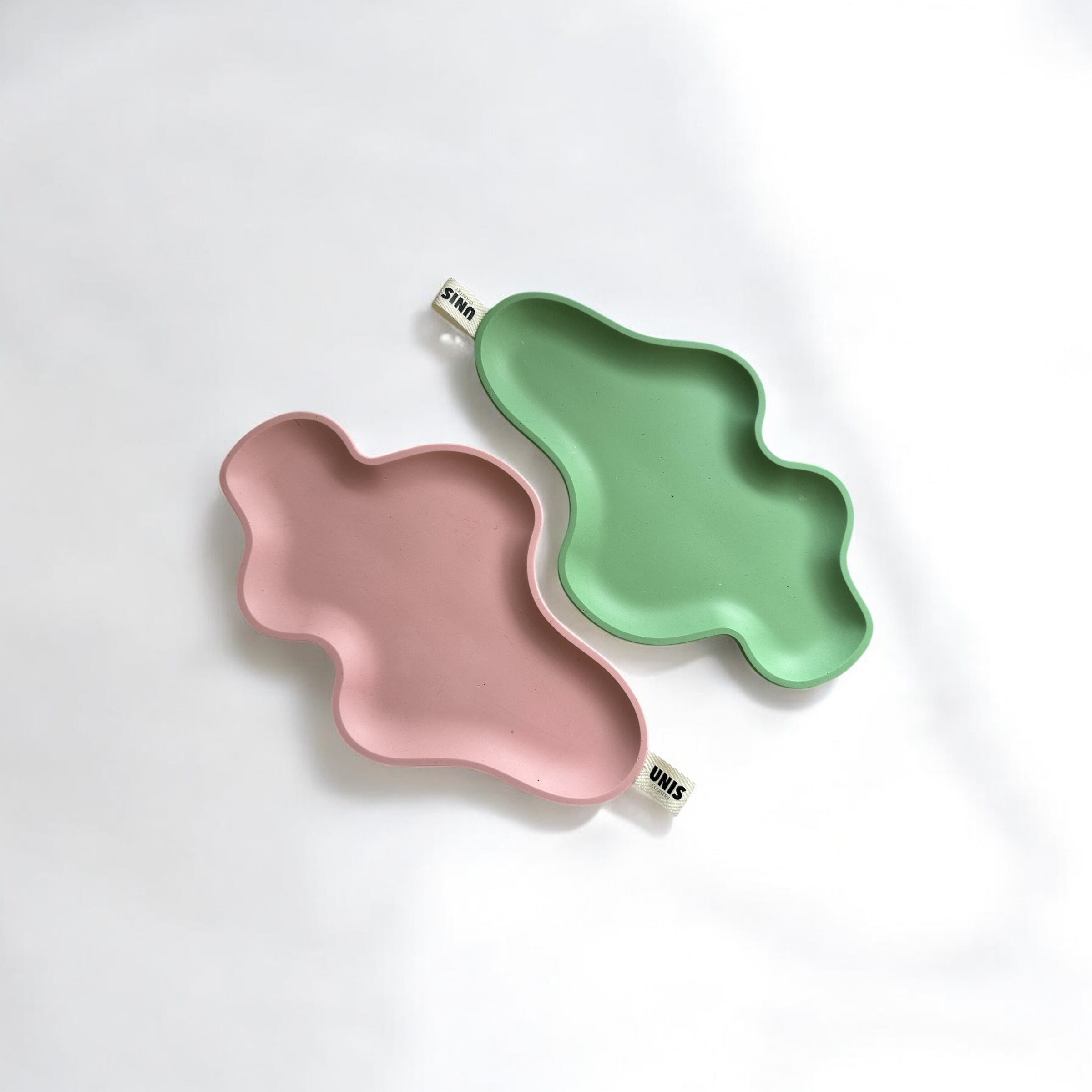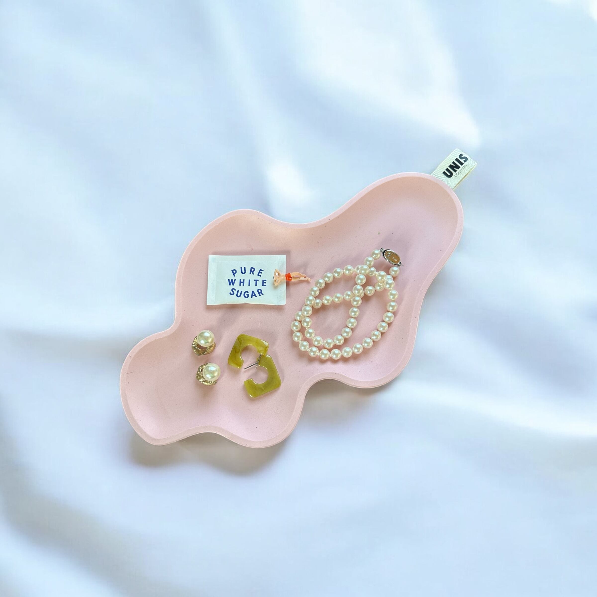 個性的なフォルムが目を惹く、ピンクカラーのアクセサリートレイ。