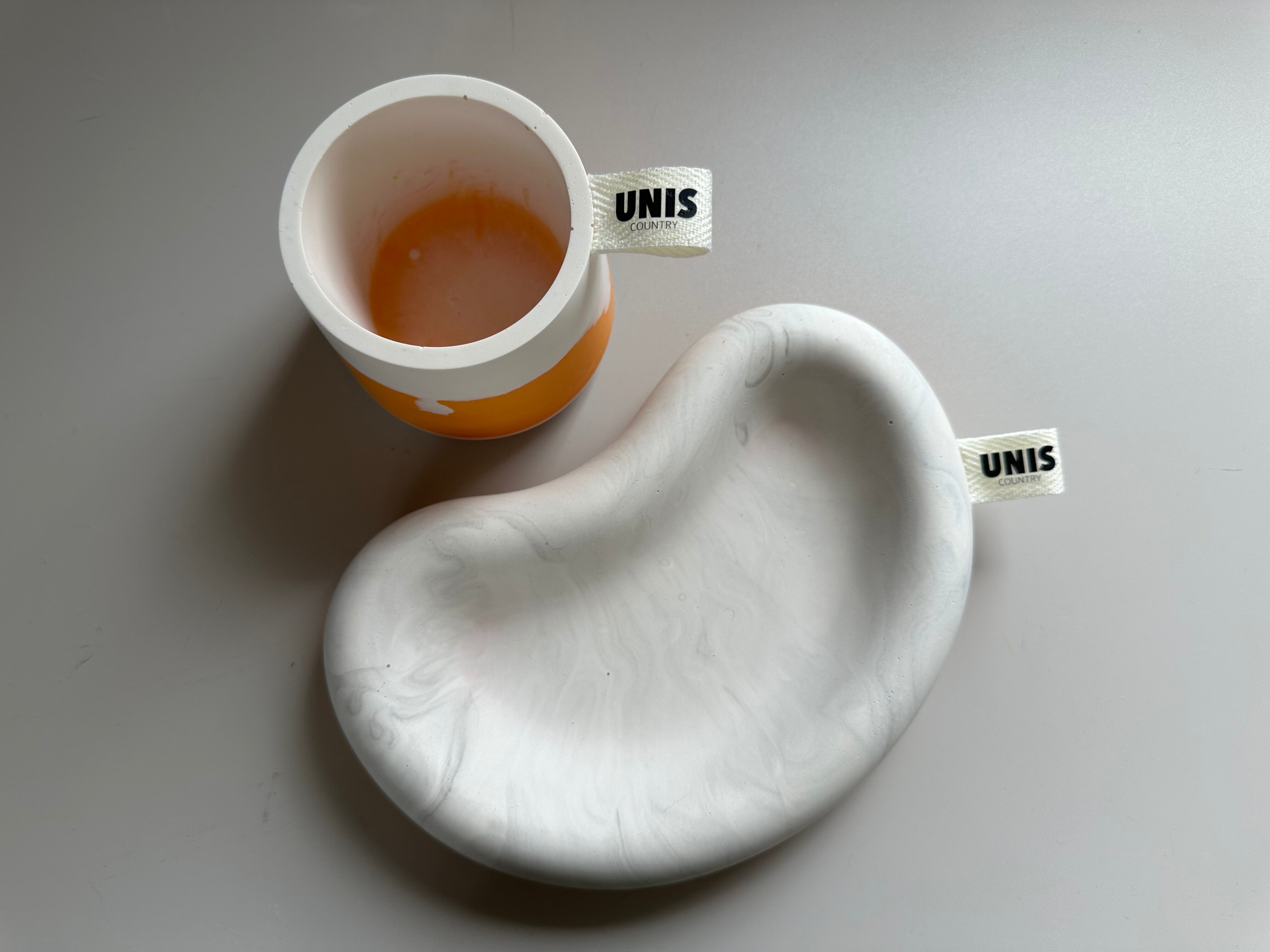 ホワイトマーブルの大理石風模様に、背面のオレンジがさりげなく映えるアクセサリートレイ。