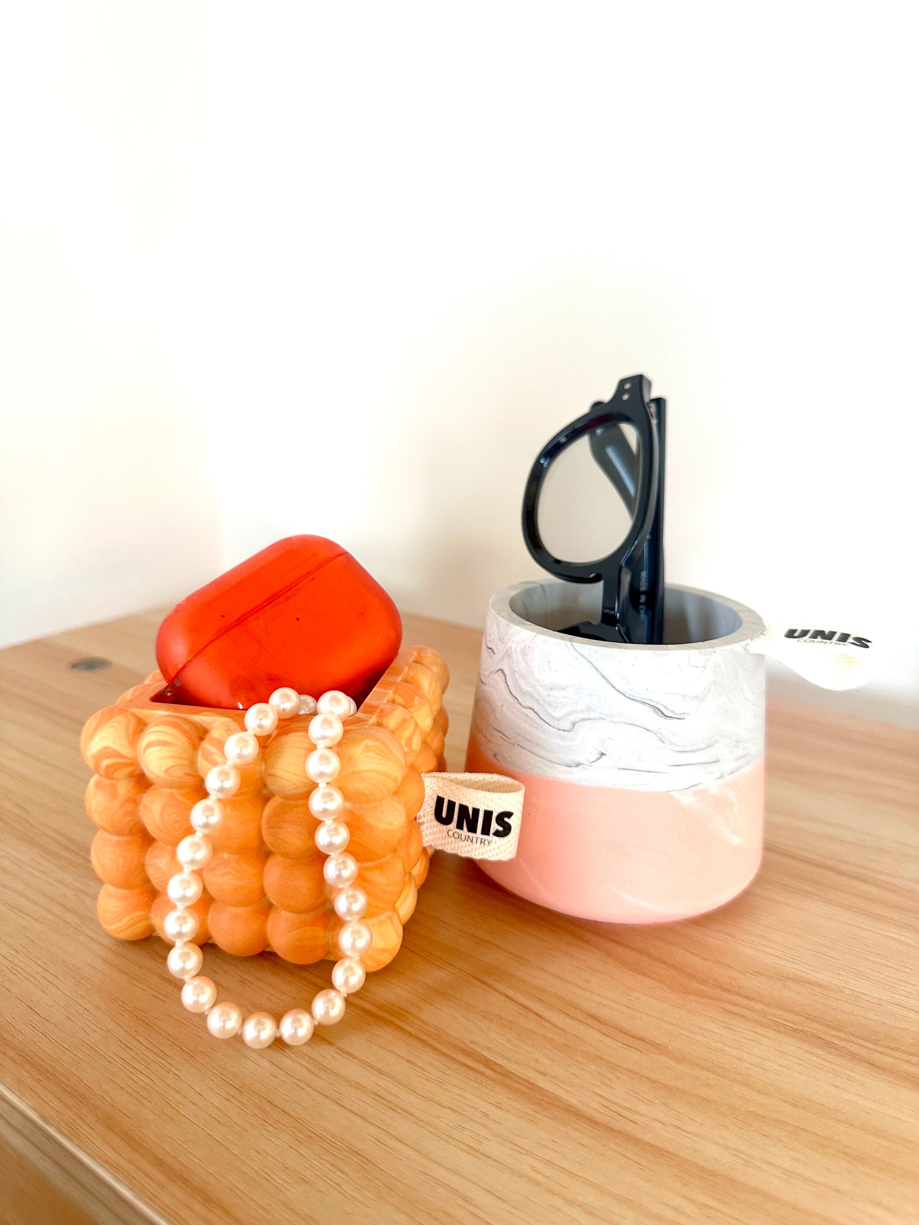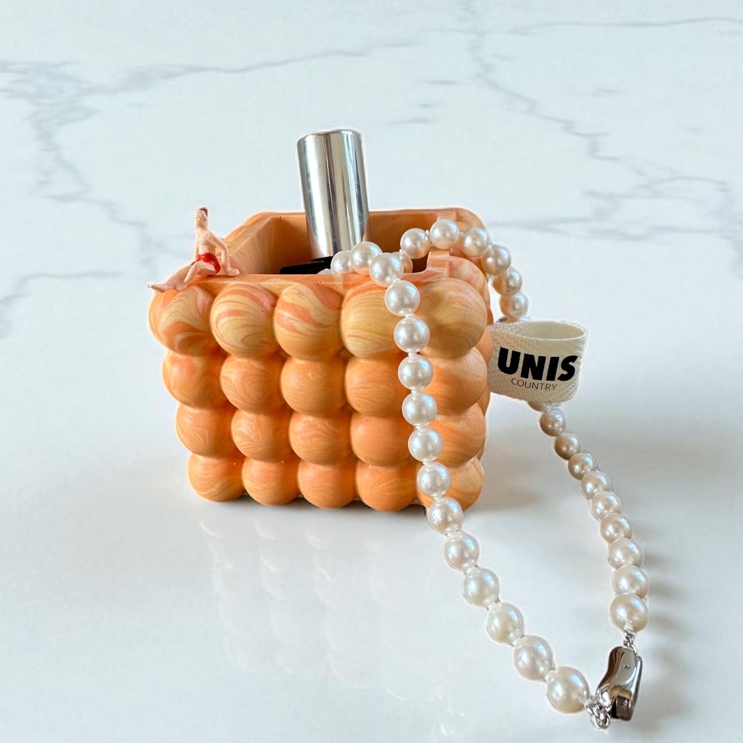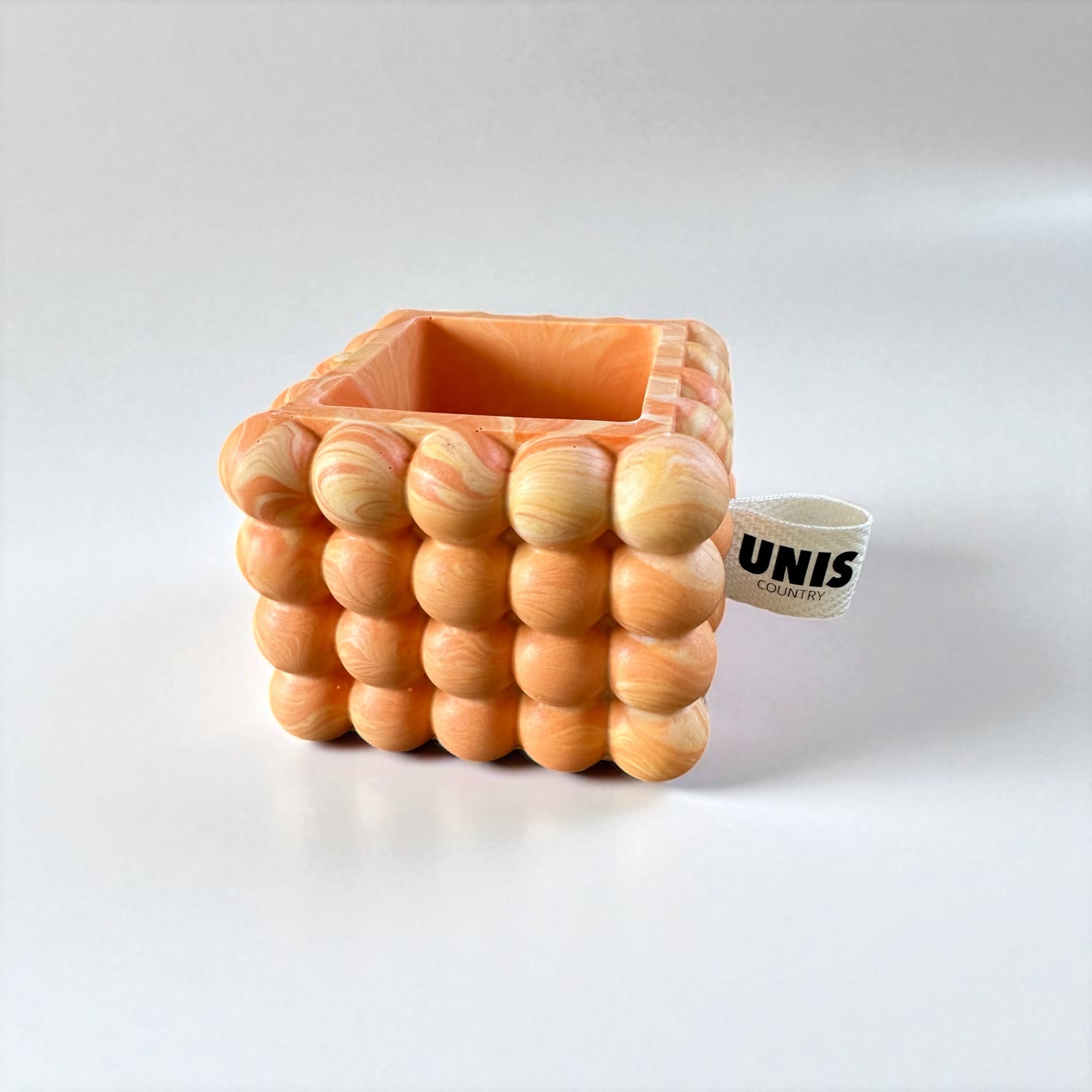 明るく弾けるようなオレンジマーブルカラーと、目を惹くポコポコフォルムが印象的。