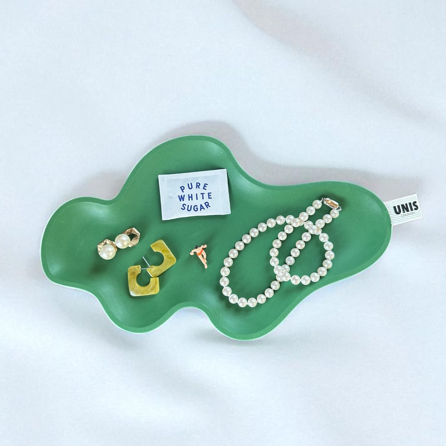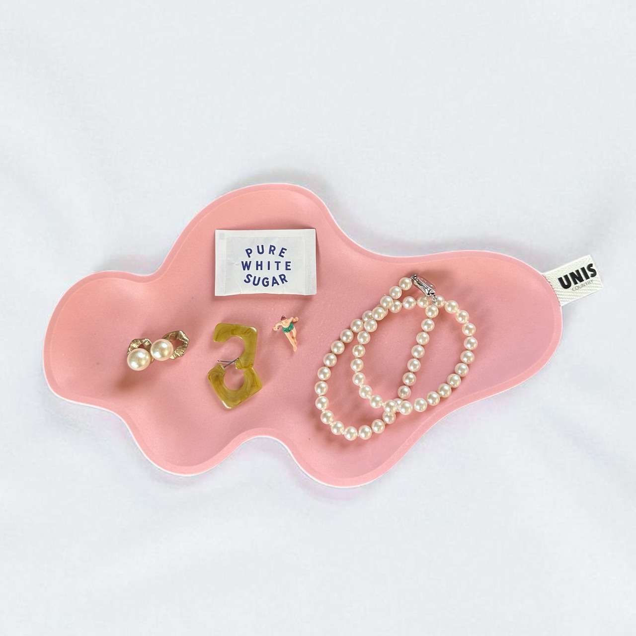 個性的なフォルムが目を惹く、ペールピンクのアクセサリートレイ。