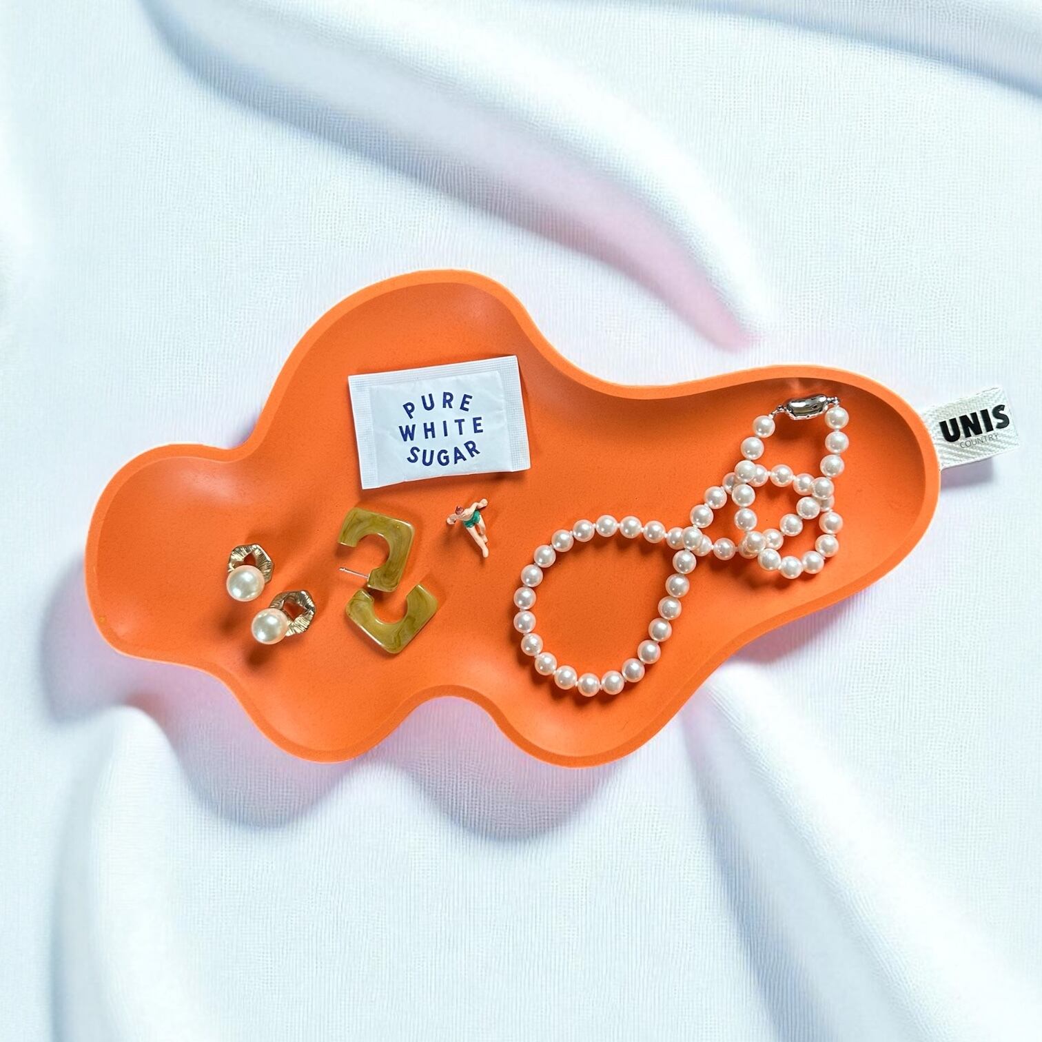 個性的なフォルムが目を惹く、サーモンピンクのアクセサリートレイ。