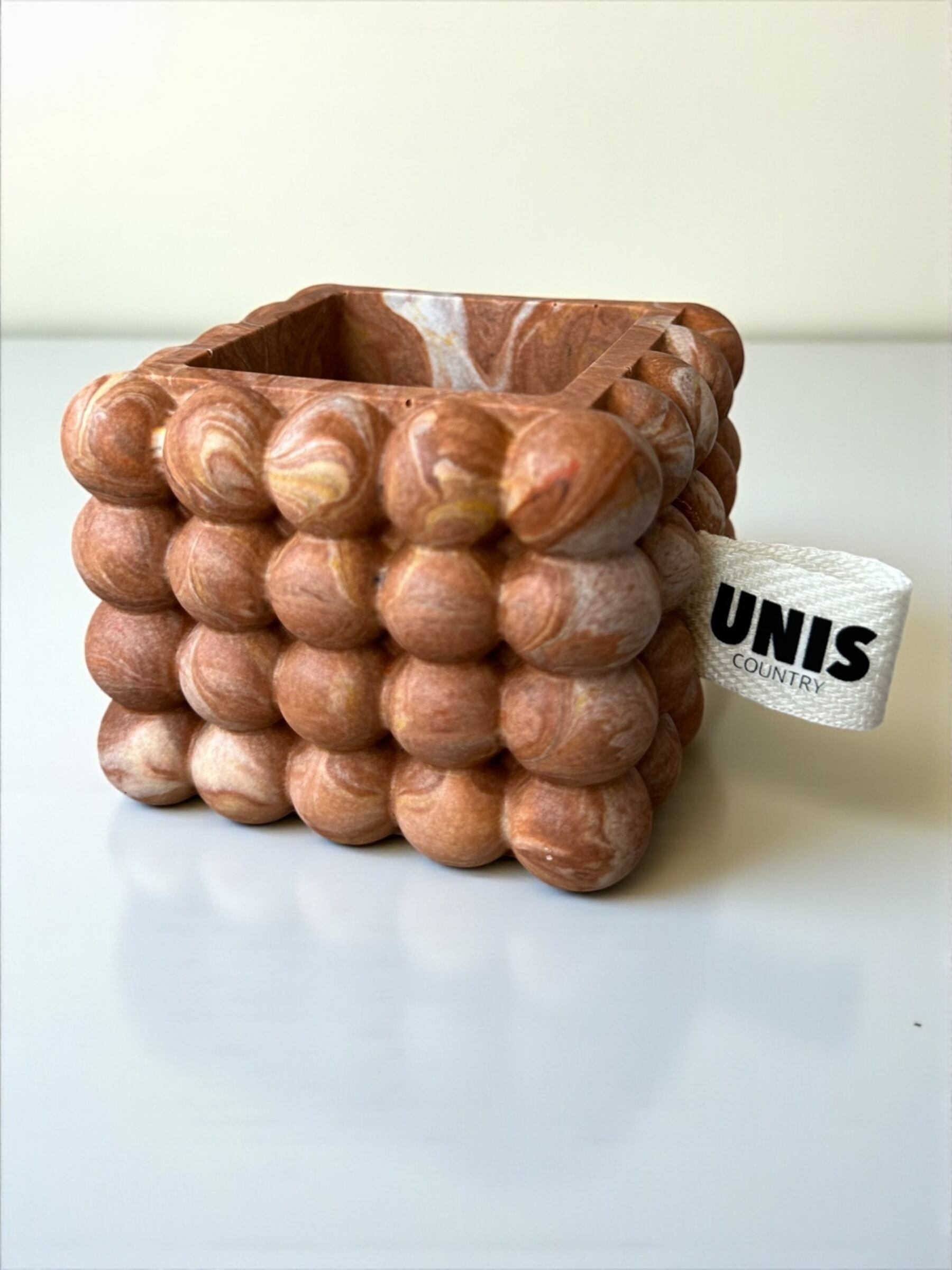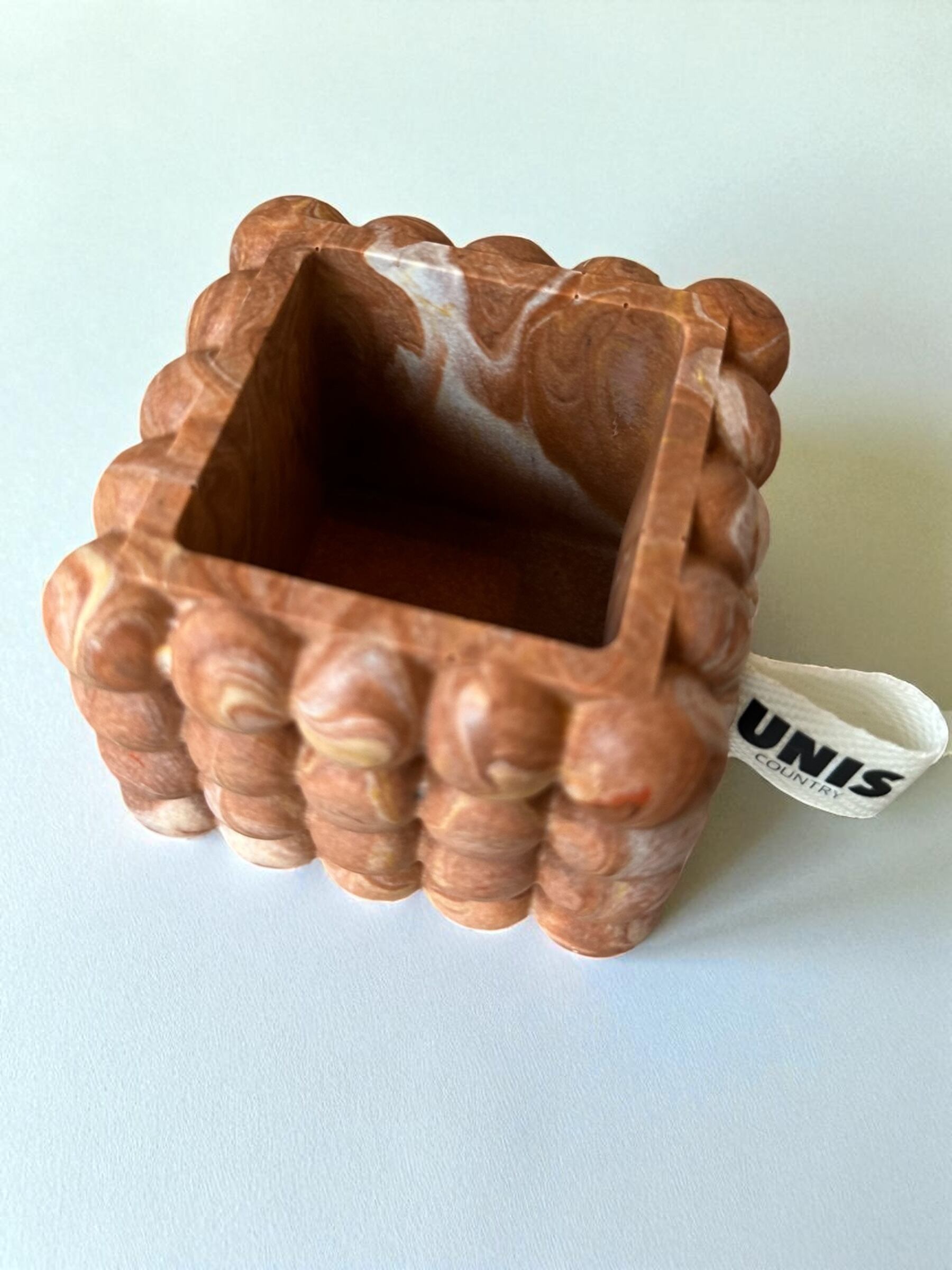 ブラウンのマーブルカラーと、目を惹くポコポコフォルムが印象的。