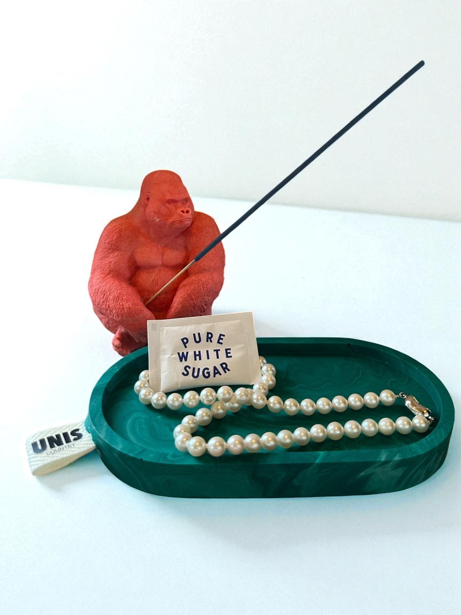 シックなグリーンのマーブル模様が映えるトレイに、ピンクのゴリラを添えた遊び心あふれるデザインです。