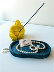 シックなブルーのマーブル模様が映えるトレイに、イエローのゴリラを添えた遊び心あふれるデザインです。