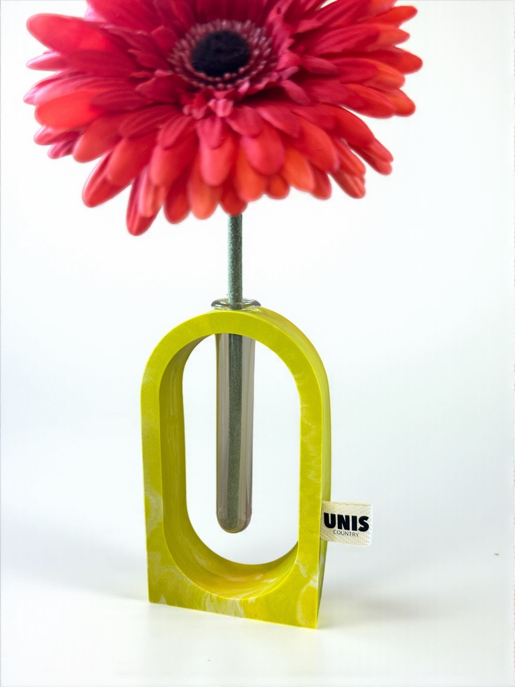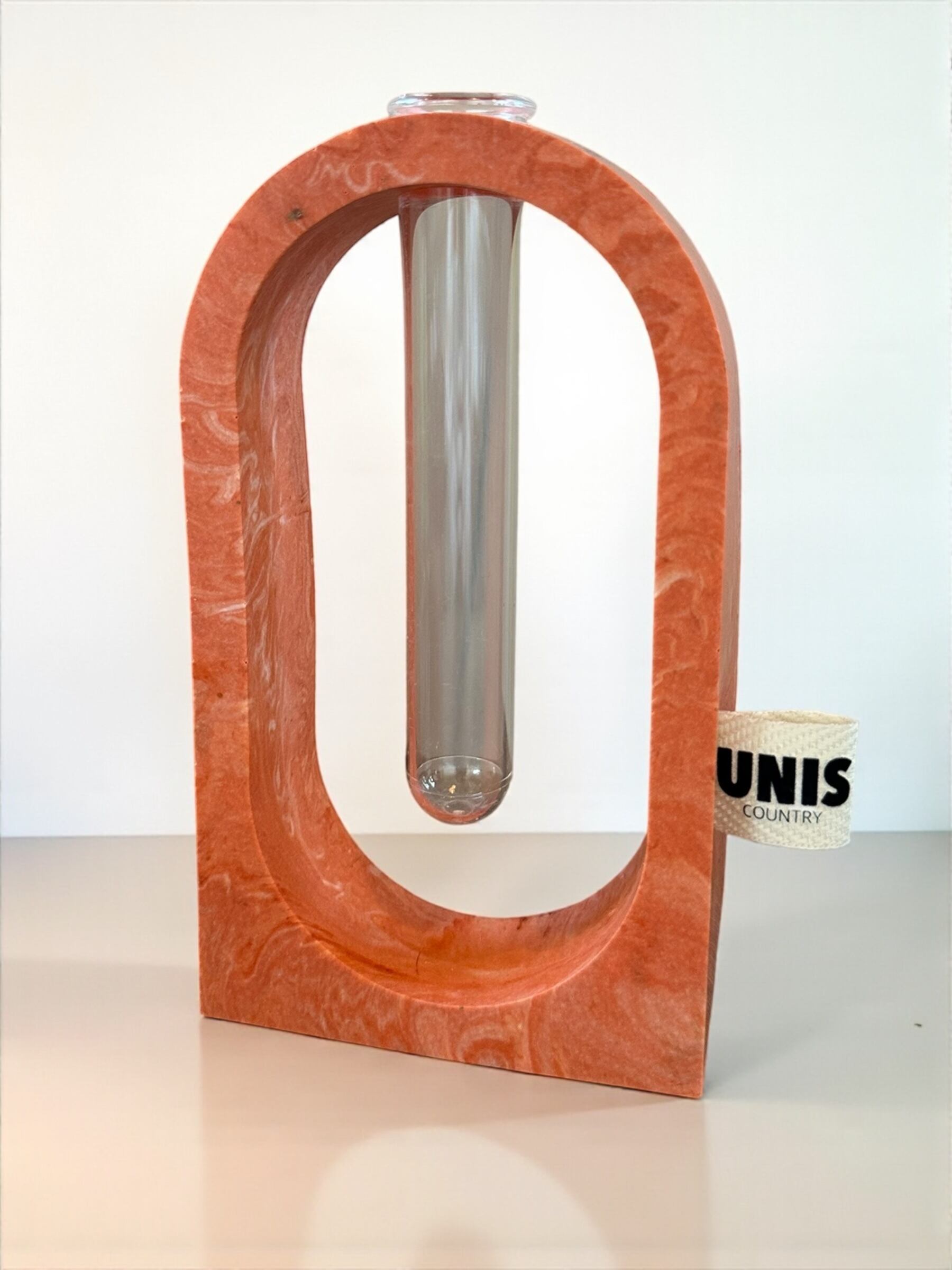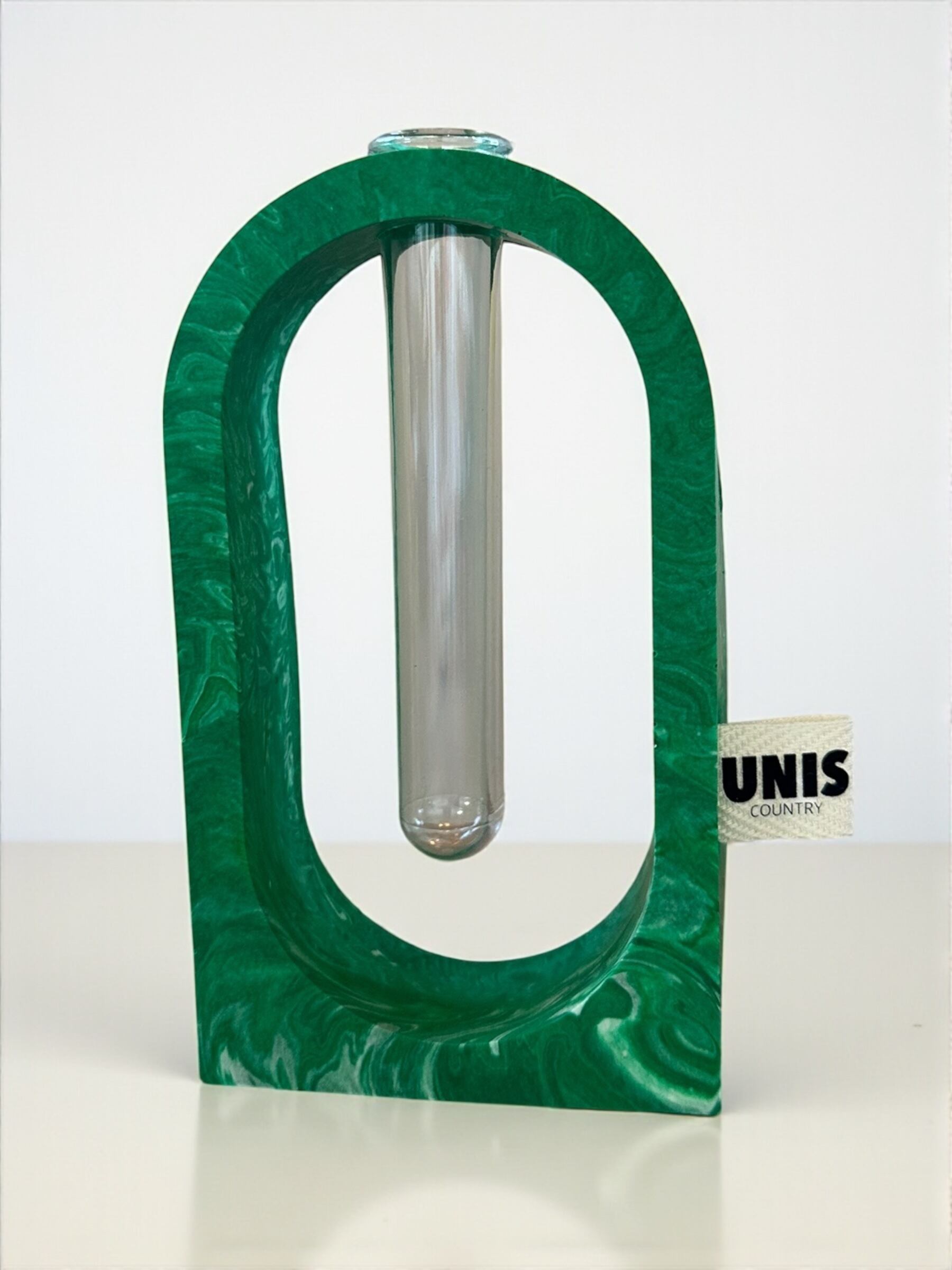 ジェスモナイトでひとつひとつ丁寧に作った本体に、試験管をゆらゆらっと通した、遊び心のあるフラワーベースです。