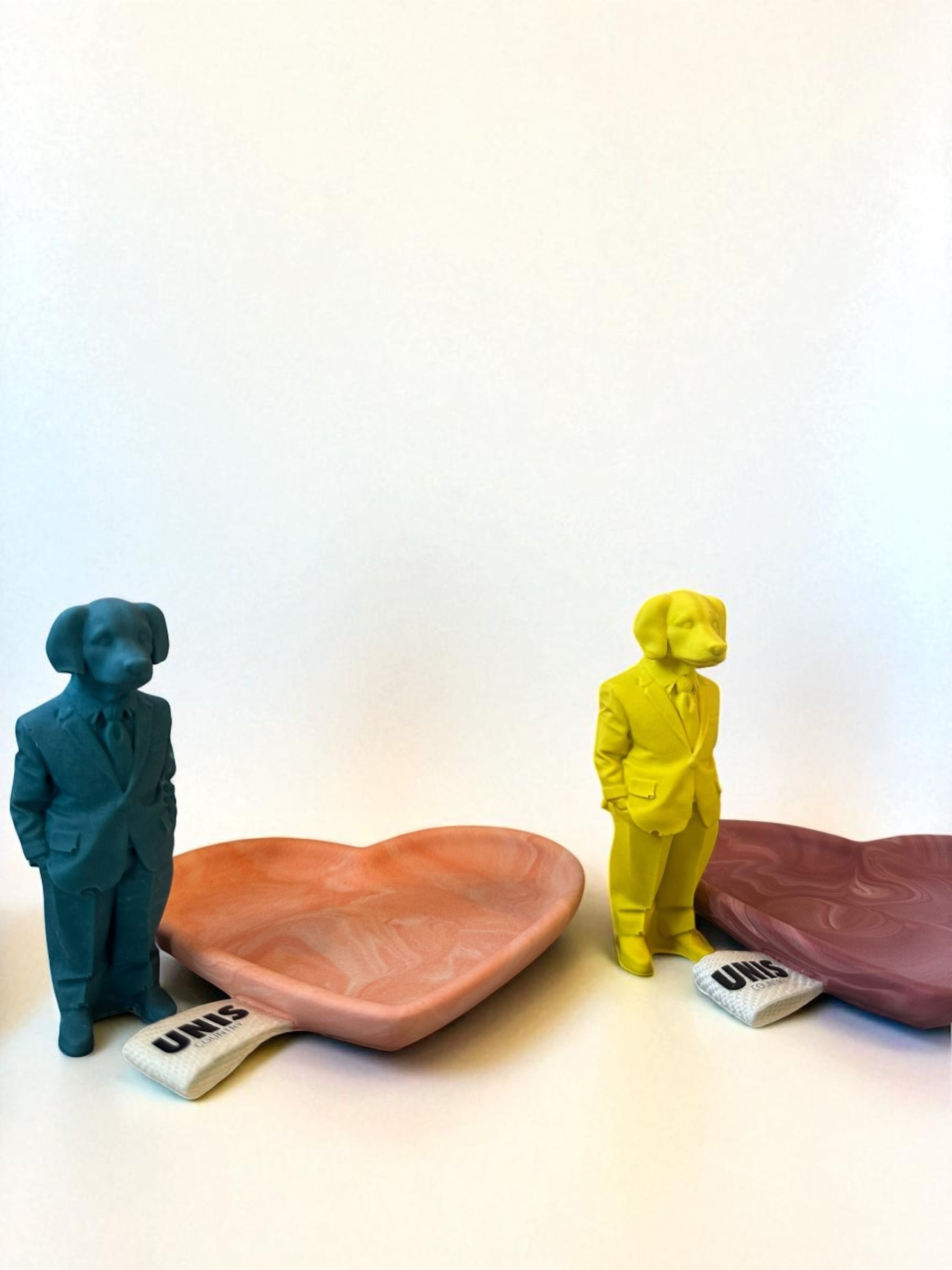 マーブル模様が映えるハートトレイに、スーツ犬を添えた遊び心あふれるデザインです。