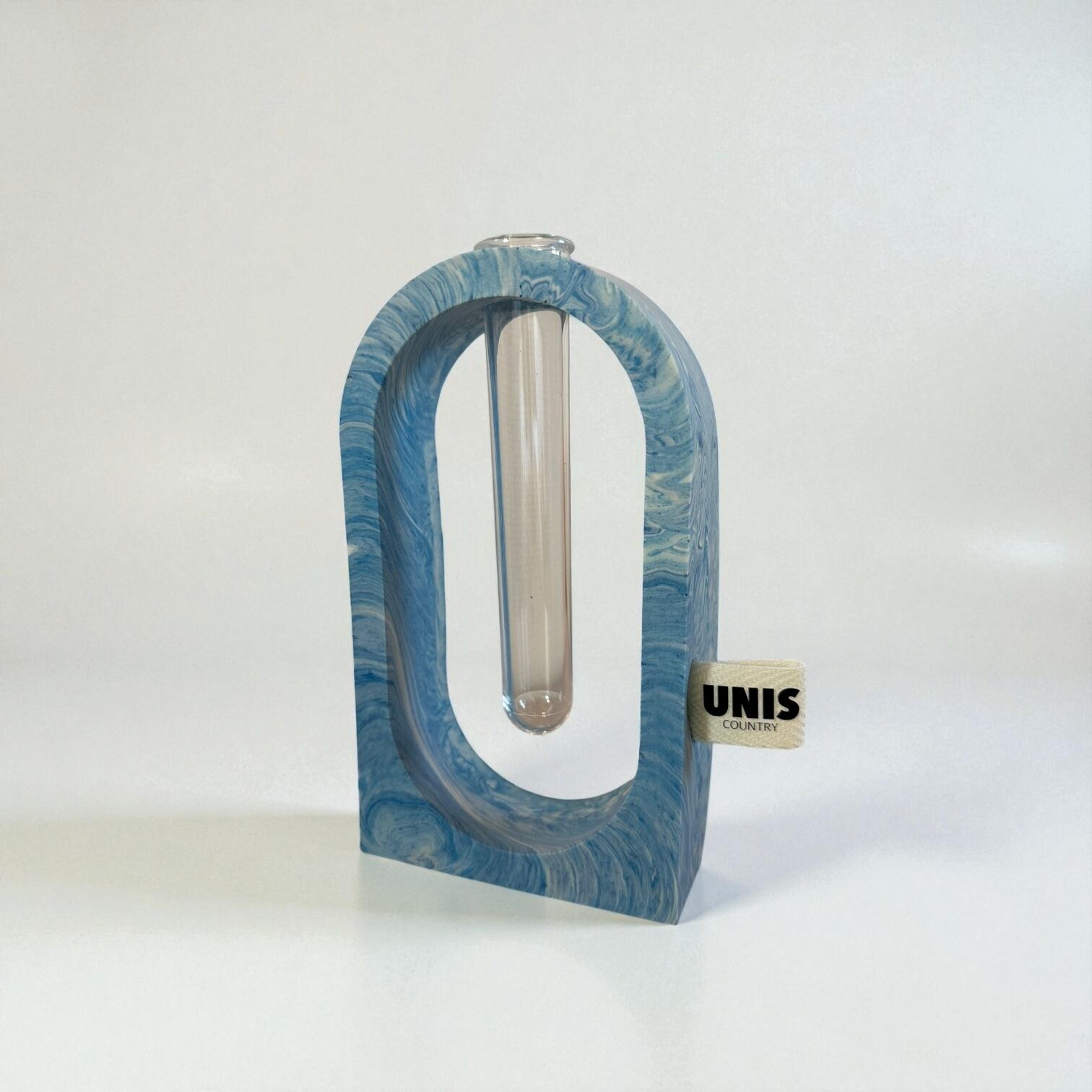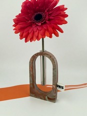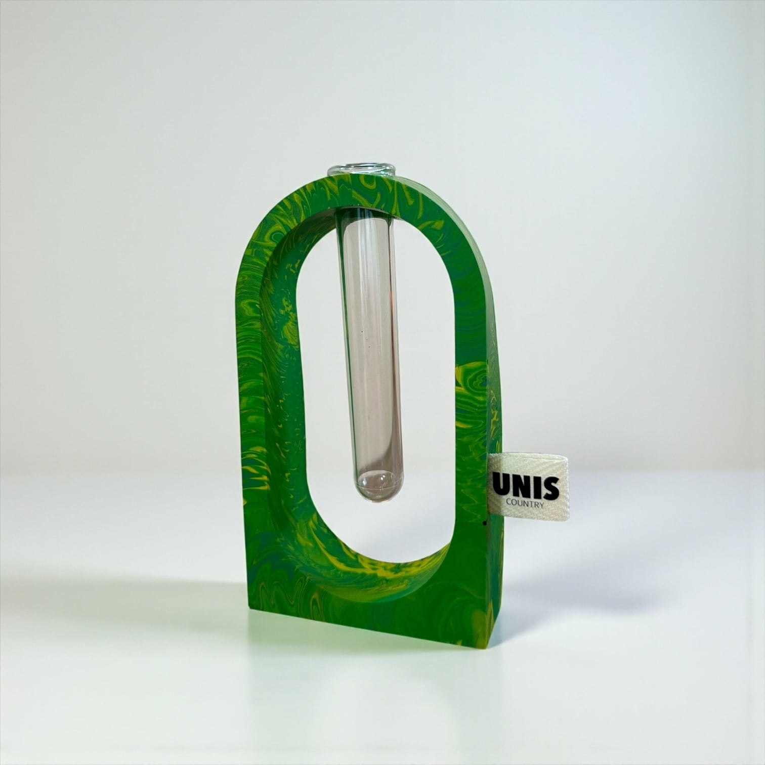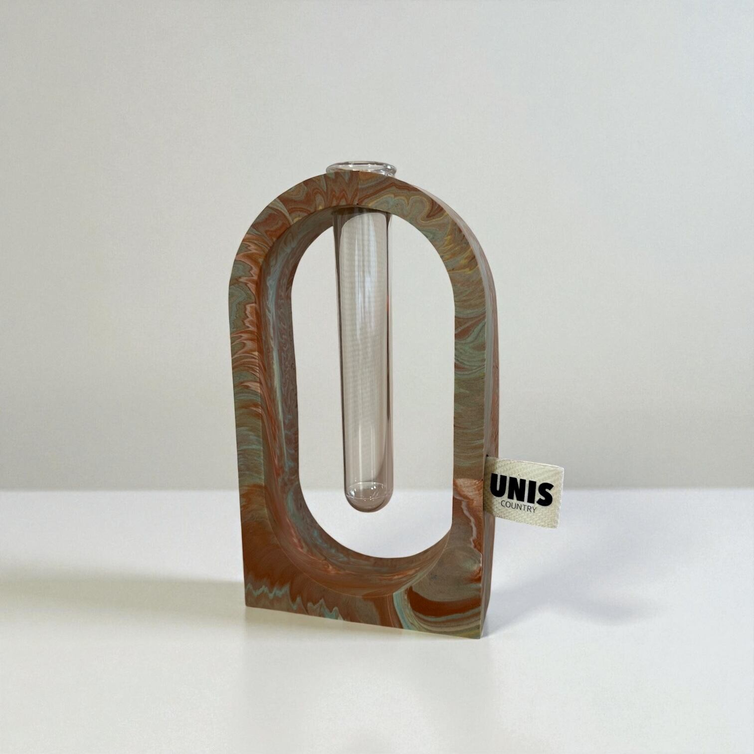ジェスモナイトでひとつひとつ丁寧に作った本体に、試験管をゆらゆらっと通した、遊び心のあるフラワーベースです。