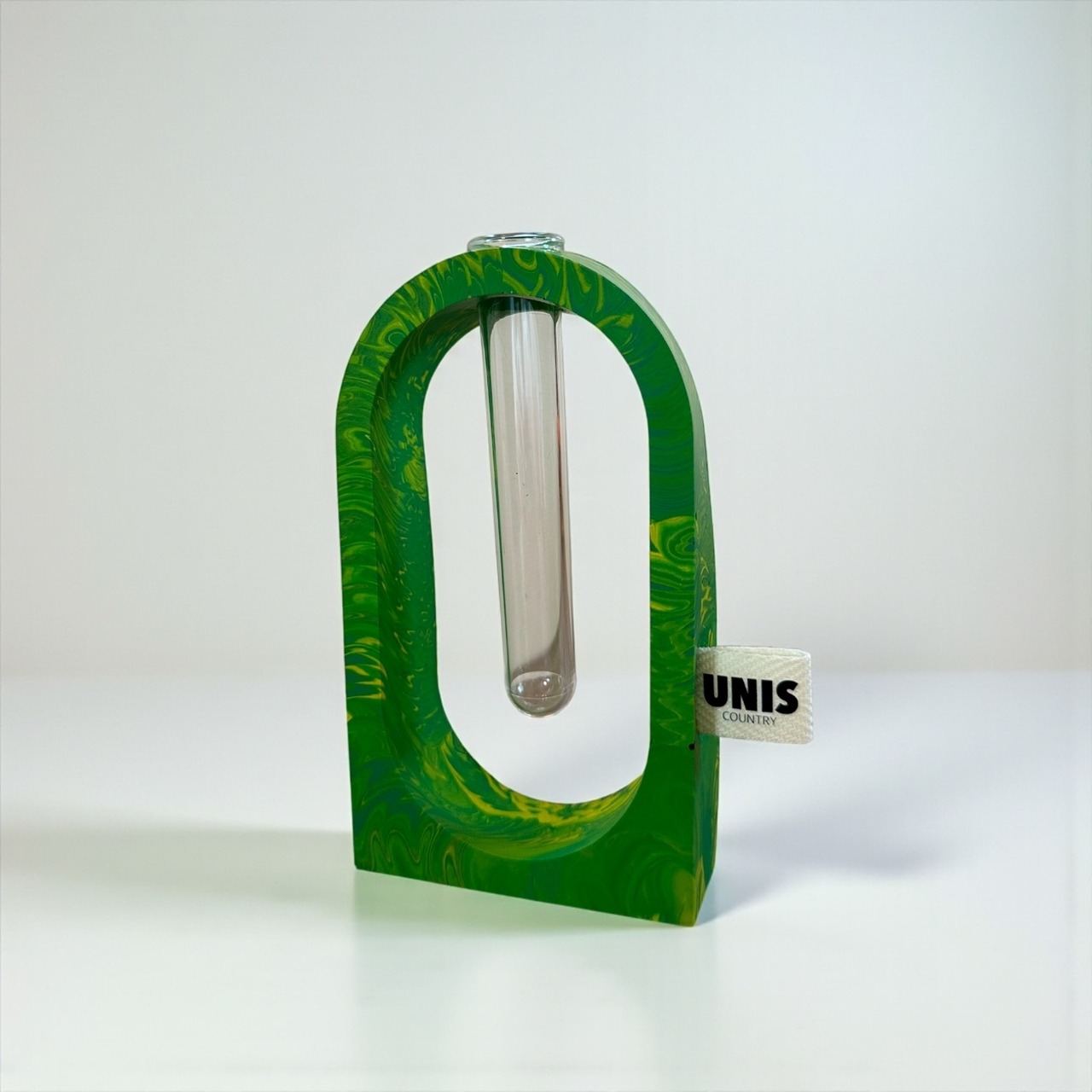 ジェスモナイトでひとつひとつ丁寧に作った本体に、試験管をゆらゆらっと通した、遊び心のあるフラワーベースです。