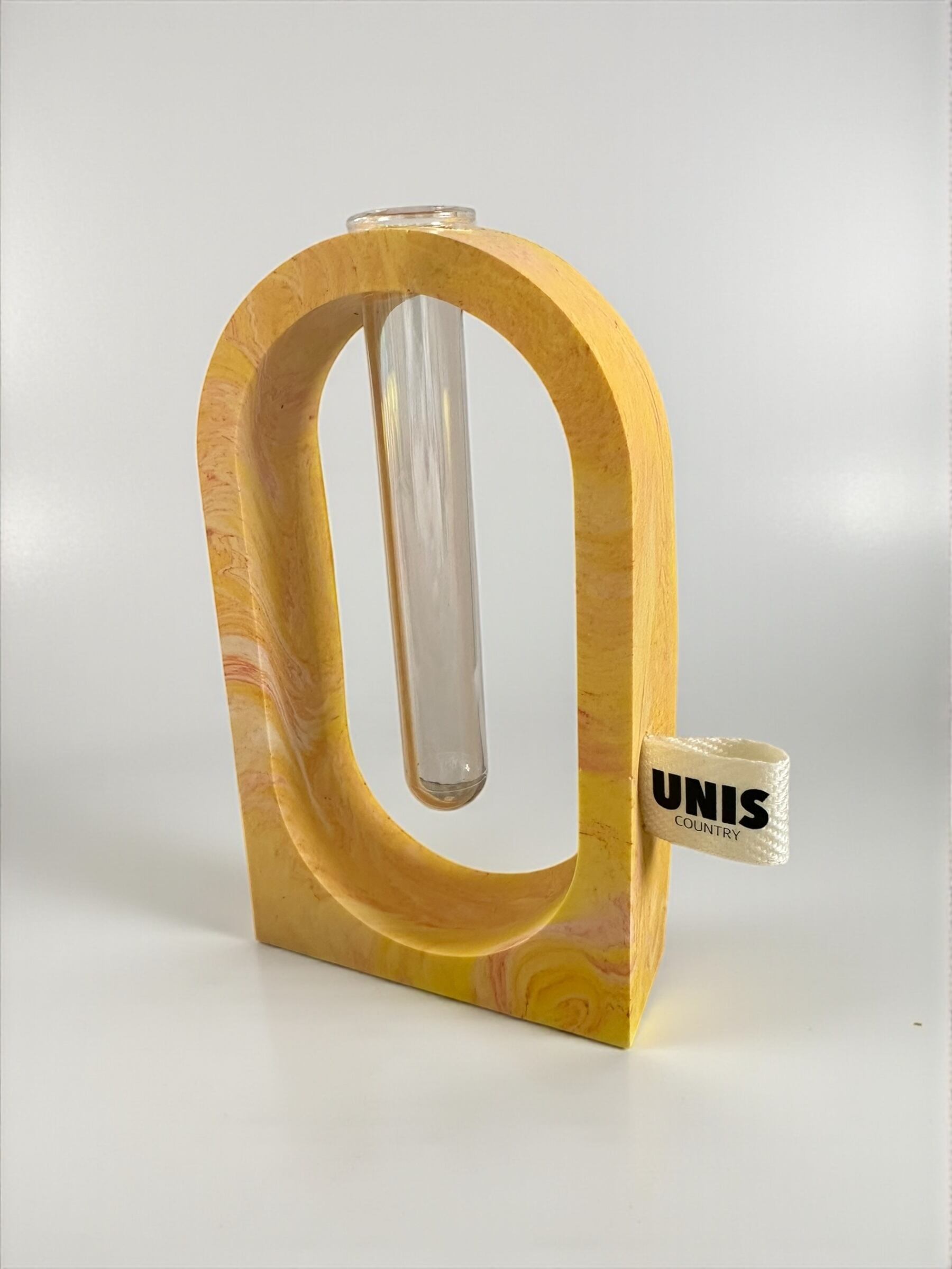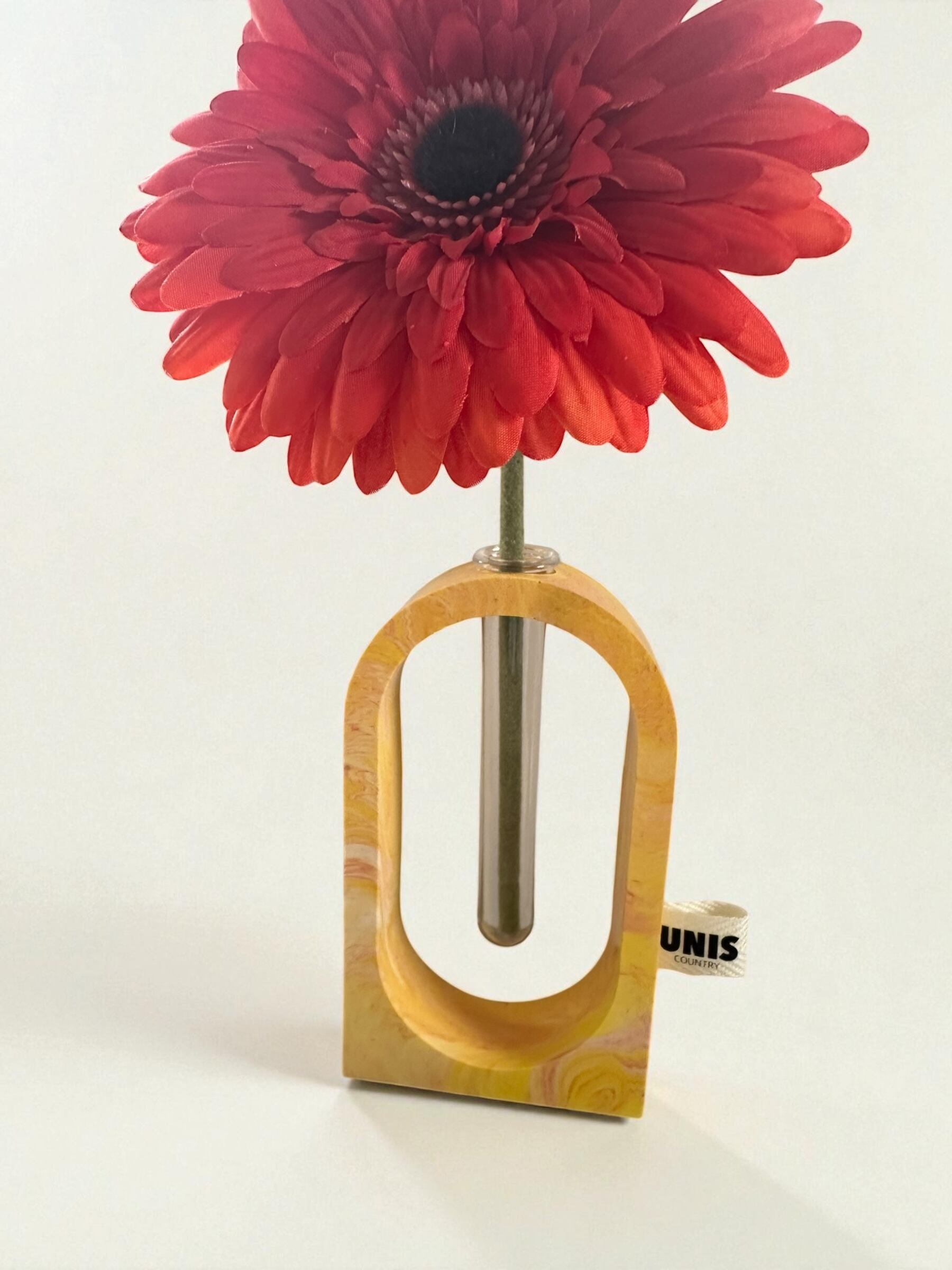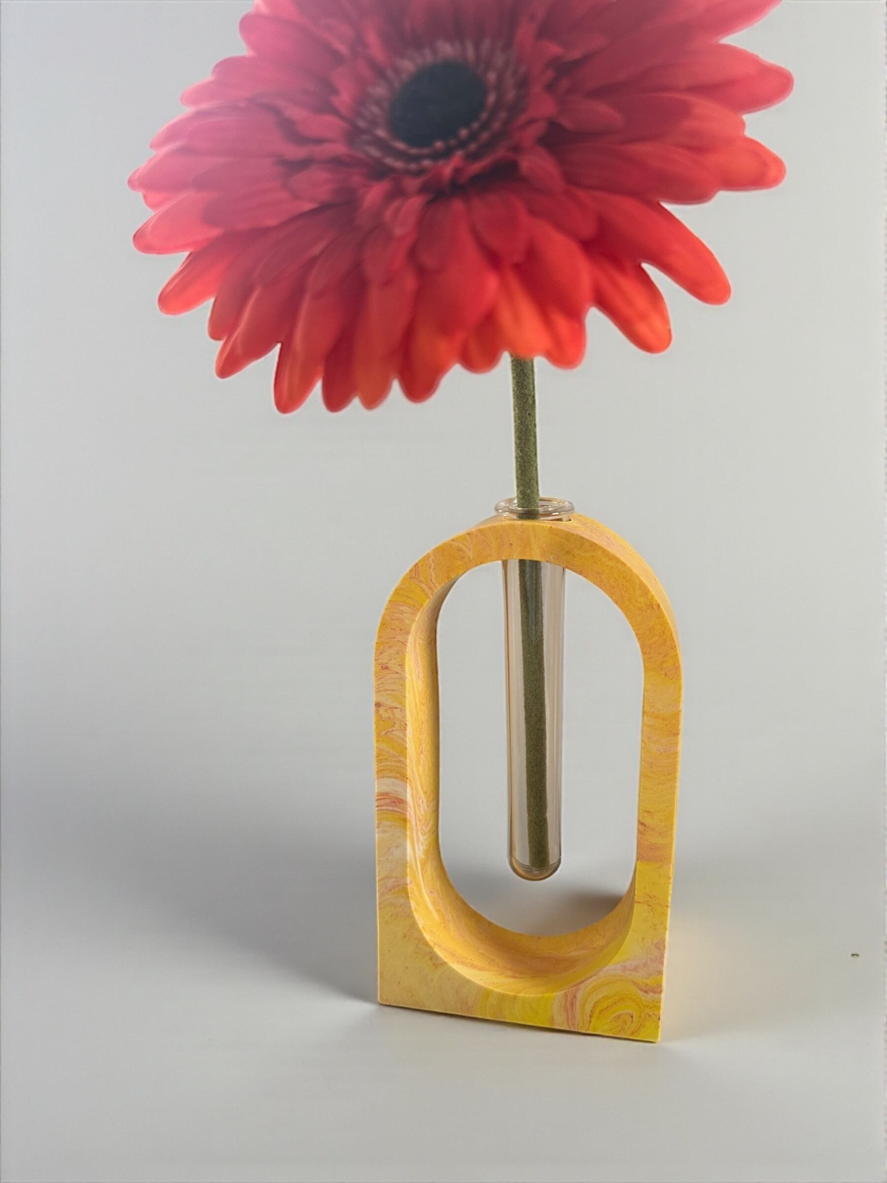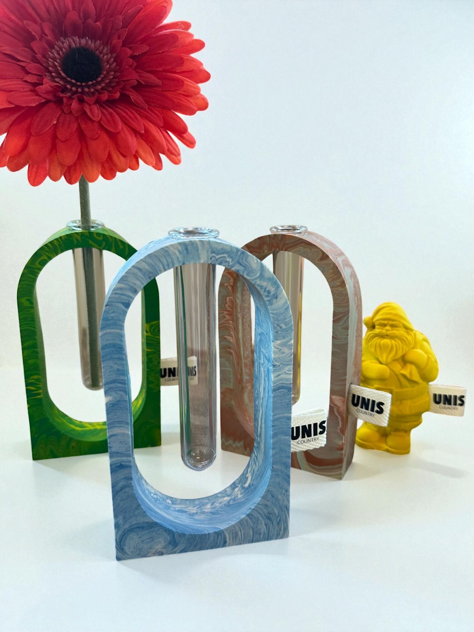 ジェスモナイトでひとつひとつ丁寧に作った本体に、試験管をゆらゆらっと通した、遊び心のあるフラワーベースです。