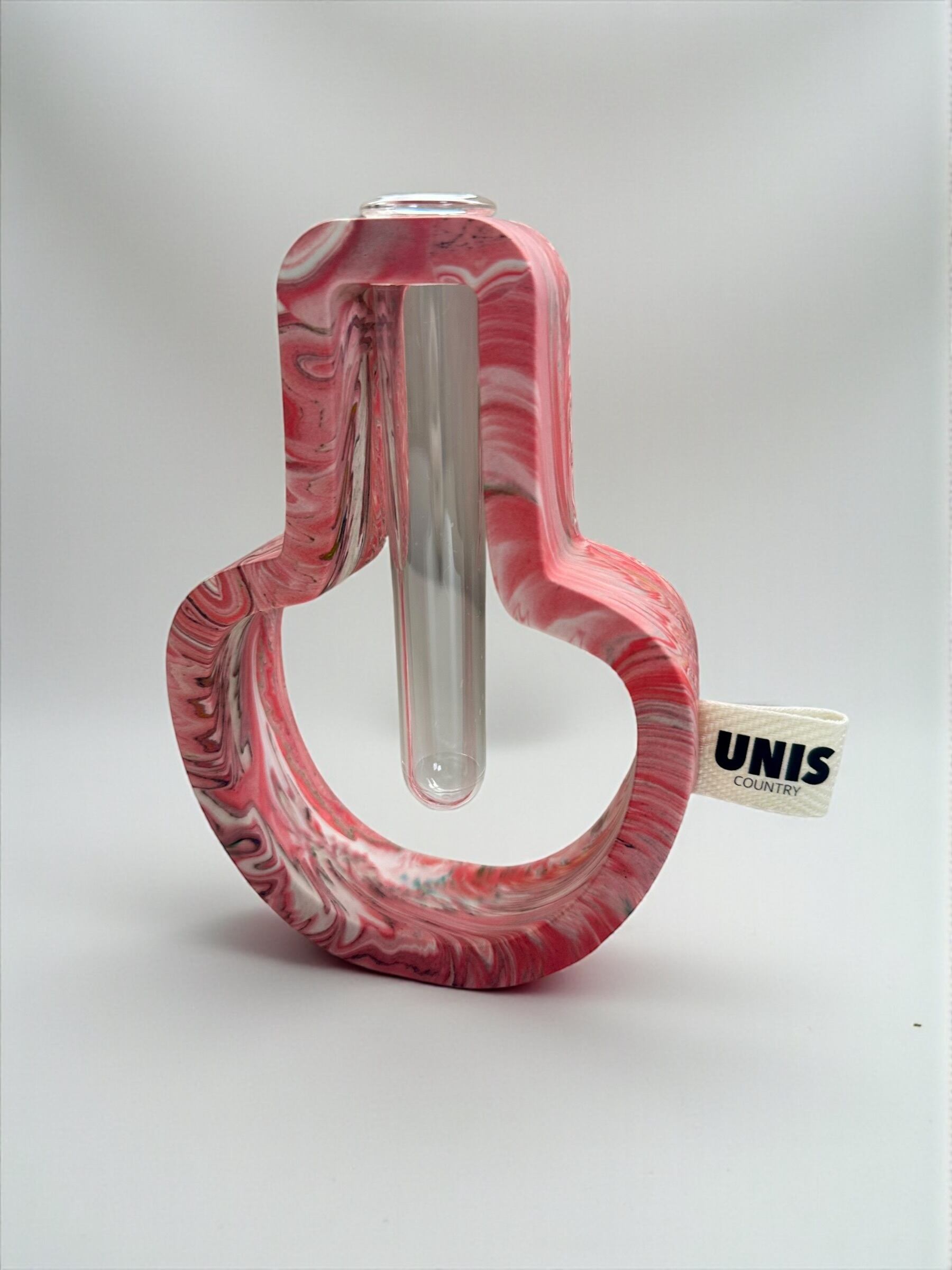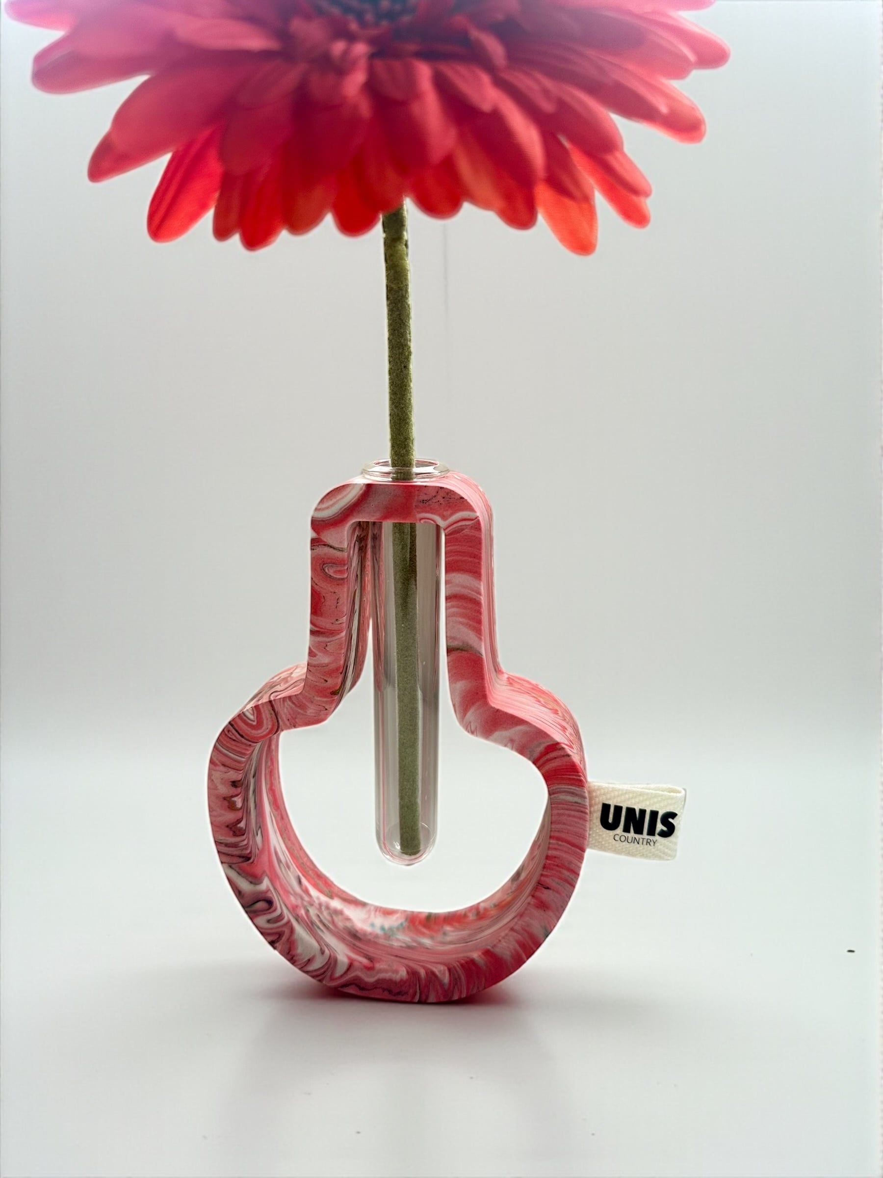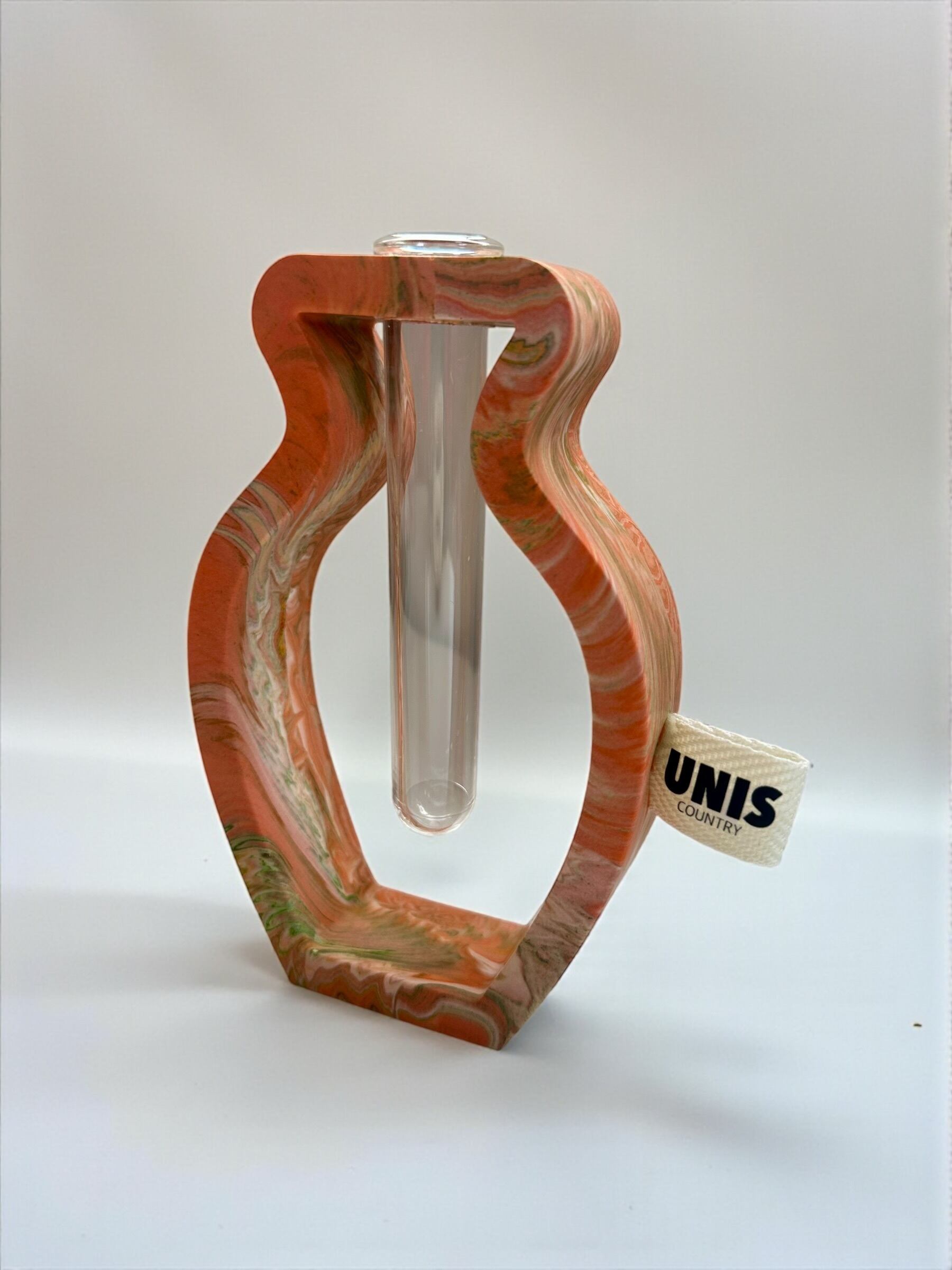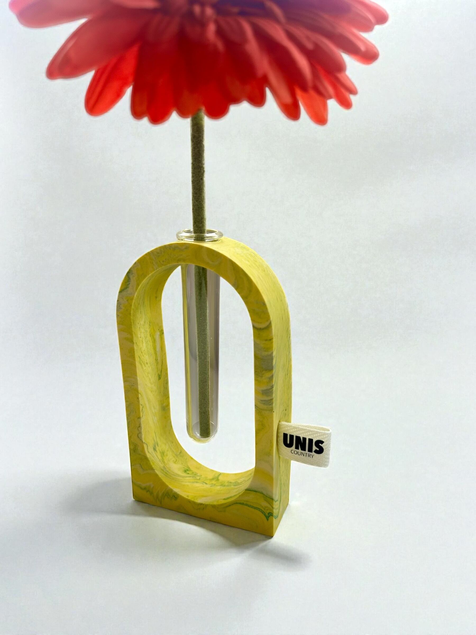 ジェスモナイトでひとつひとつ丁寧に作った本体に、試験管をゆらゆらっと通した、遊び心のあるフラワーベースです。