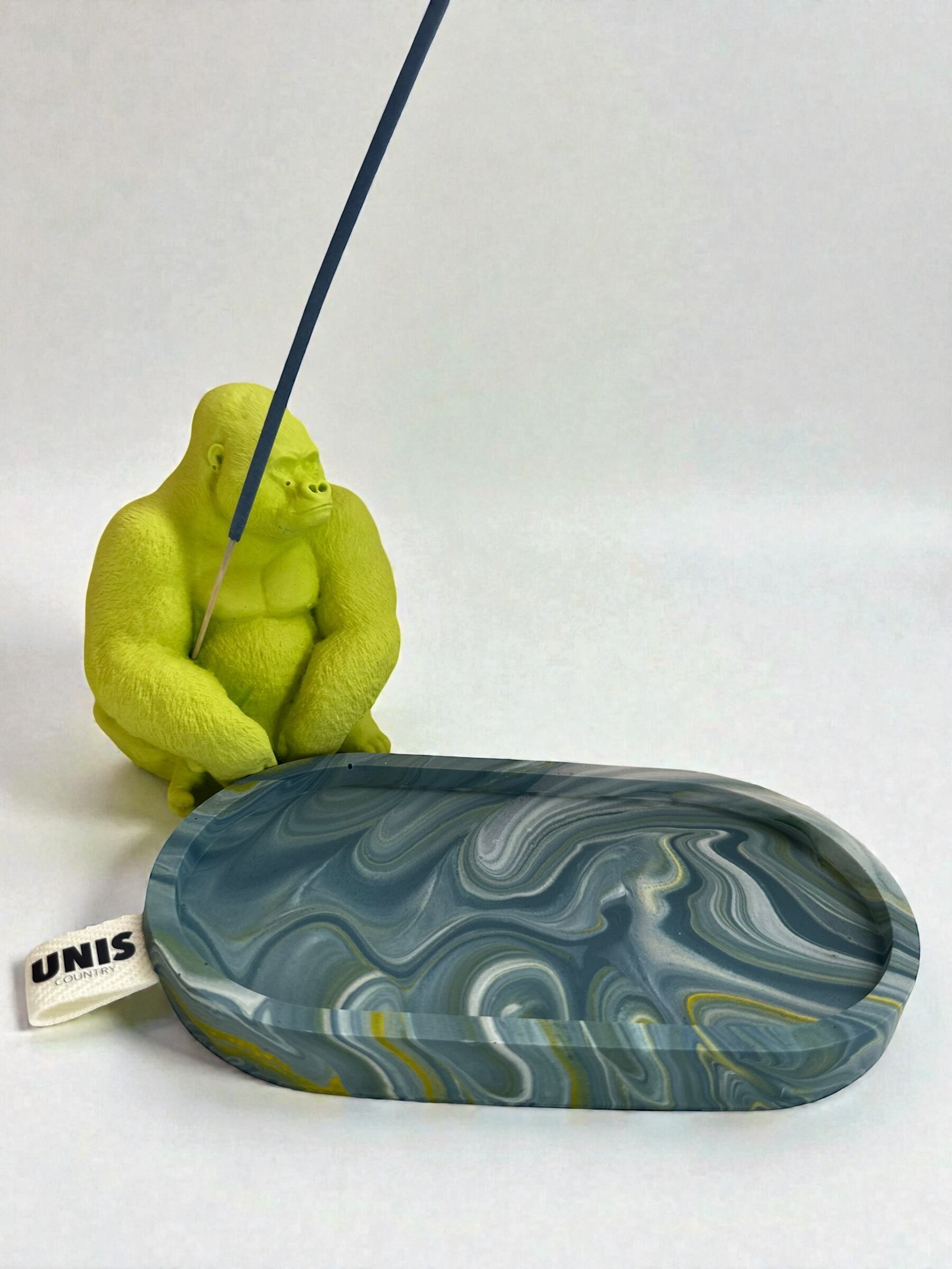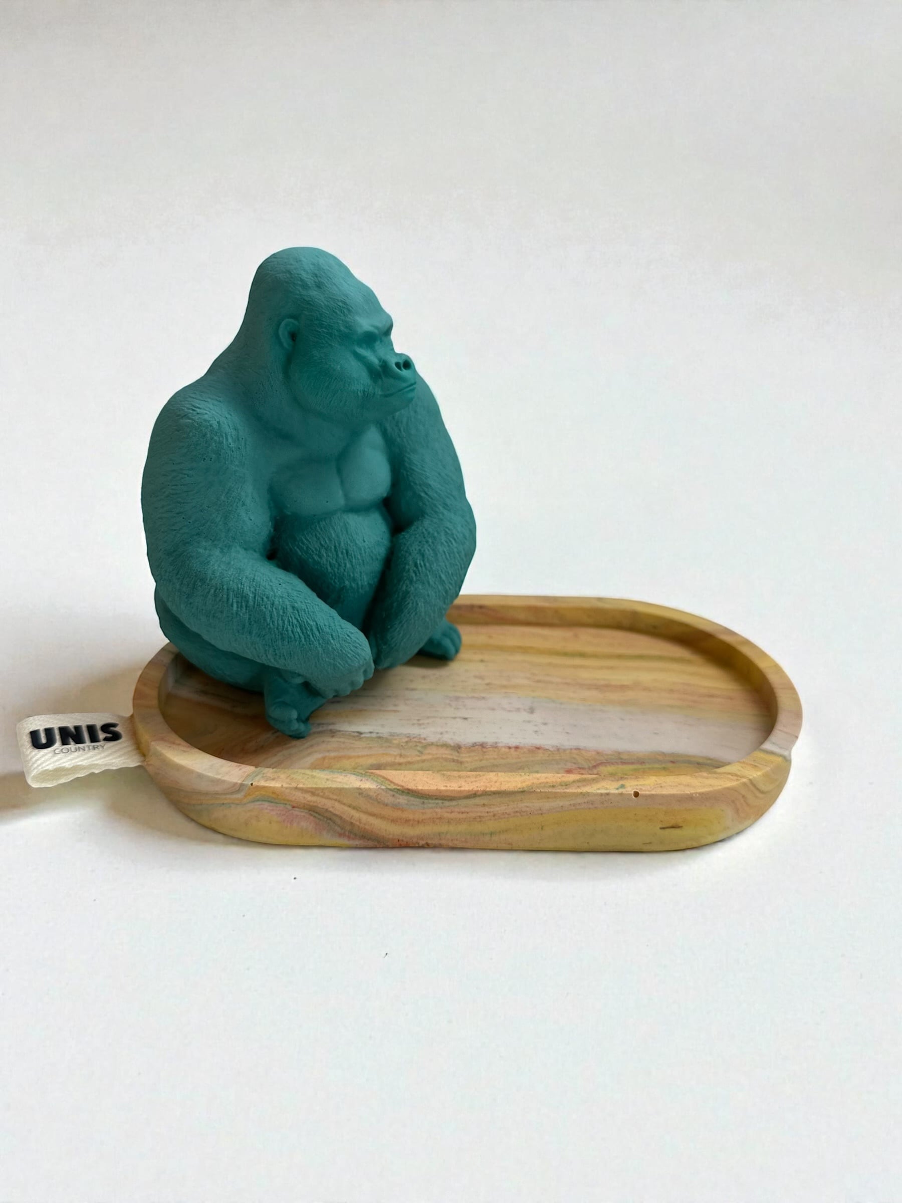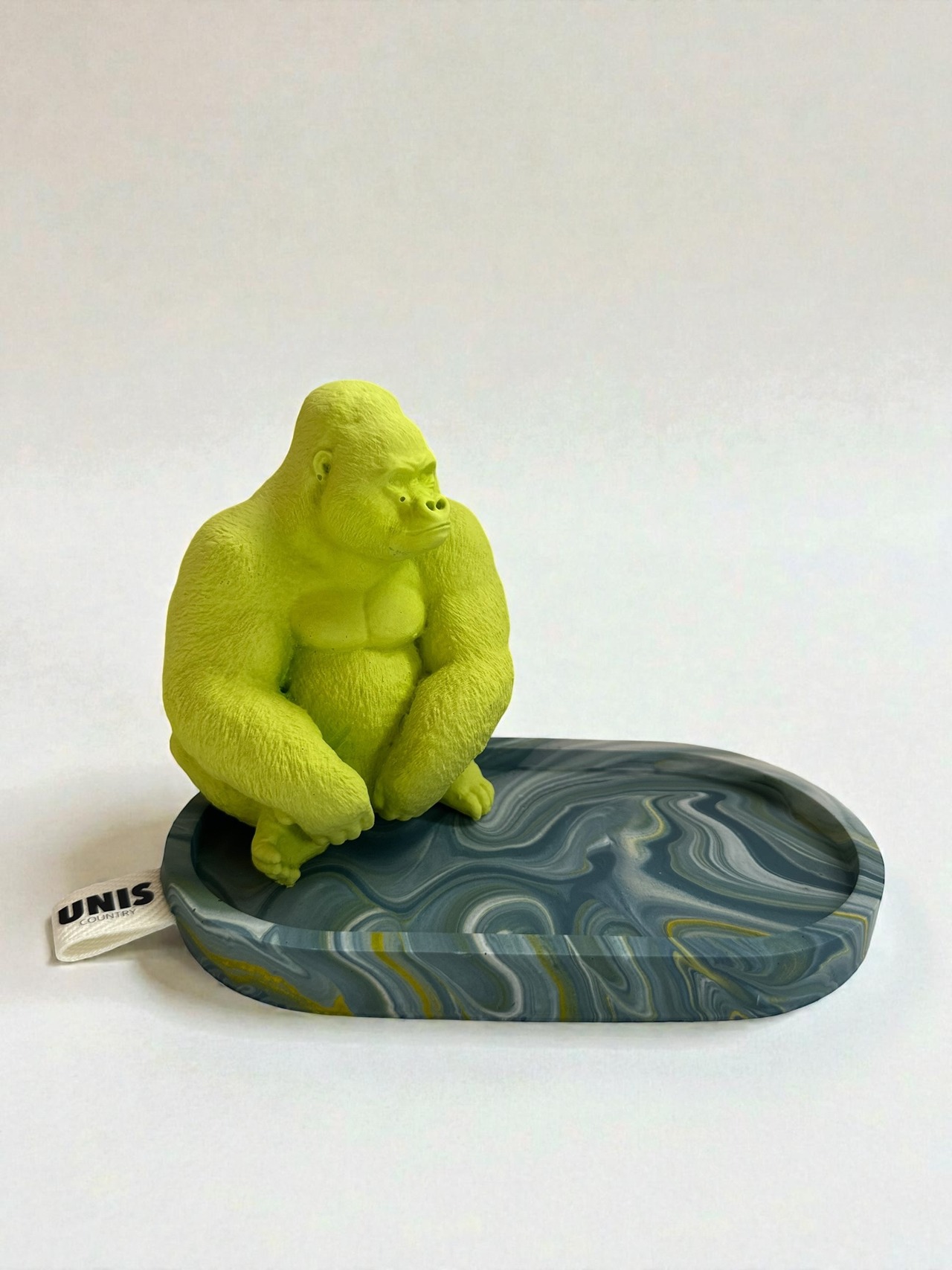 マーブル模様が映えるトレイに、ゴリラを添えた遊び心あふれるデザインです。