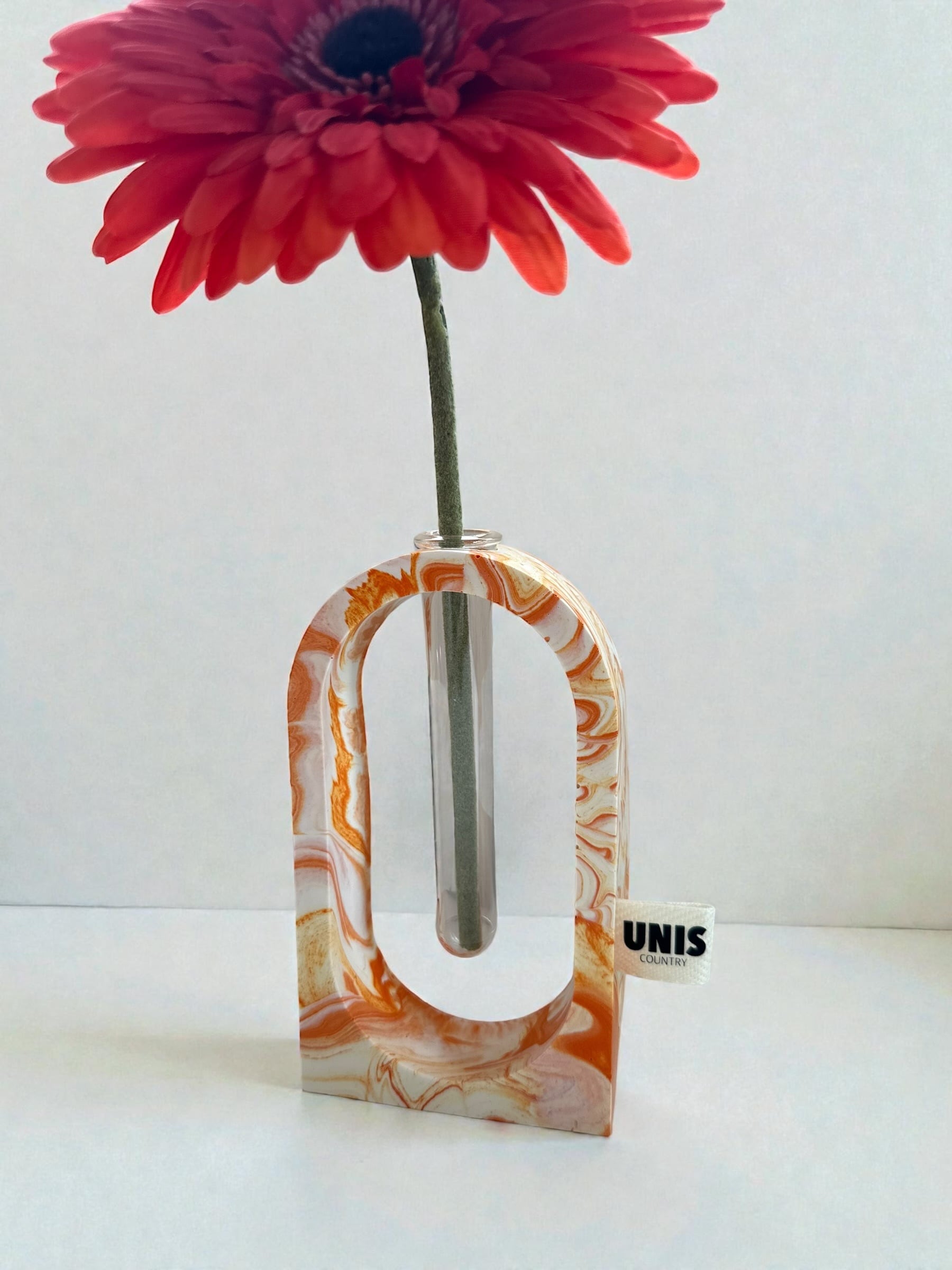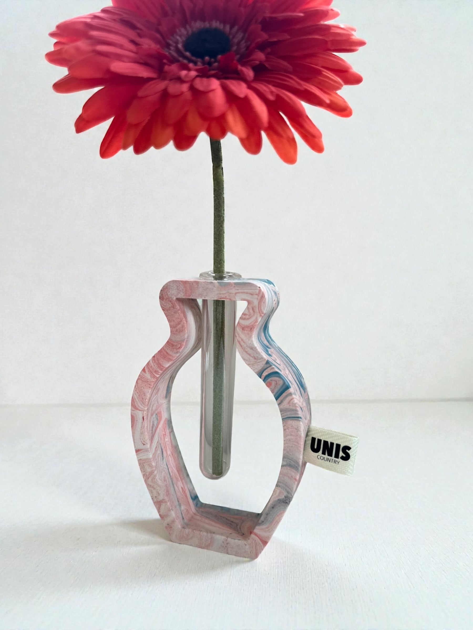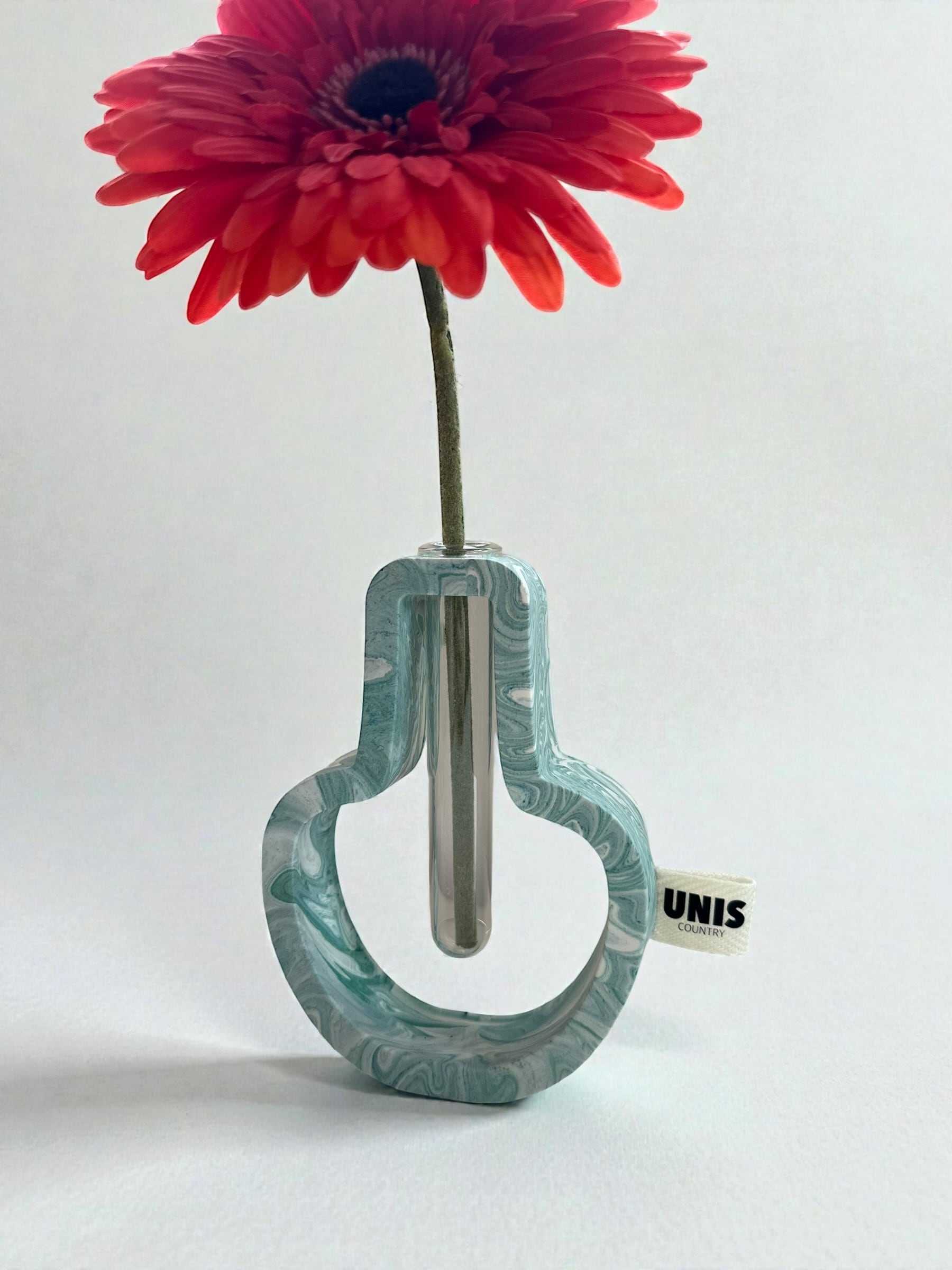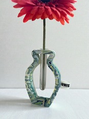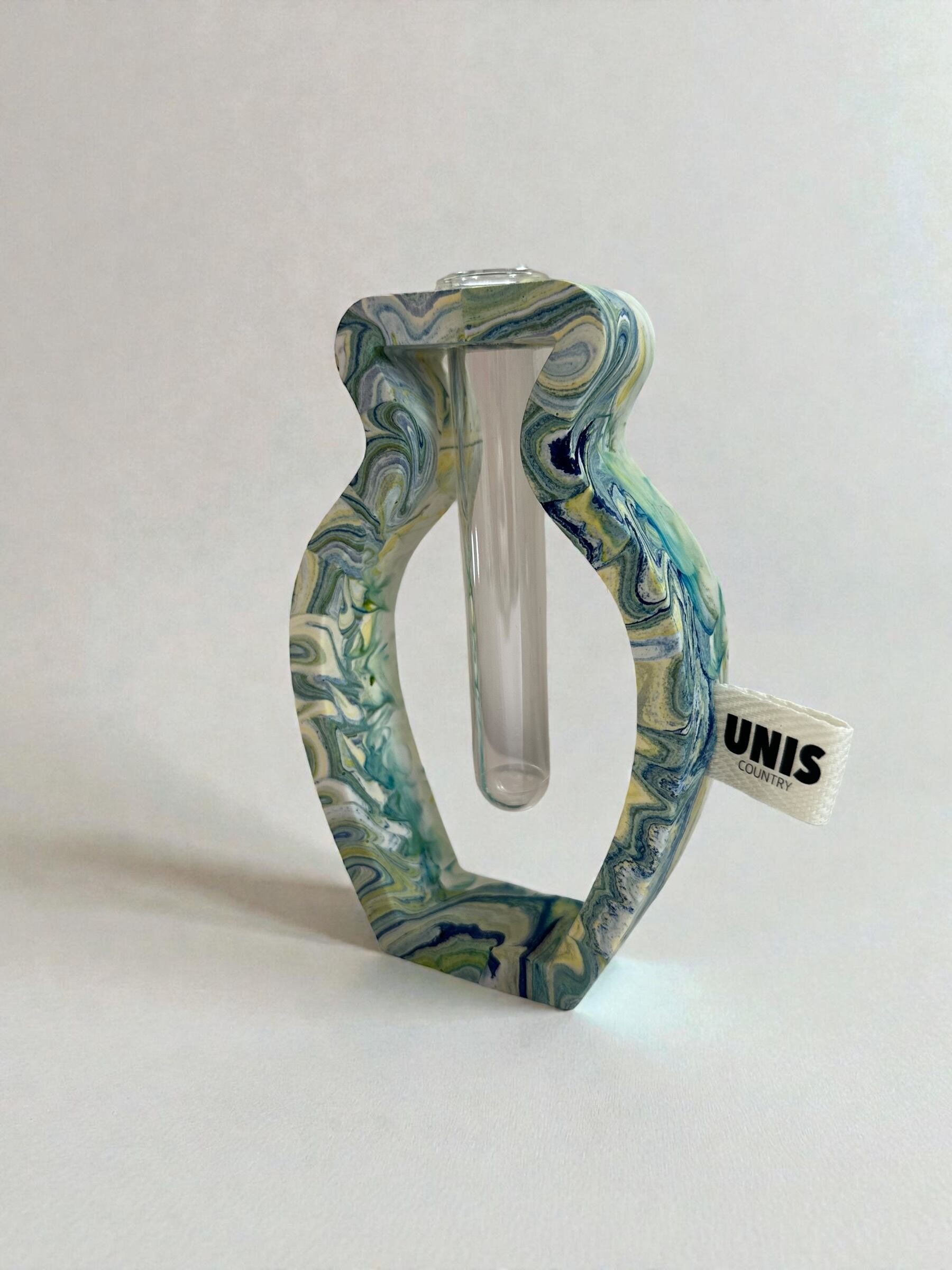 ジェスモナイトでひとつひとつ丁寧に作った本体に、試験管をゆらゆらっと通した、遊び心のあるフラワーベースです。