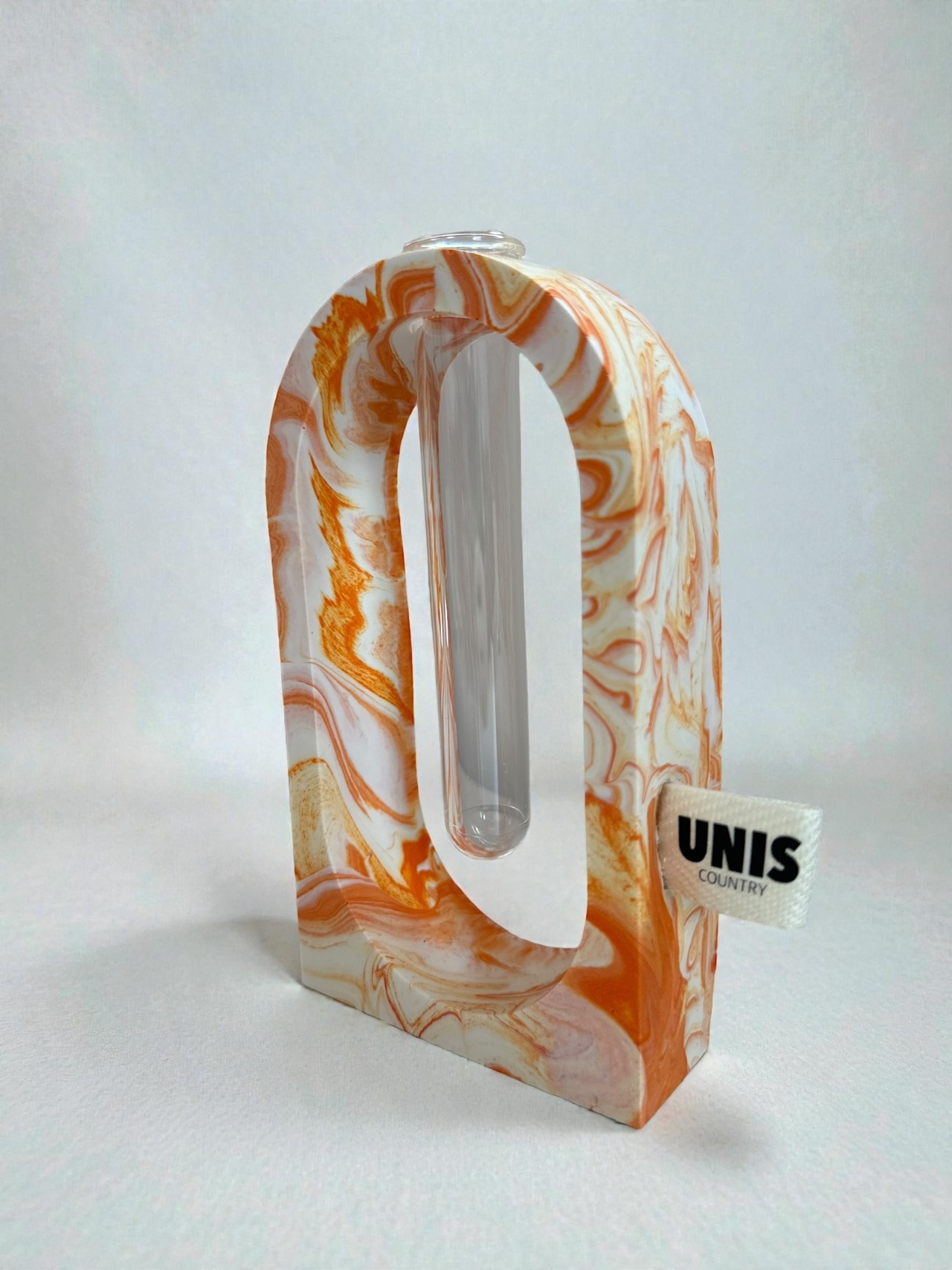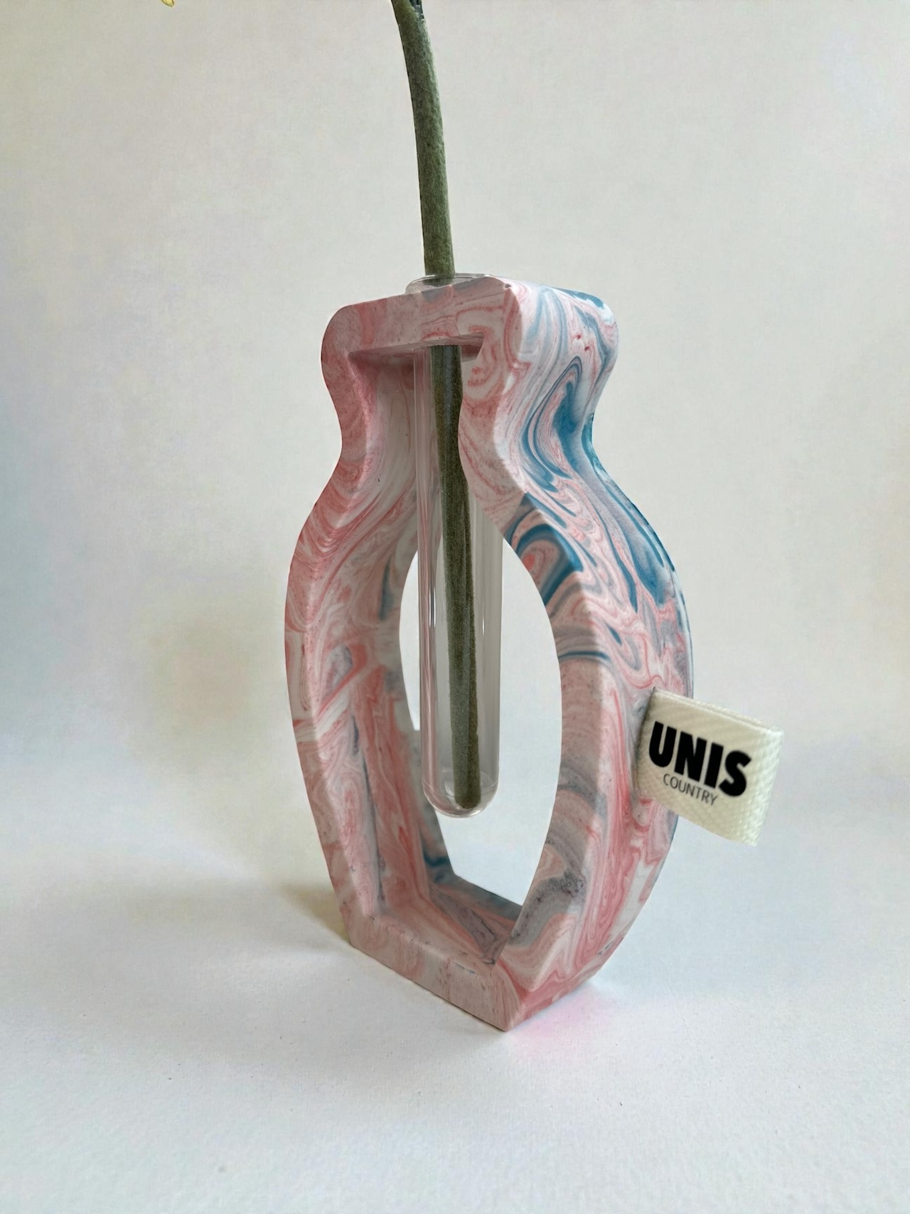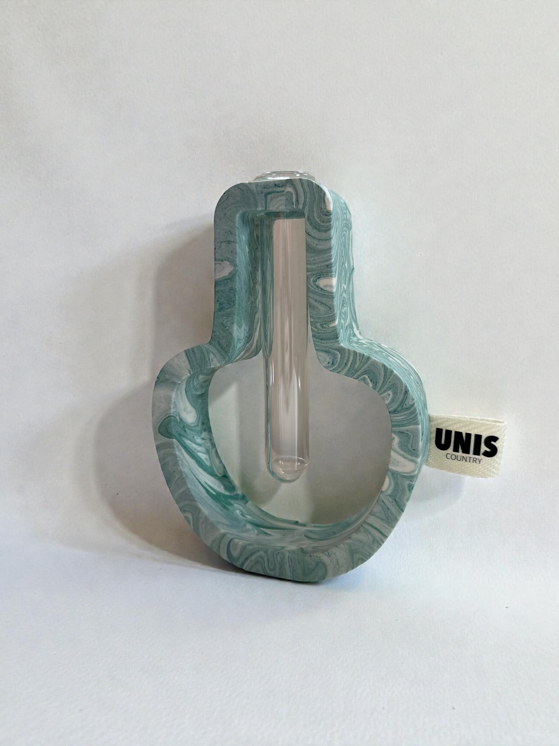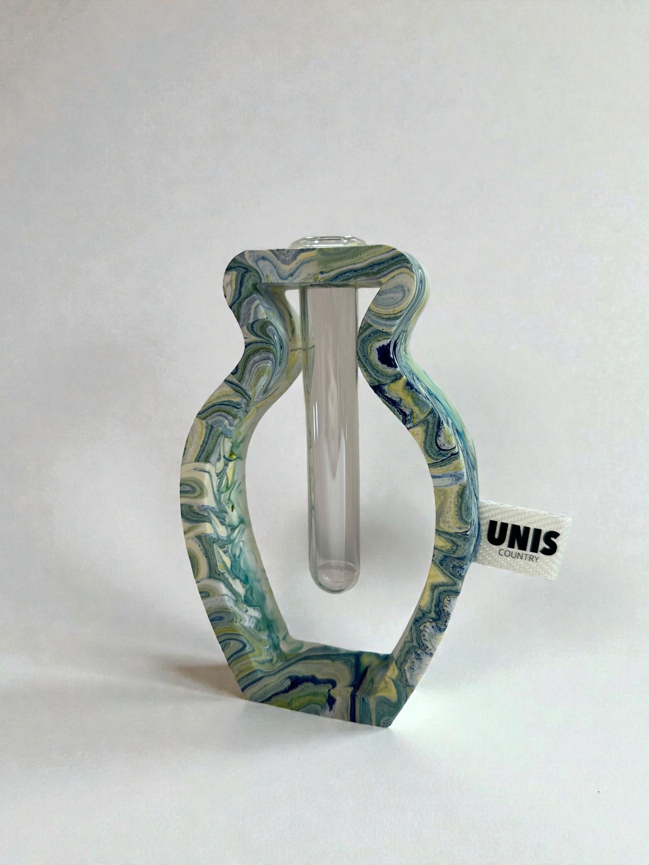 ジェスモナイトでひとつひとつ丁寧に作った本体に、試験管をゆらゆらっと通した、遊び心のあるフラワーベースです。