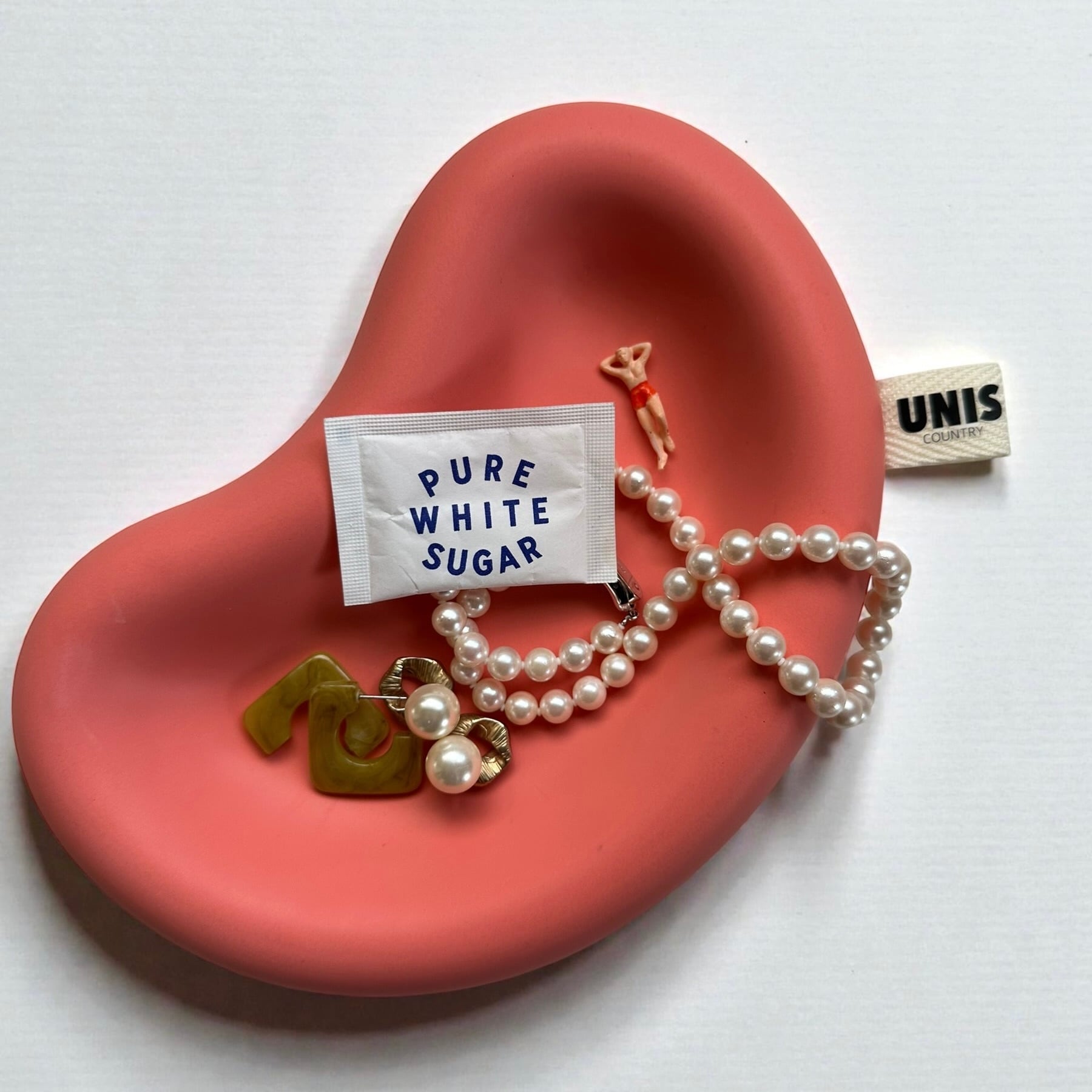 素材には、強度とやさしい手触り、環境への配慮を両立したジェスモナイトという素材を使用しています。ピアス、リング、鍵、コスメ、香水などお気に入りのアイテムたちを、このトレイに乗せてディスプレイできます。