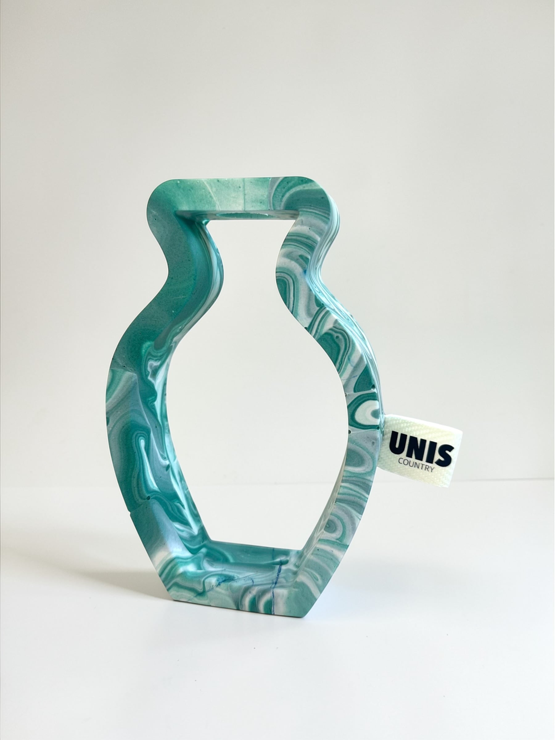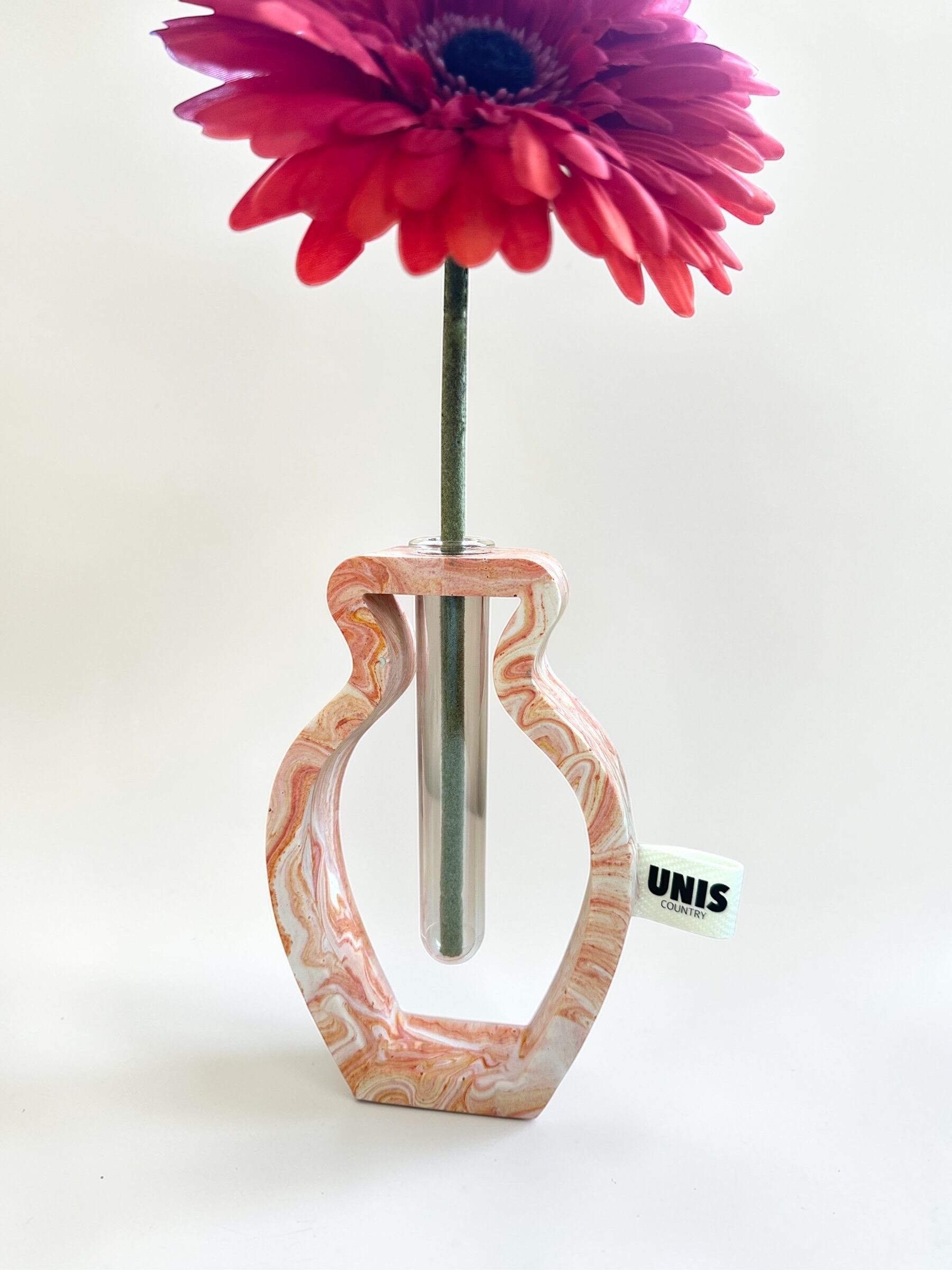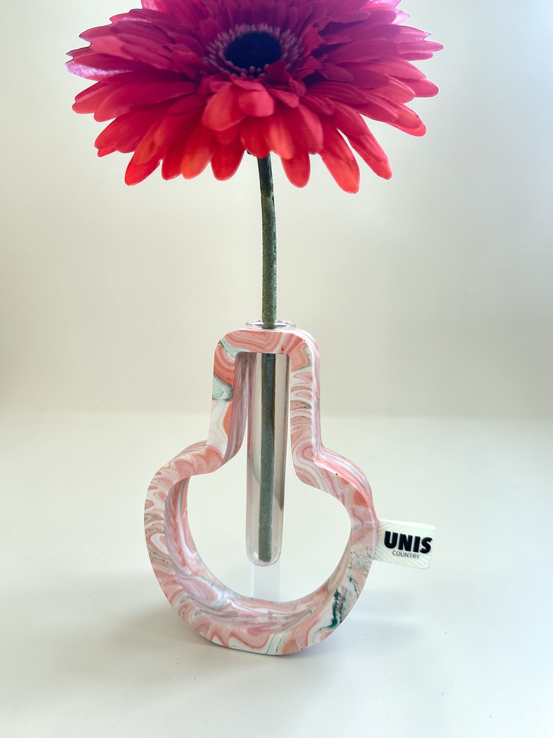 ジェスモナイトでひとつひとつ丁寧に作った本体に、試験管をゆらゆらっと通した、遊び心のあるフラワーベースです。