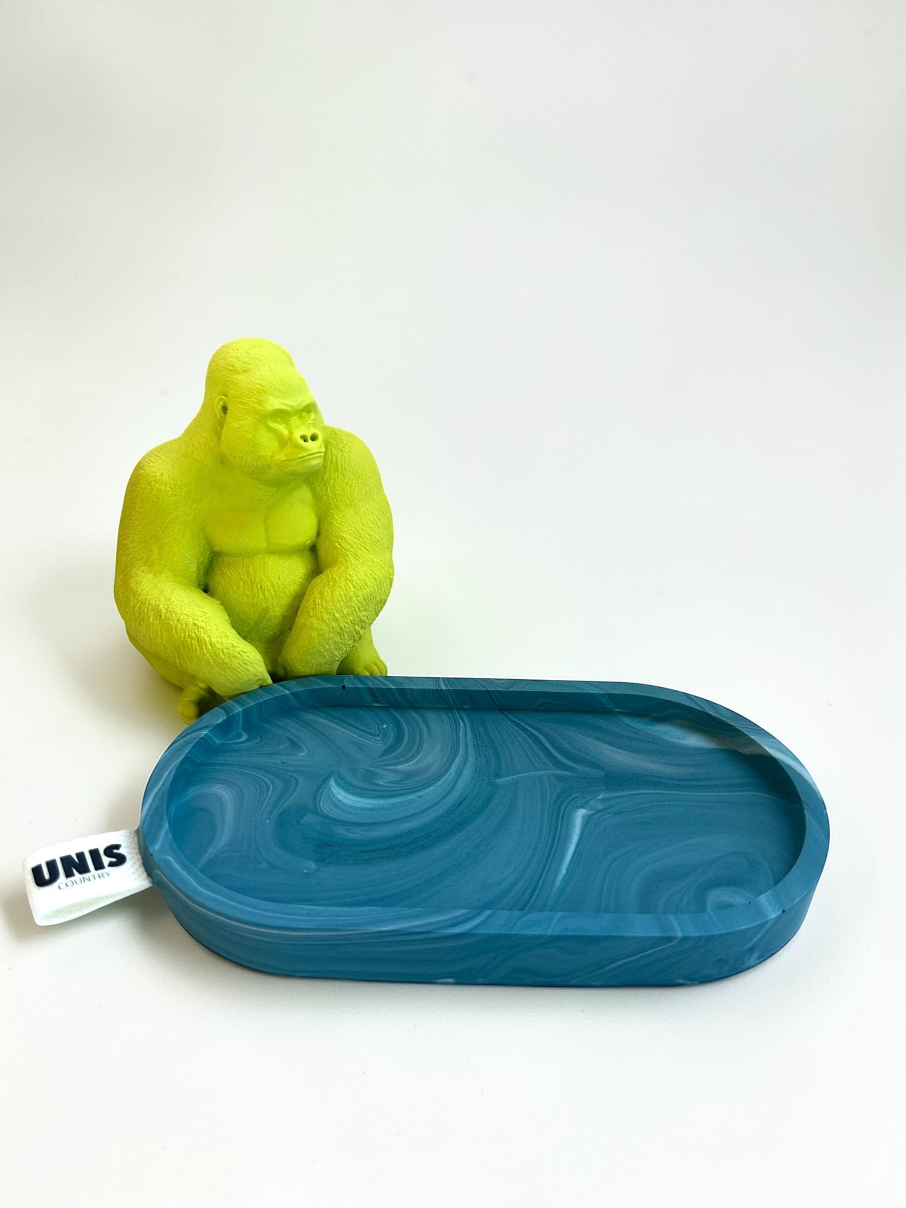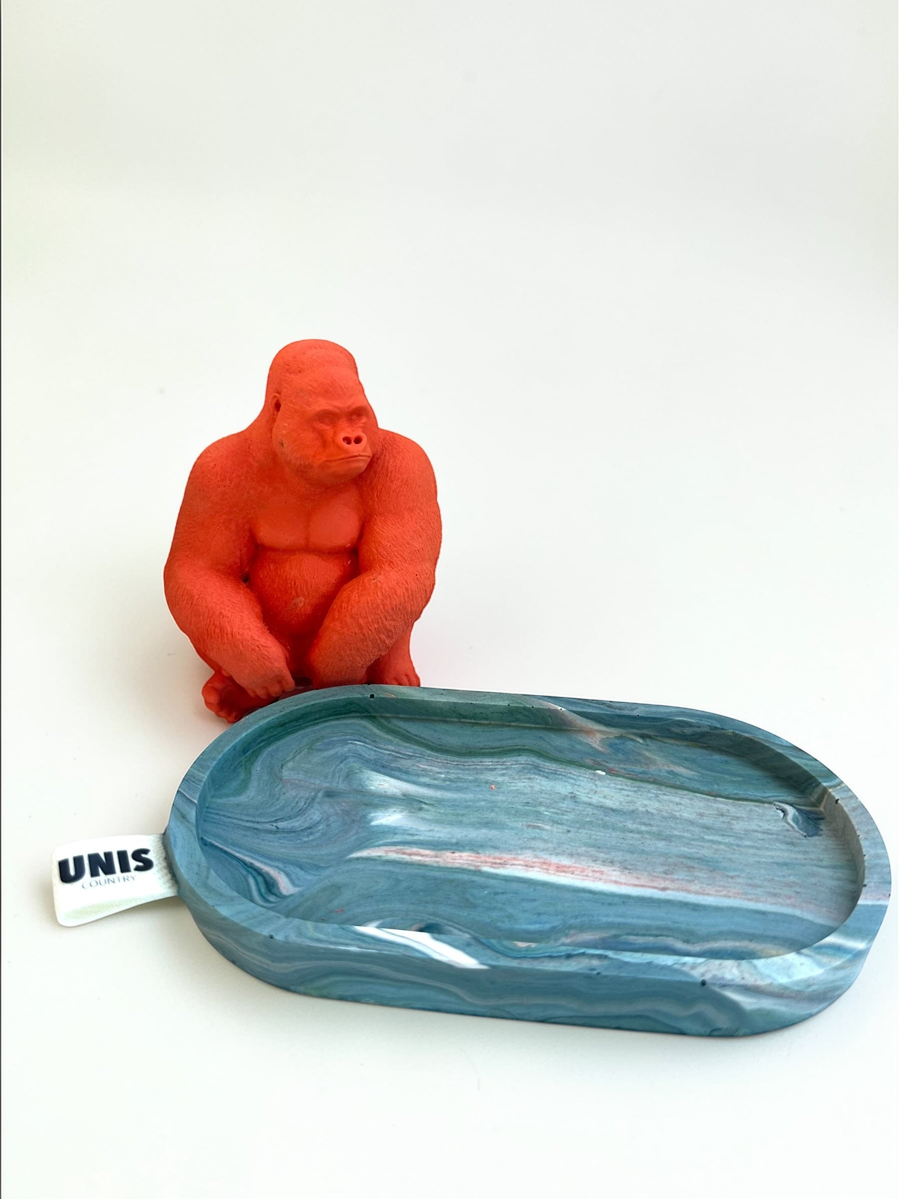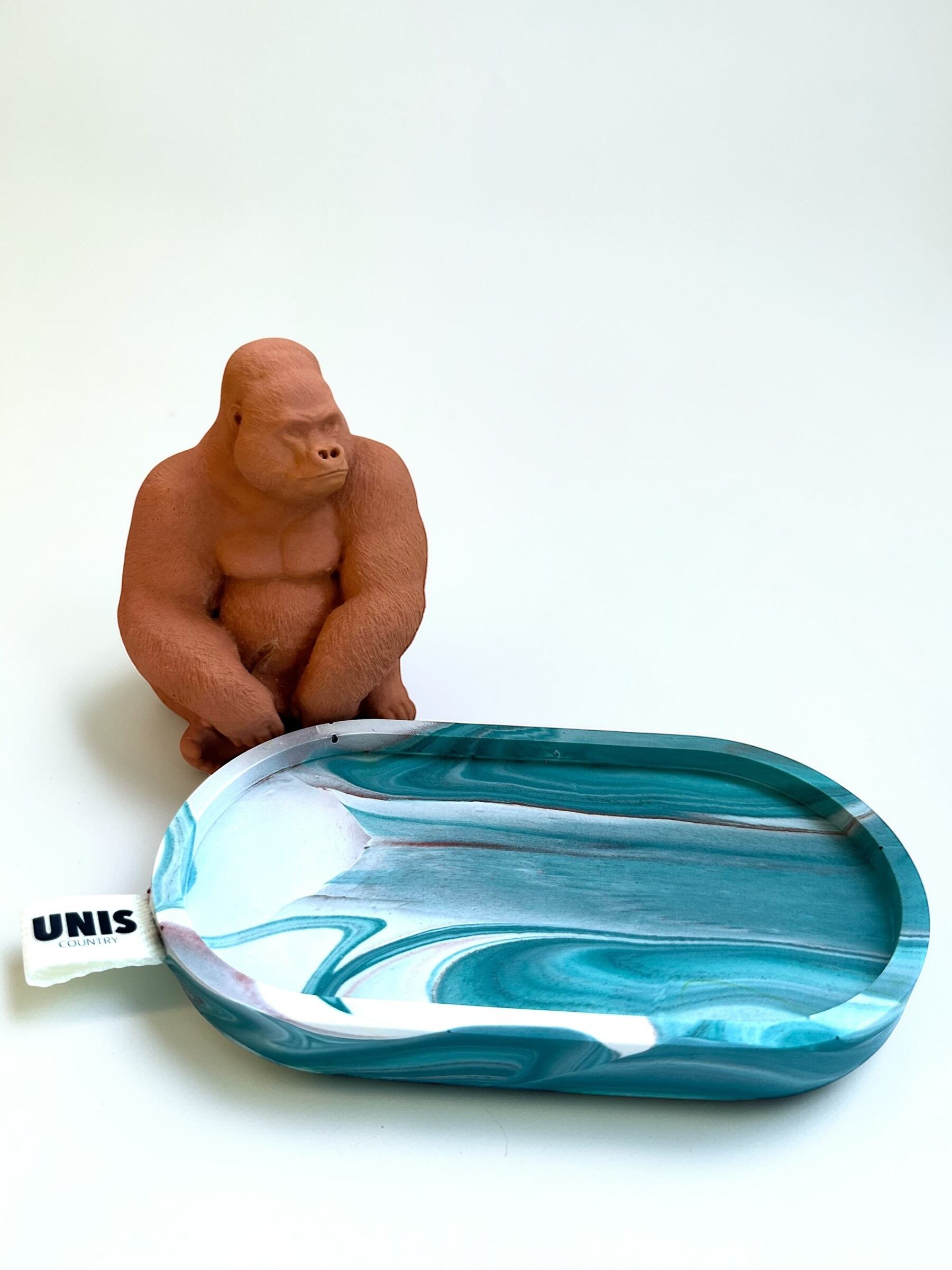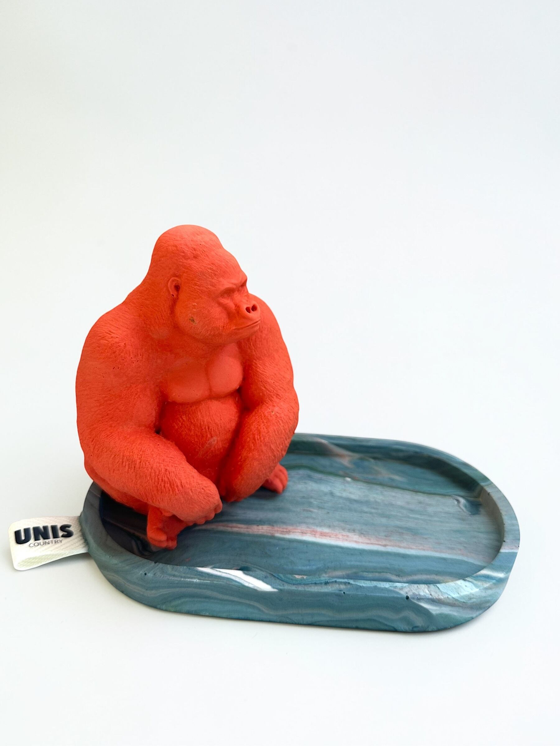 マーブル模様が映えるトレイに、ゴリラを添えた遊び心あふれるデザインです。