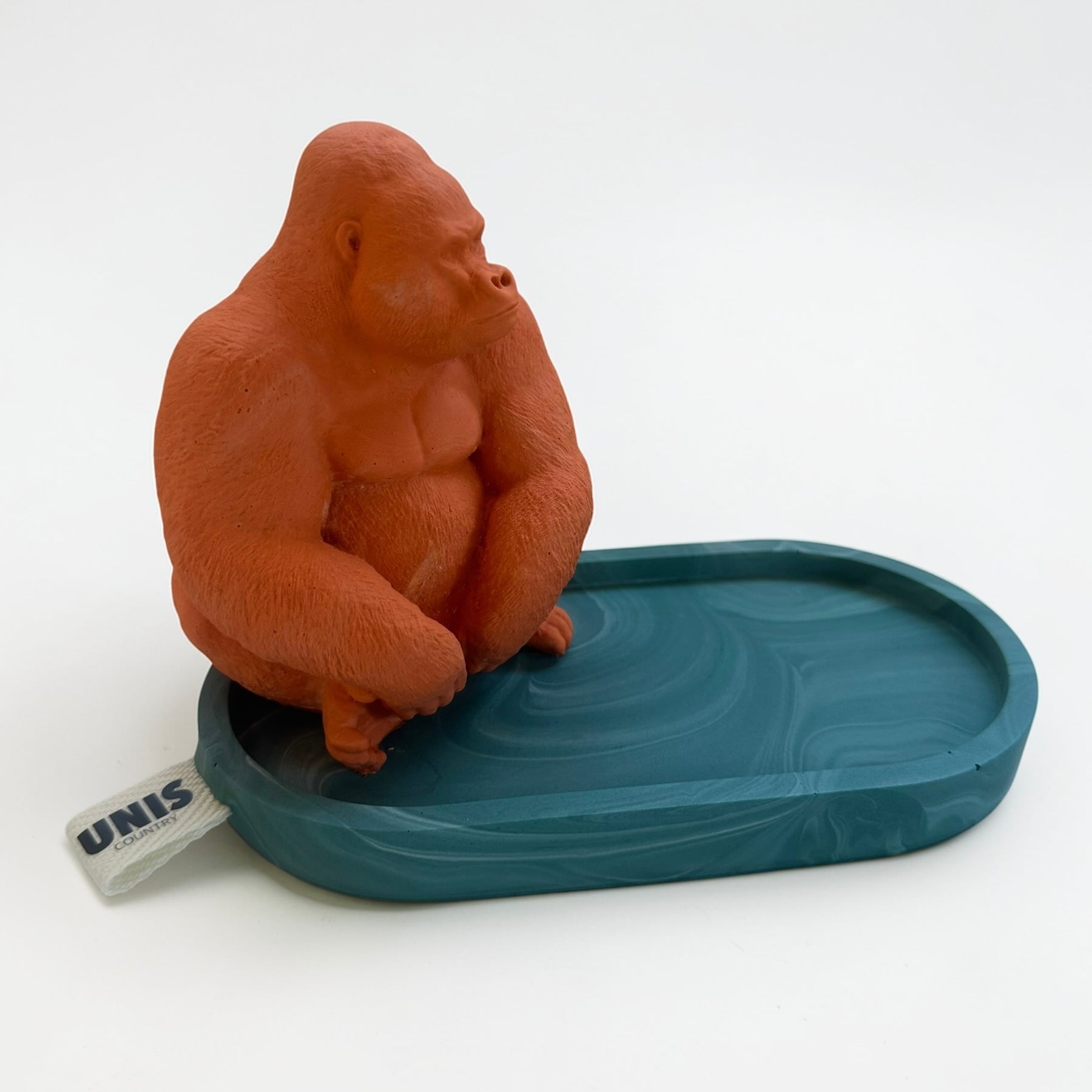 マーブル模様が映えるトレイに、ゴリラを添えた遊び心あふれるデザインです。