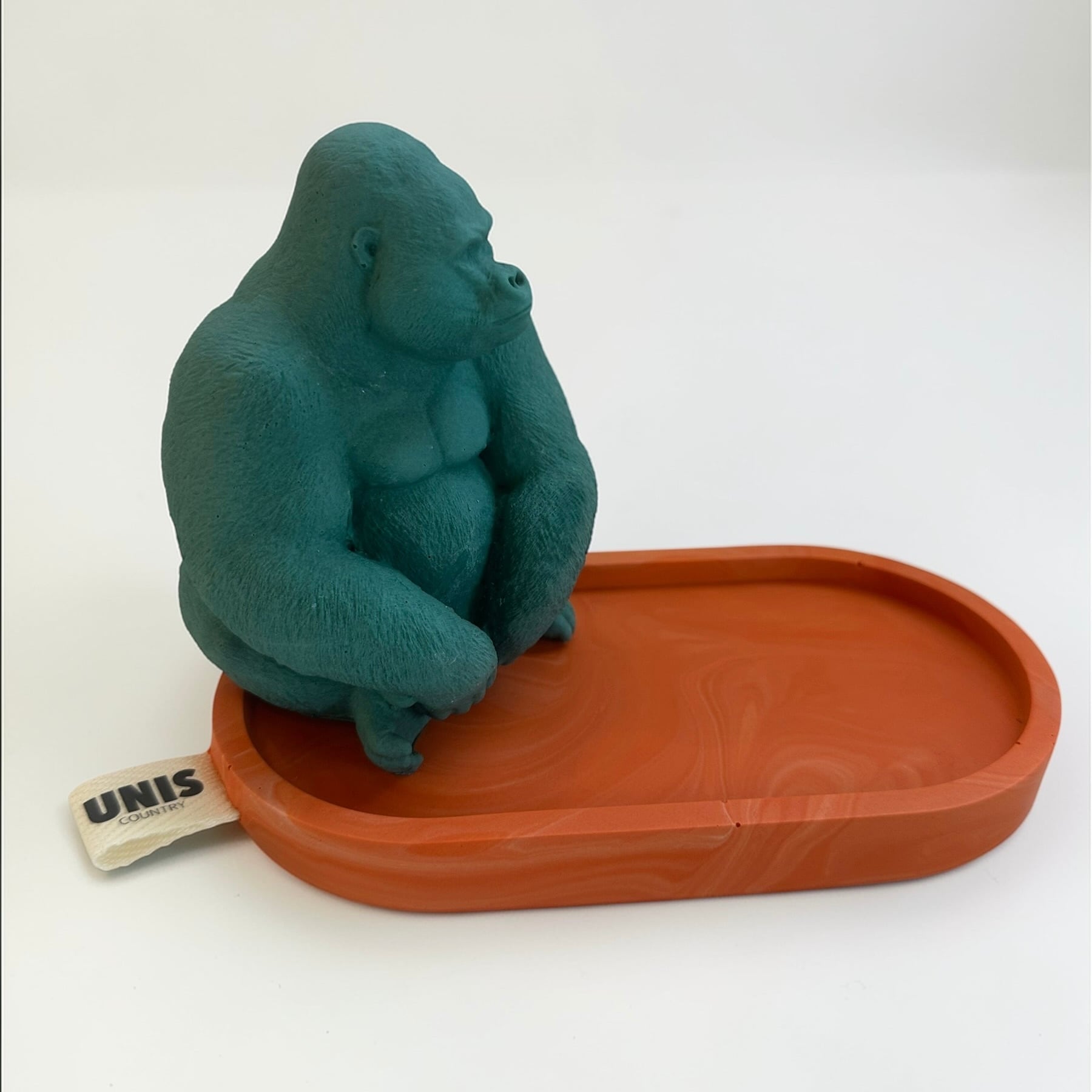 マーブル模様が映えるトレイに、ゴリラを添えた遊び心あふれるデザインです。