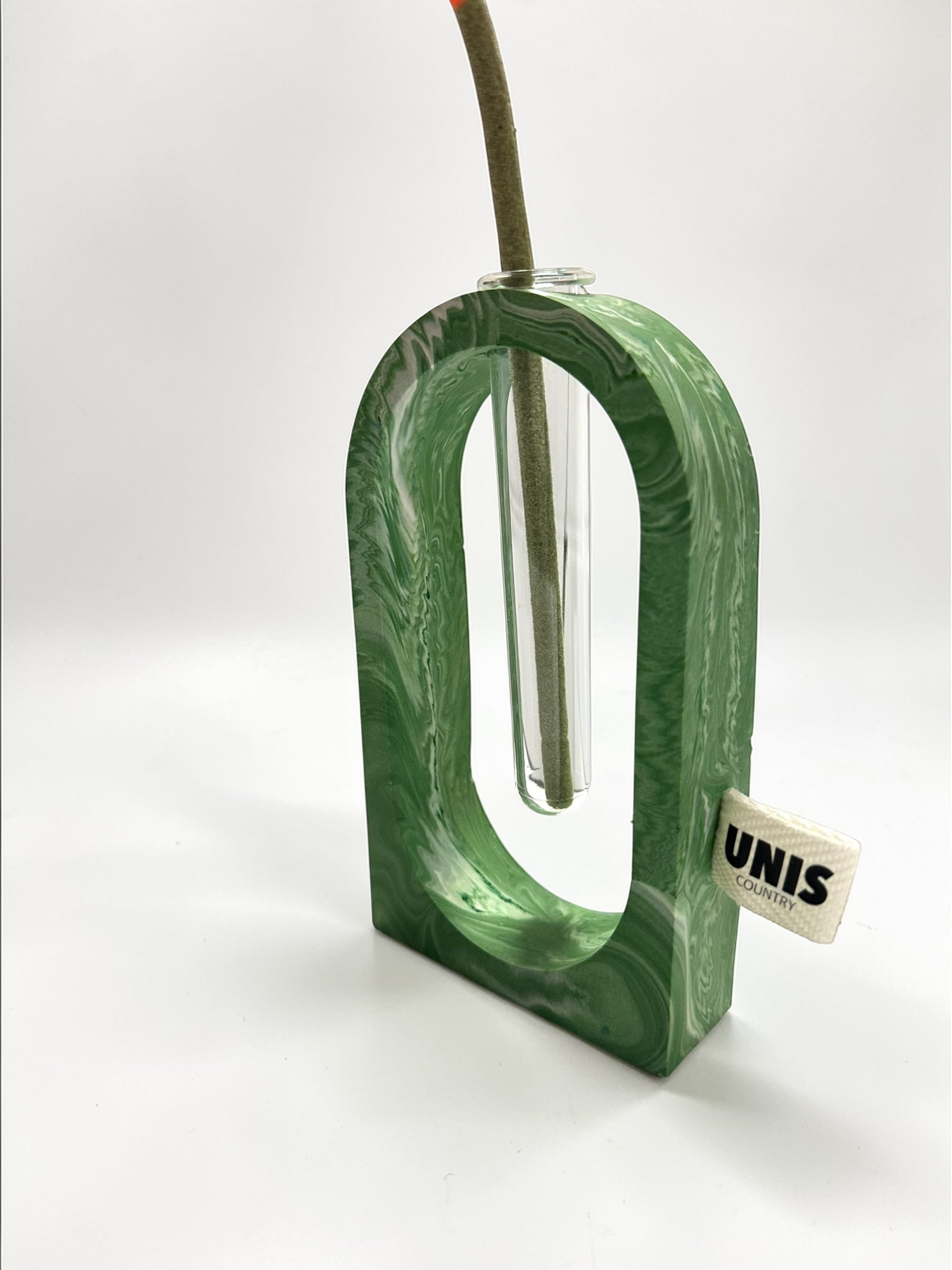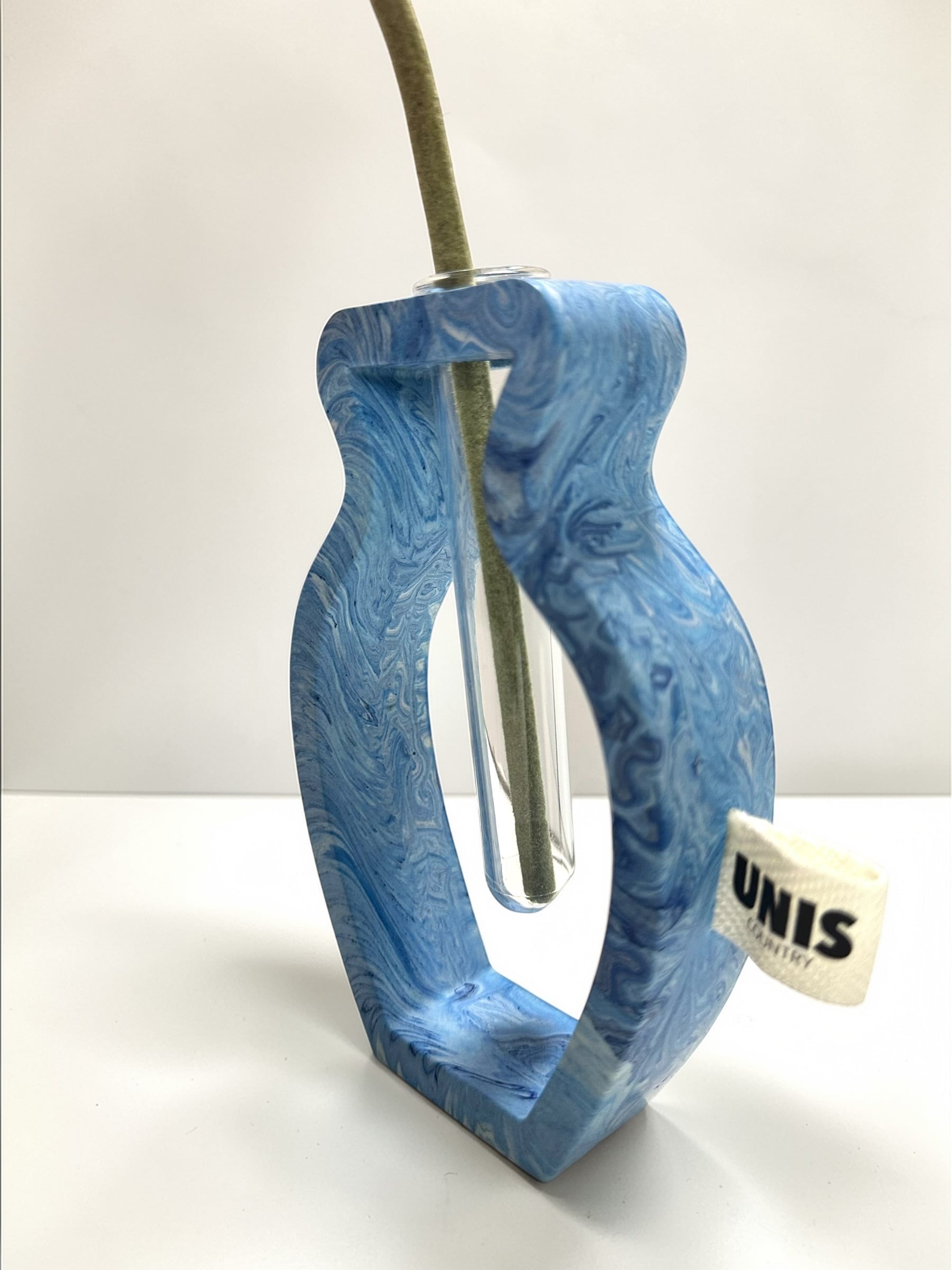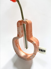 ジェスモナイトでひとつひとつ丁寧に作った本体に、試験管をゆらゆらっと通した、遊び心のあるフラワーベースです。