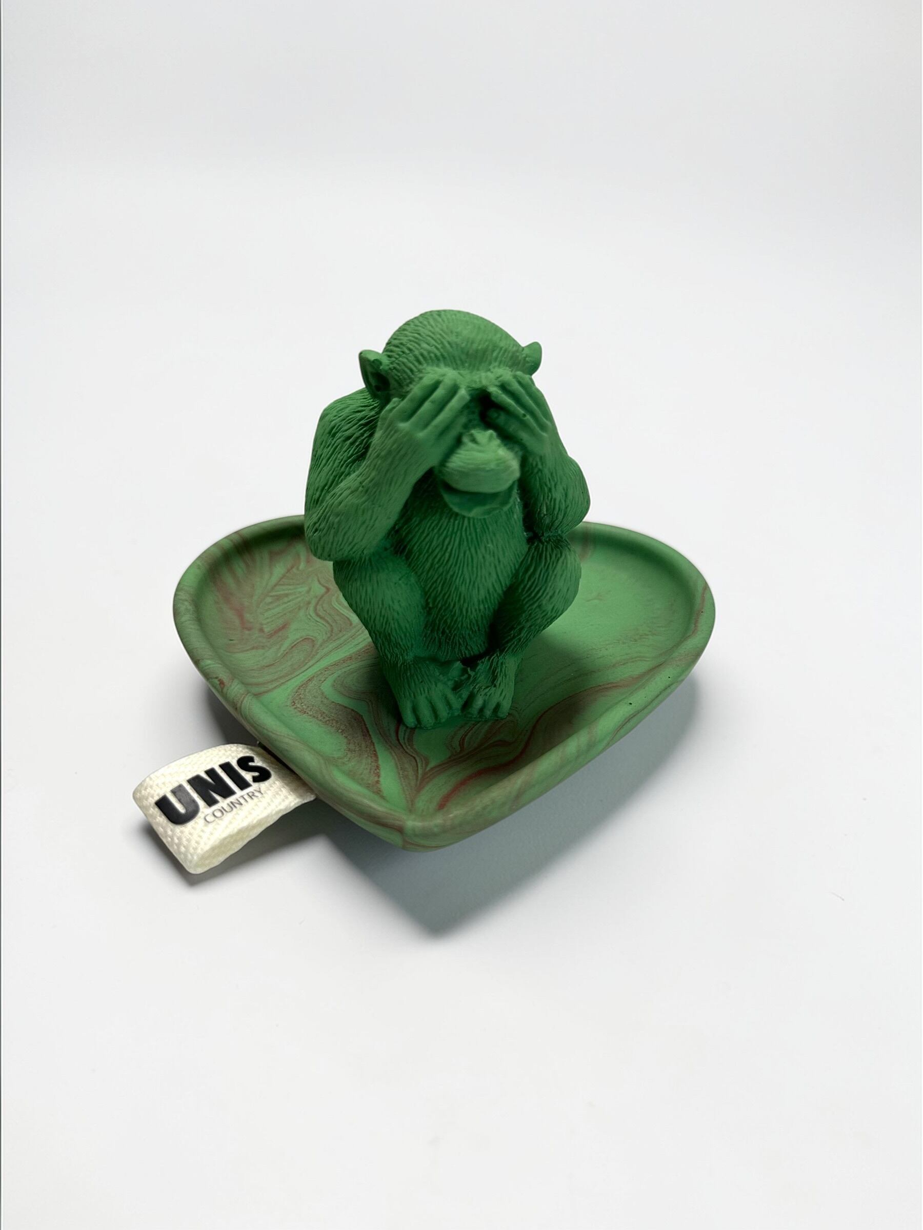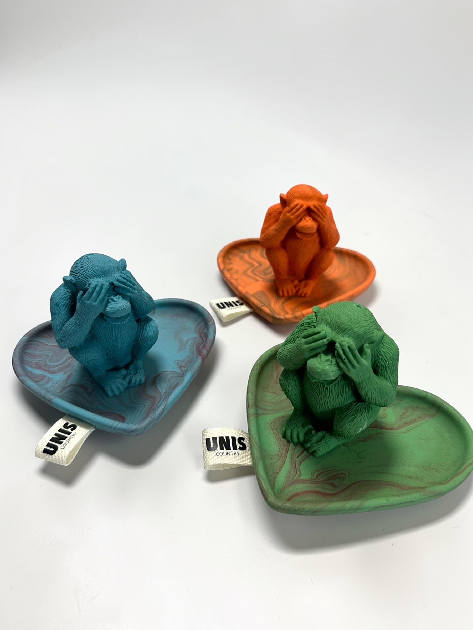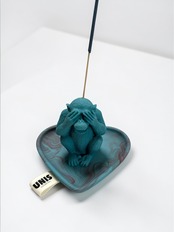 リラックスタイムに、おてんばなお猿が、お香の燃えかすが降ってくるよ〜!と目をふさぐ、思わずくすっとしてしまう表情が魅力のお香立てです。