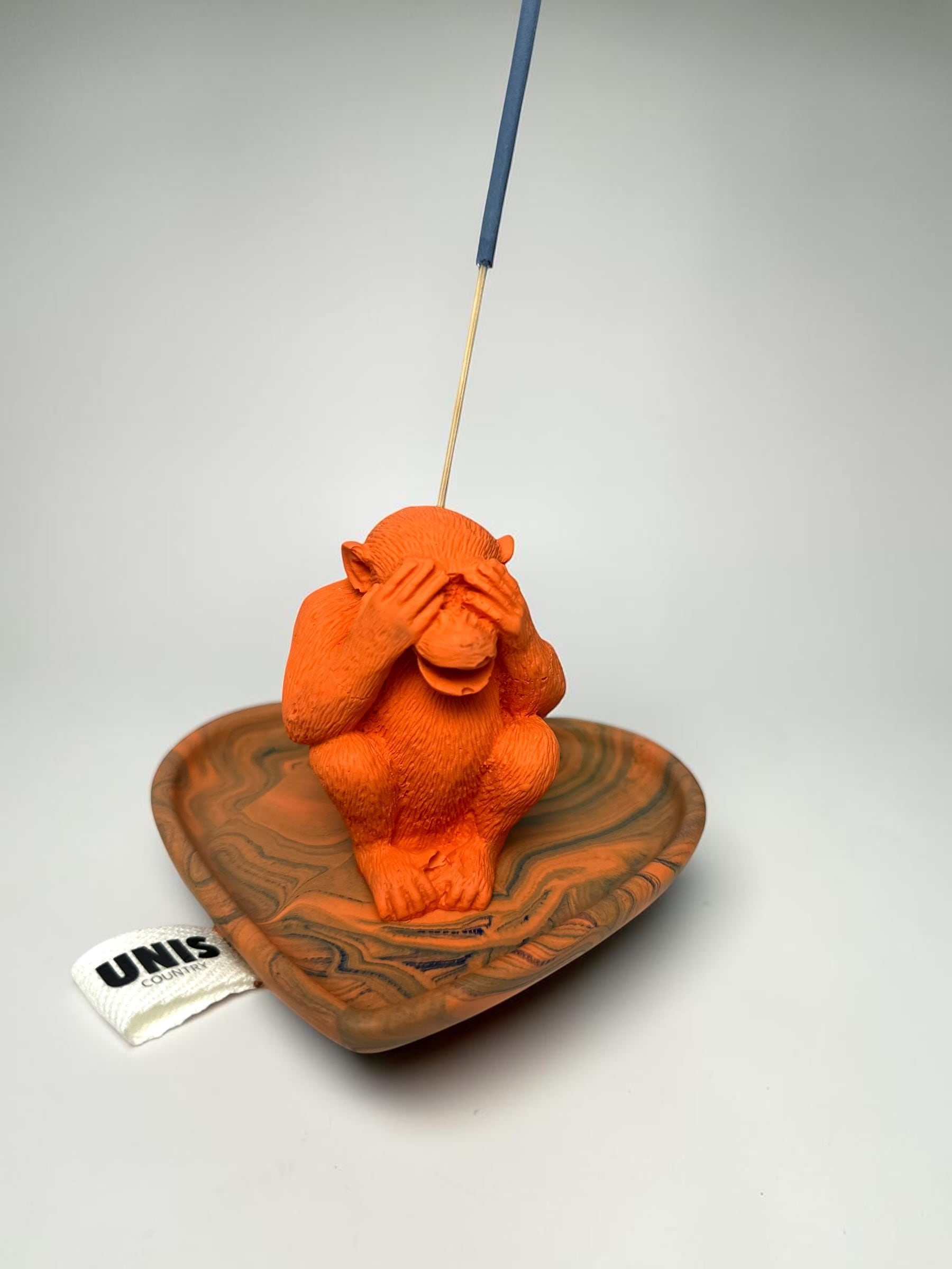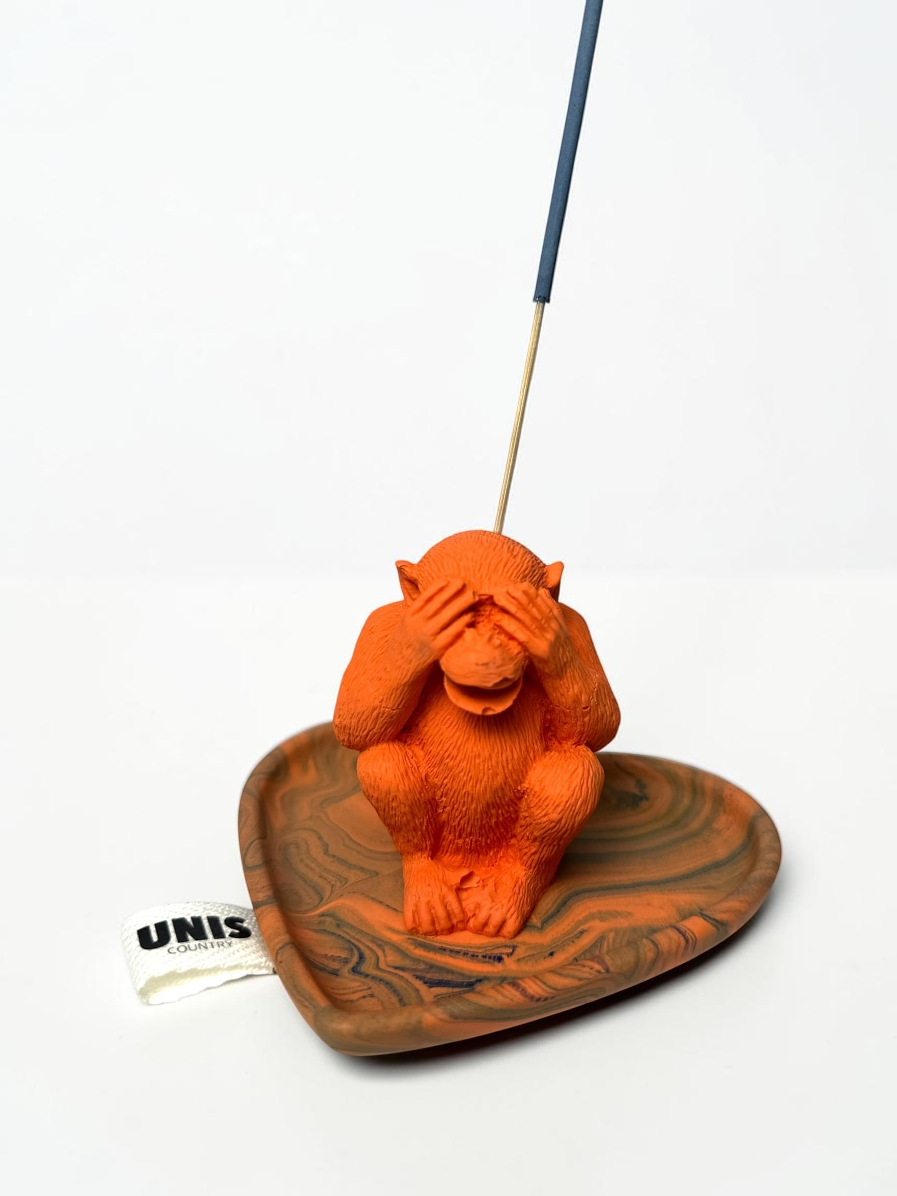 リラックスタイムに、おてんばなお猿が、お香の燃えかすが降ってくるよ〜!と目をふさぐ、思わずくすっとしてしまう表情が魅力のお香立てです。