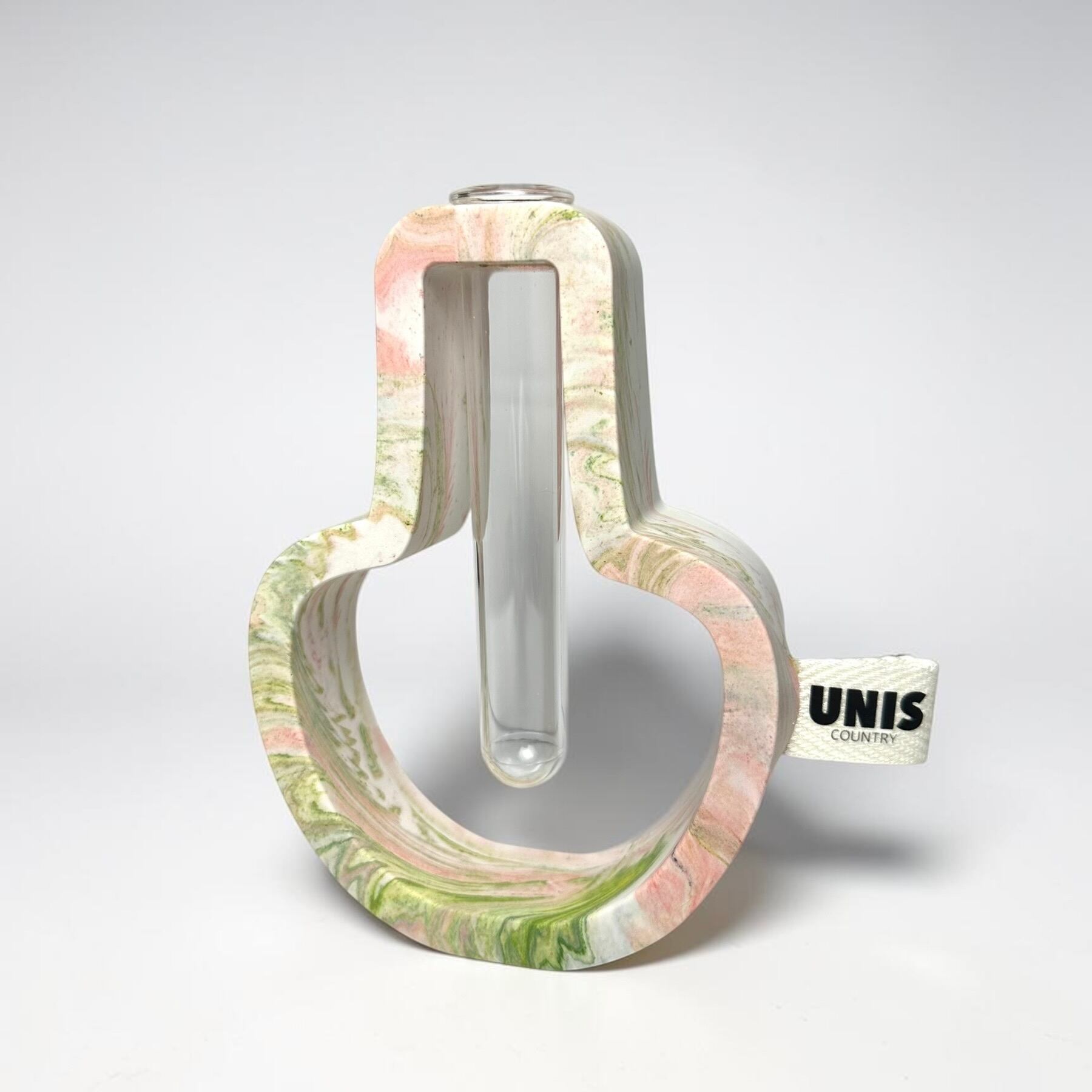 ジェスモナイトでひとつひとつ丁寧に作った本体に、試験管をゆらゆらっと通した、遊び心のあるフラワーベースです。