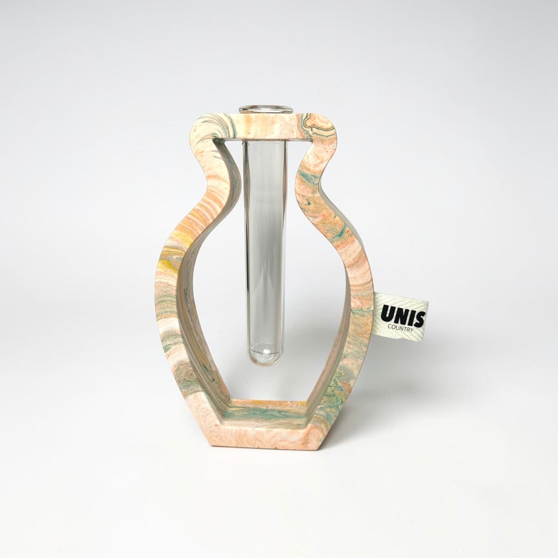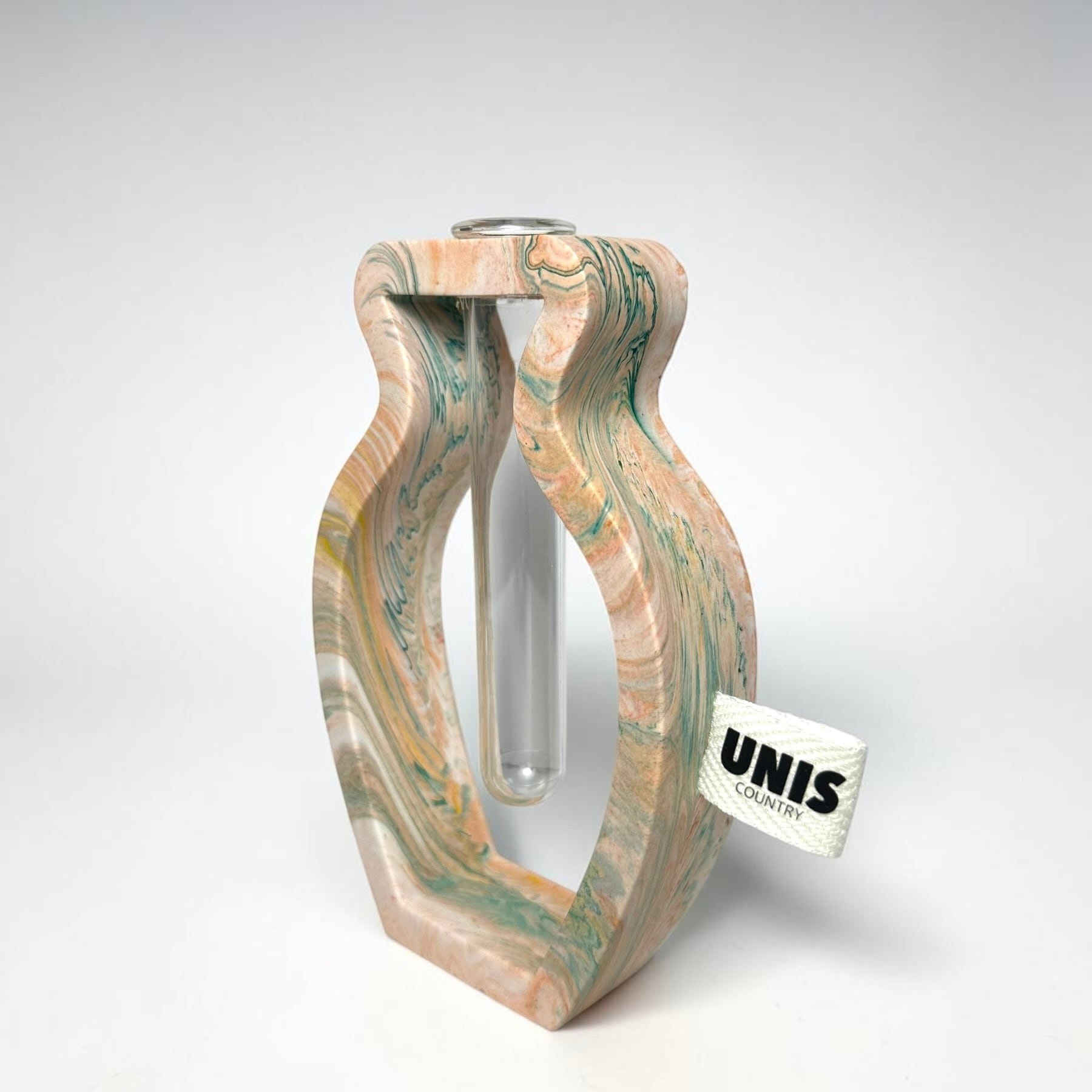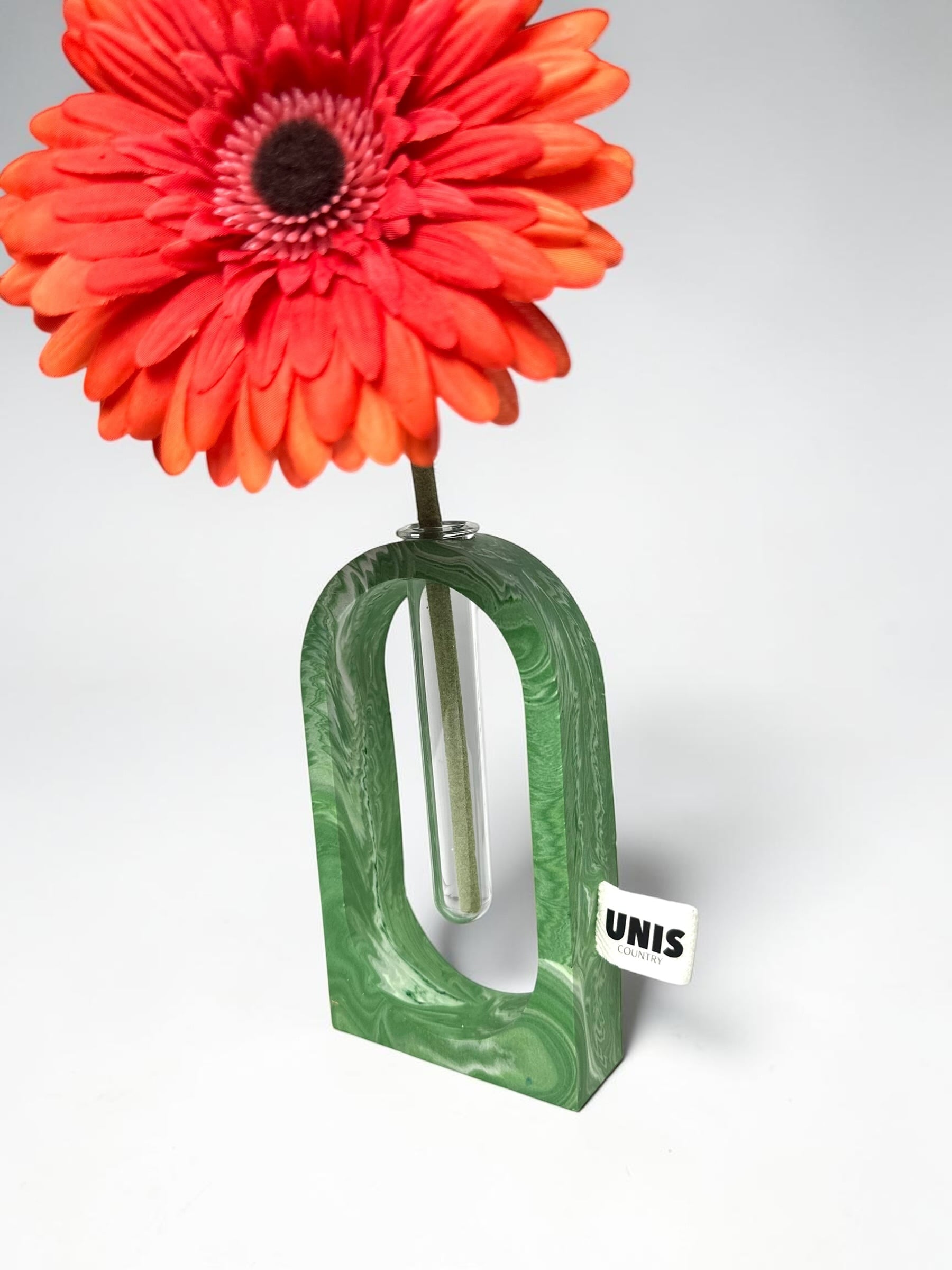 ジェスモナイトでひとつひとつ丁寧に作った本体に、試験管をゆらゆらっと通した、遊び心のあるフラワーベースです。