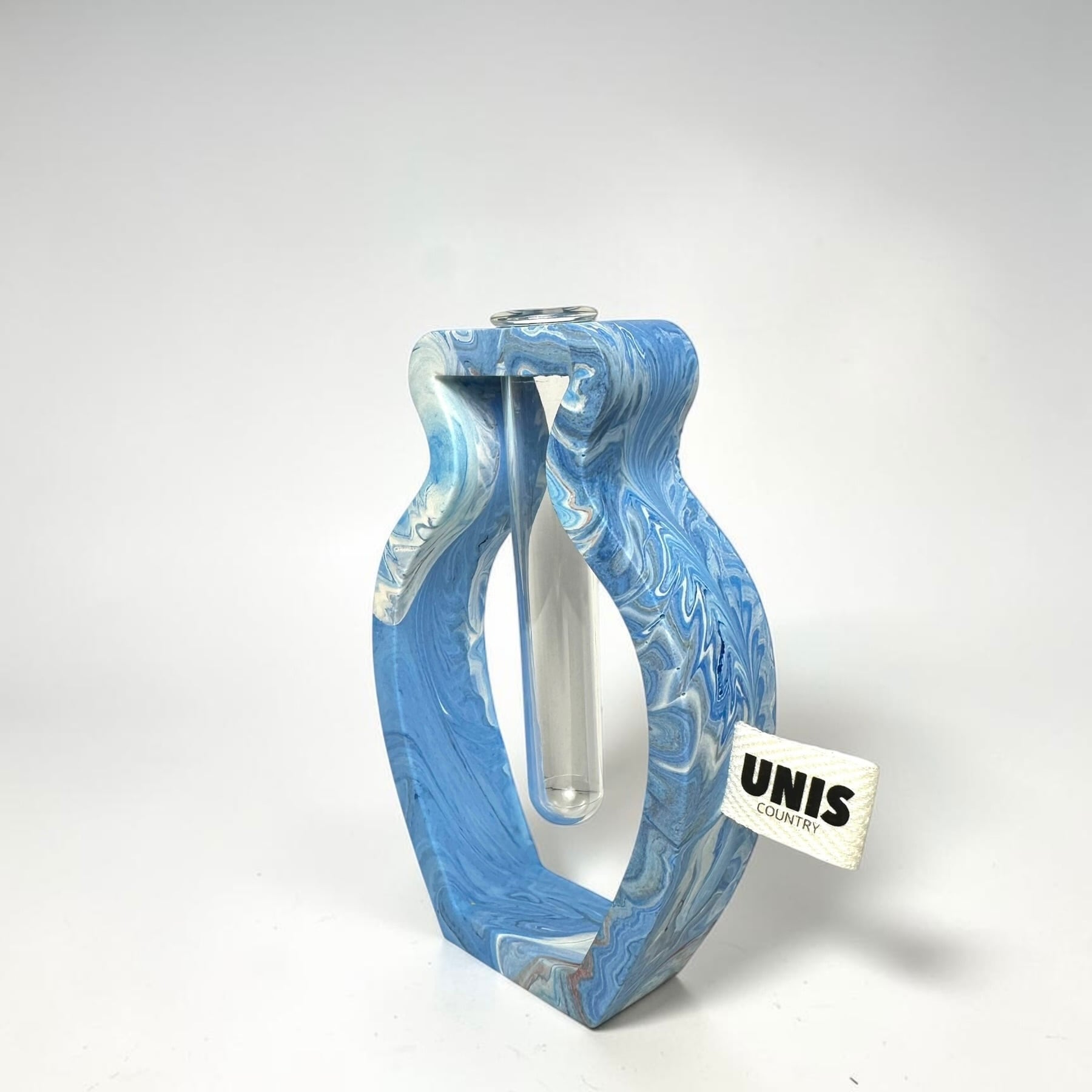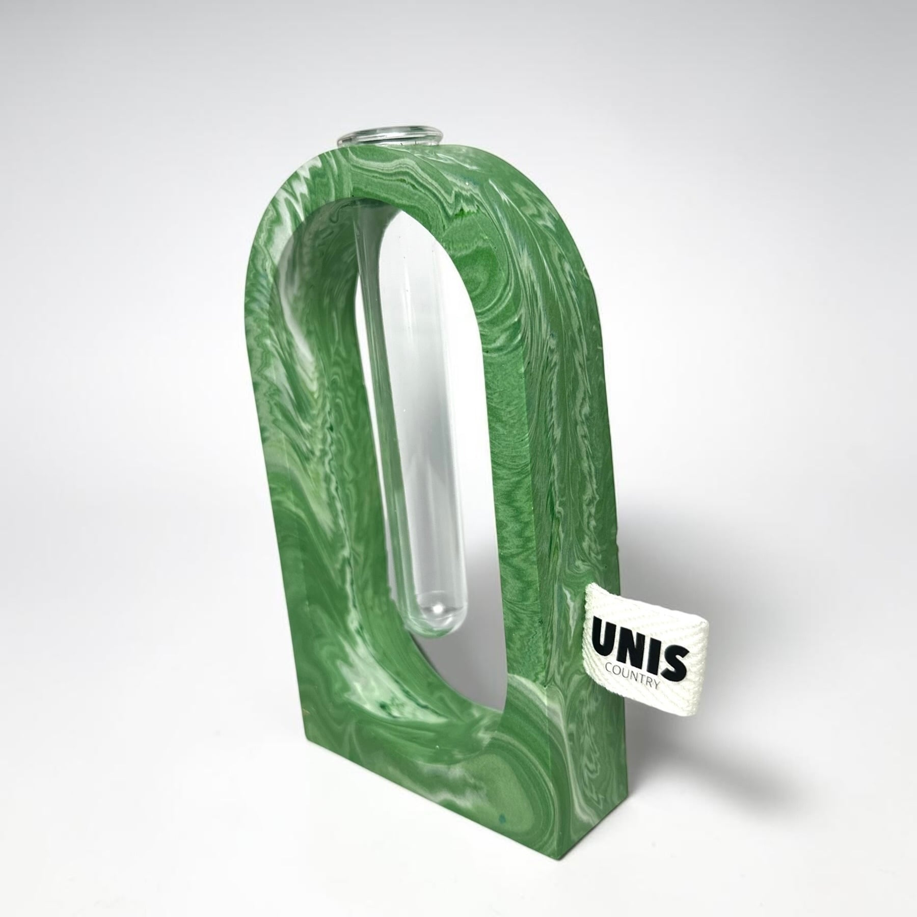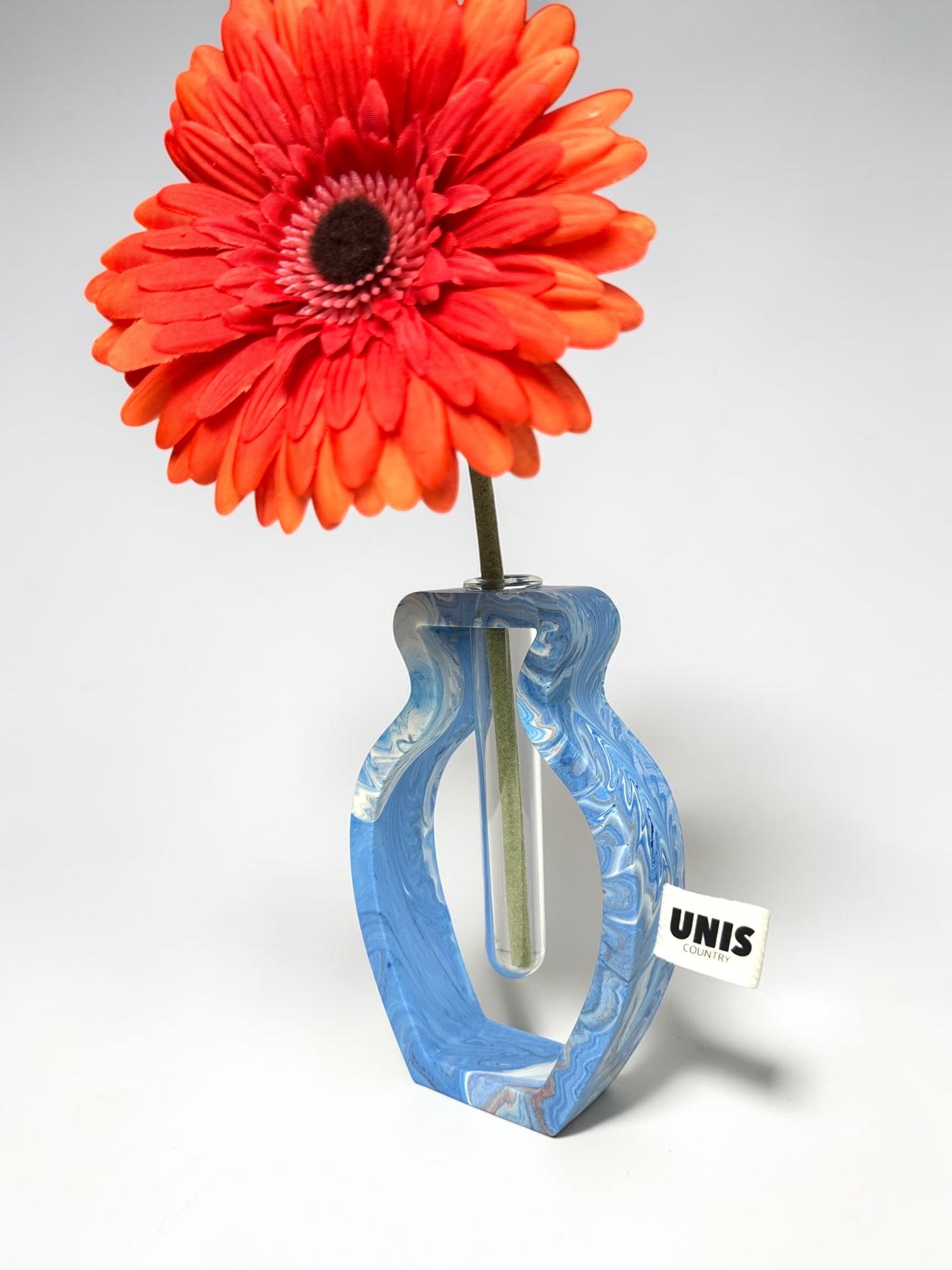ジェスモナイトでひとつひとつ丁寧に作った本体に、試験管をゆらゆらっと通した、遊び心のあるフラワーベースです。