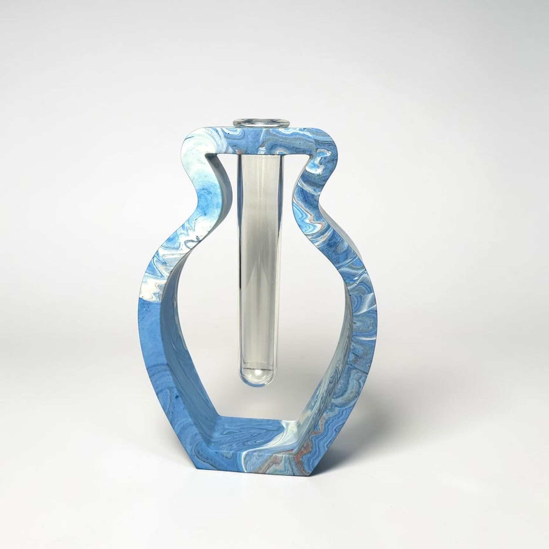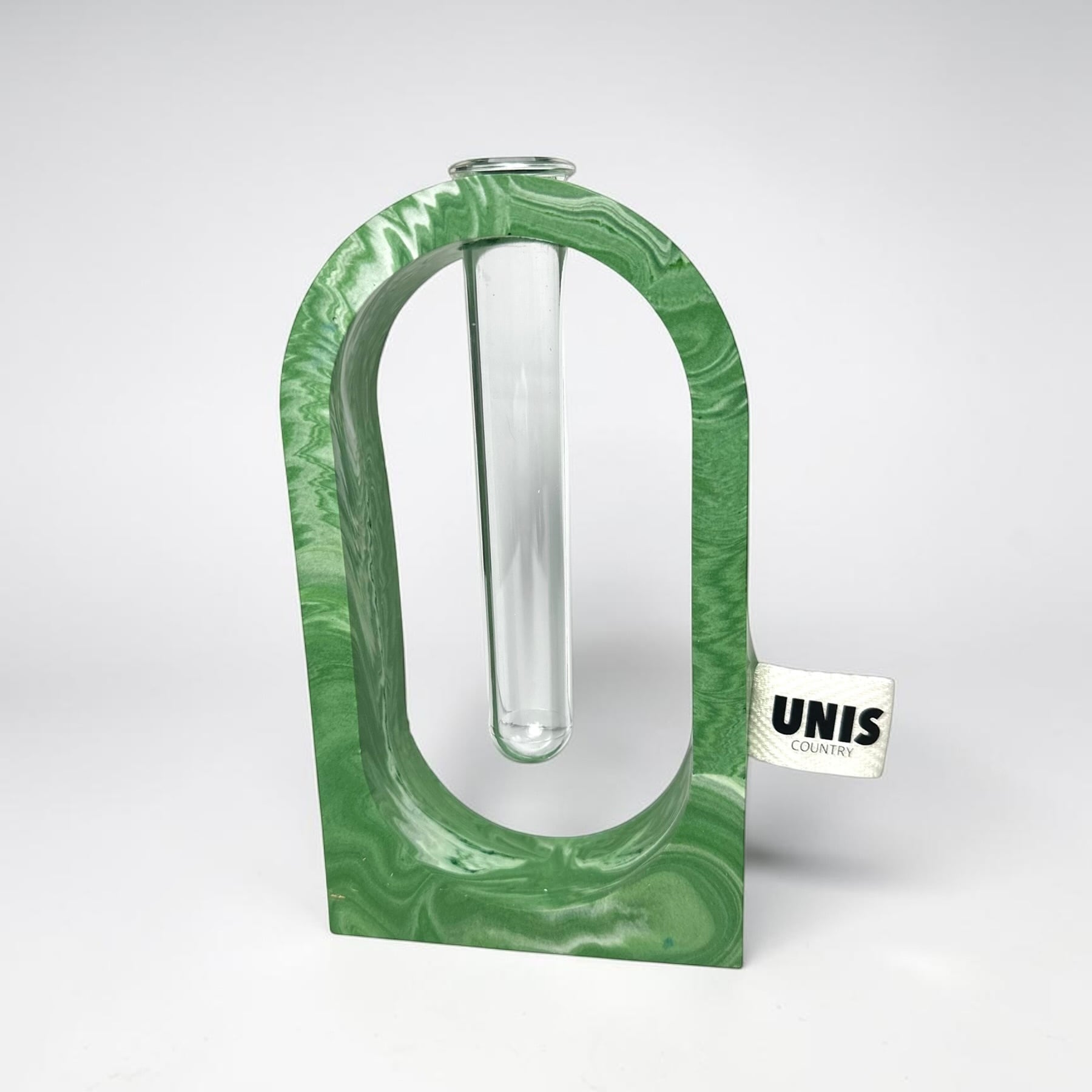 ジェスモナイトでひとつひとつ丁寧に作った本体に、試験管をゆらゆらっと通した、遊び心のあるフラワーベースです。
