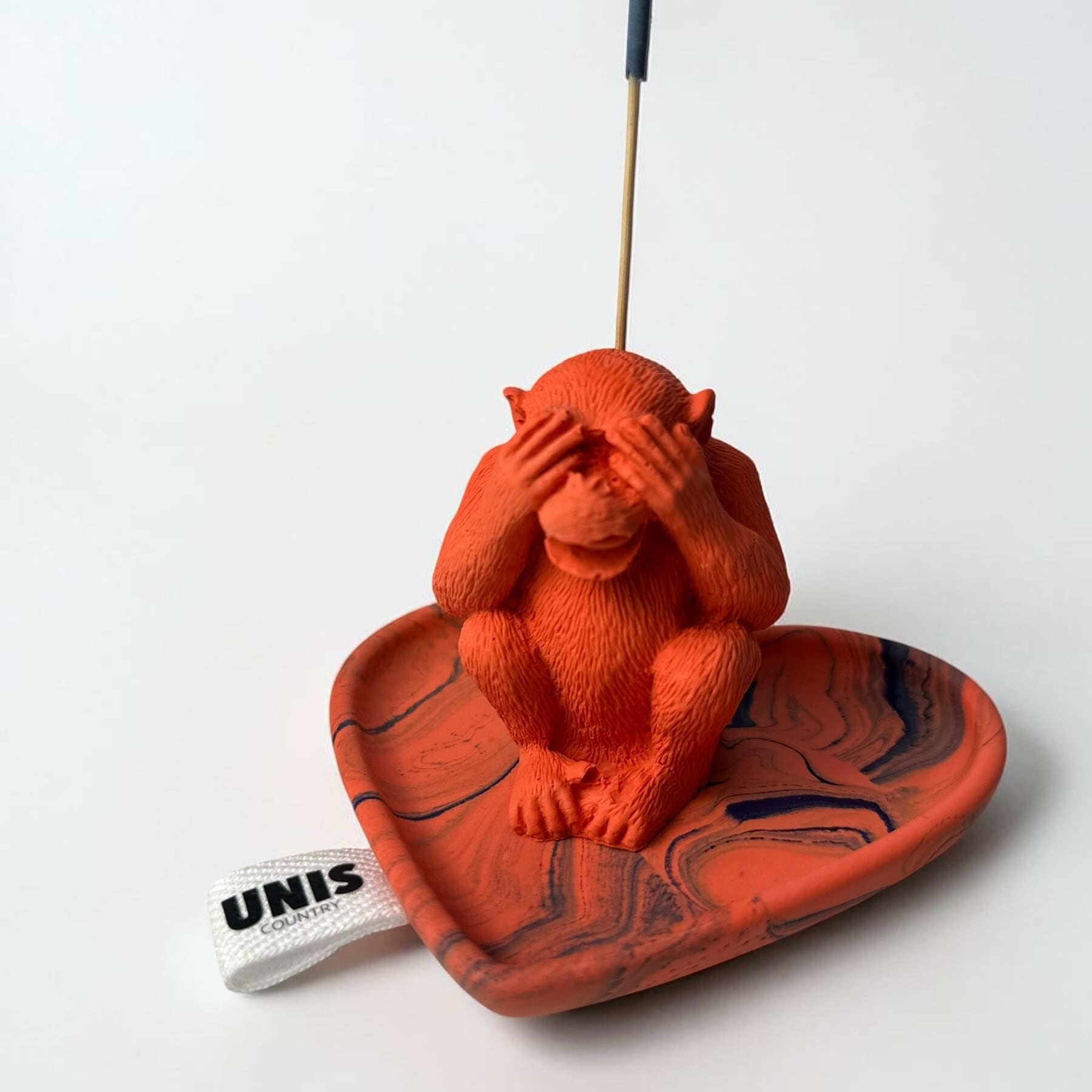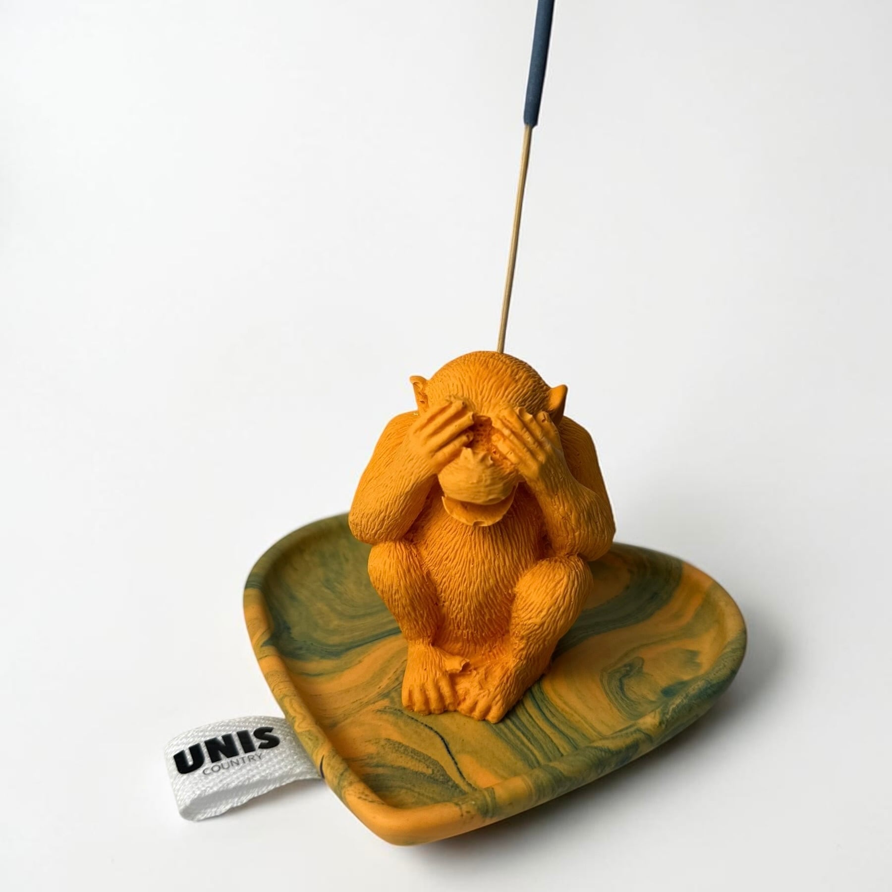 リラックスタイムに、おてんばなお猿が、お香の燃えかすが降ってくるよ〜!と目をふさぐ、思わずくすっとしてしまう表情が魅力のお香立てです。