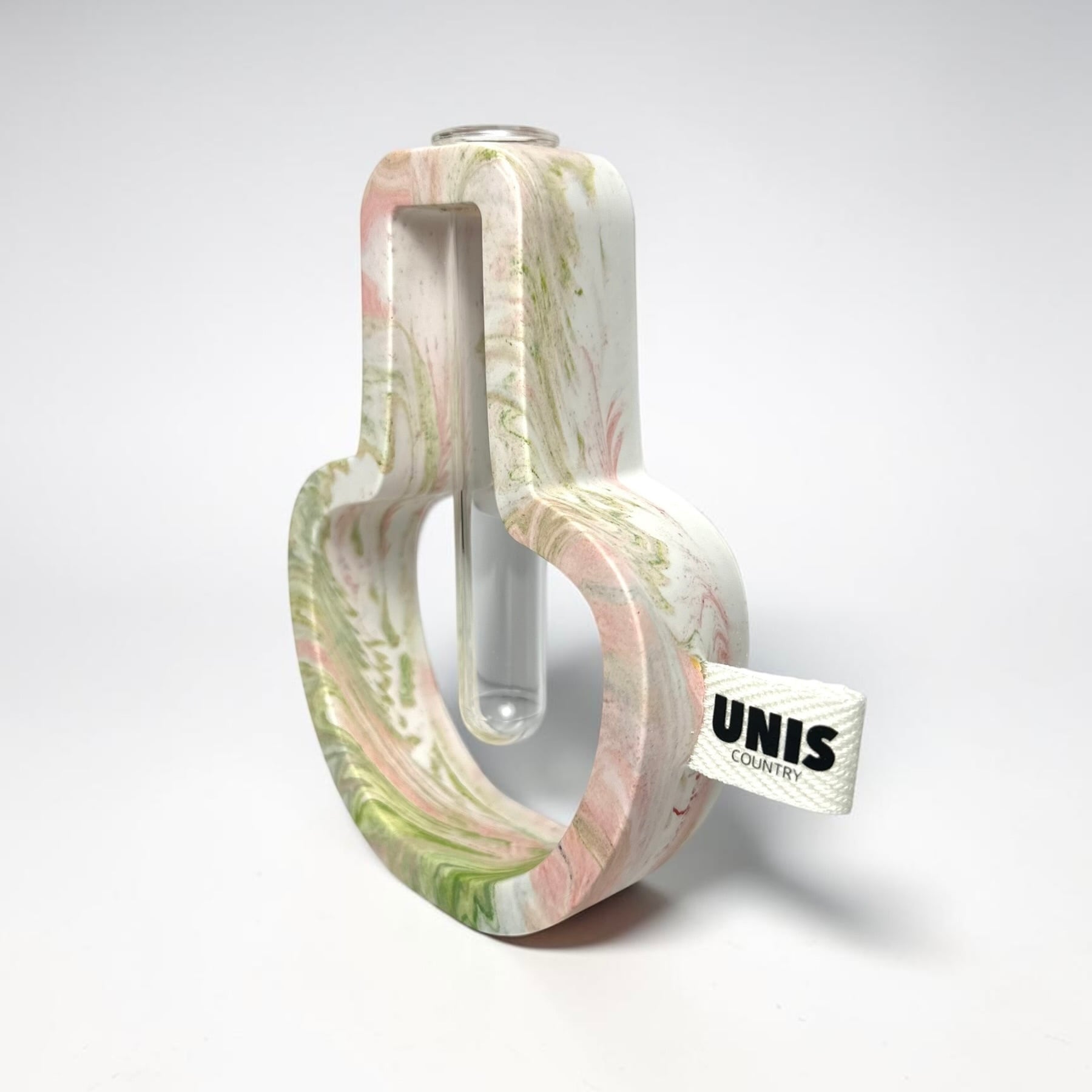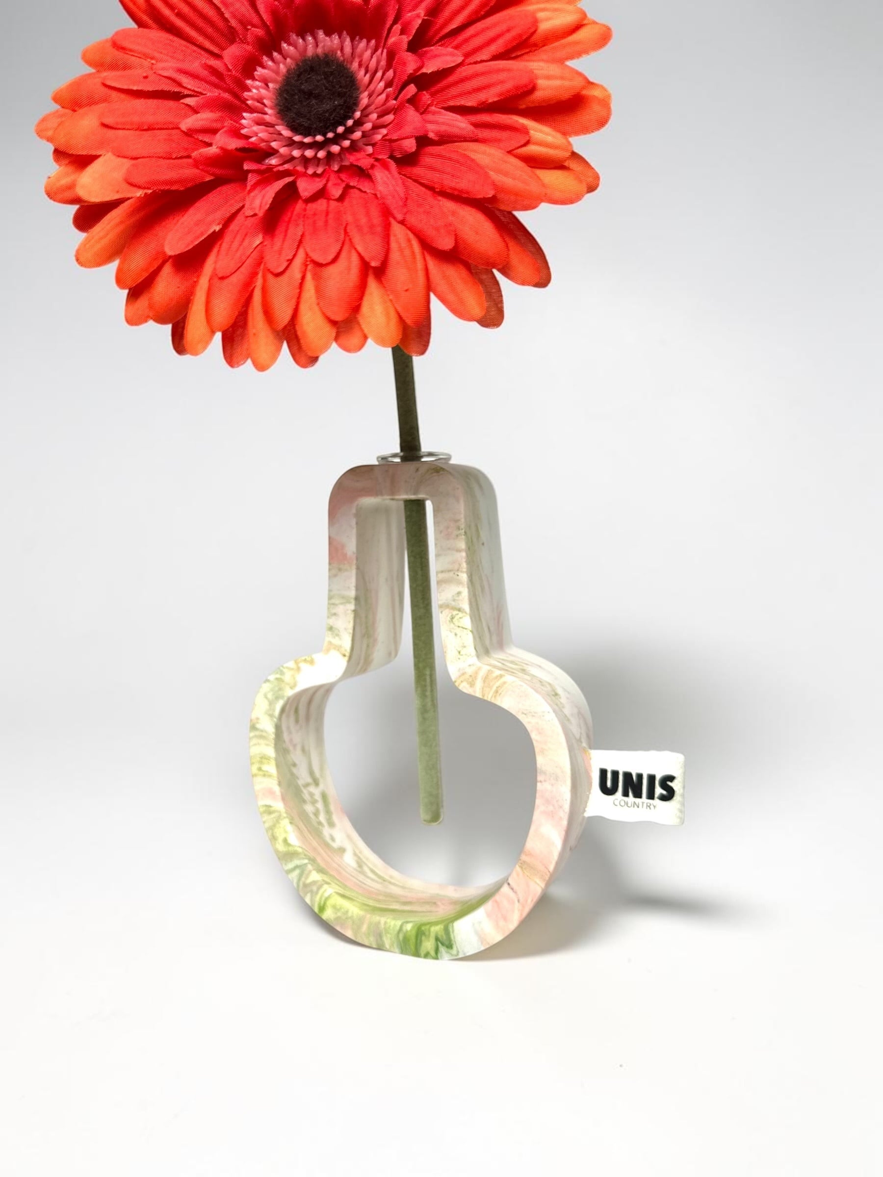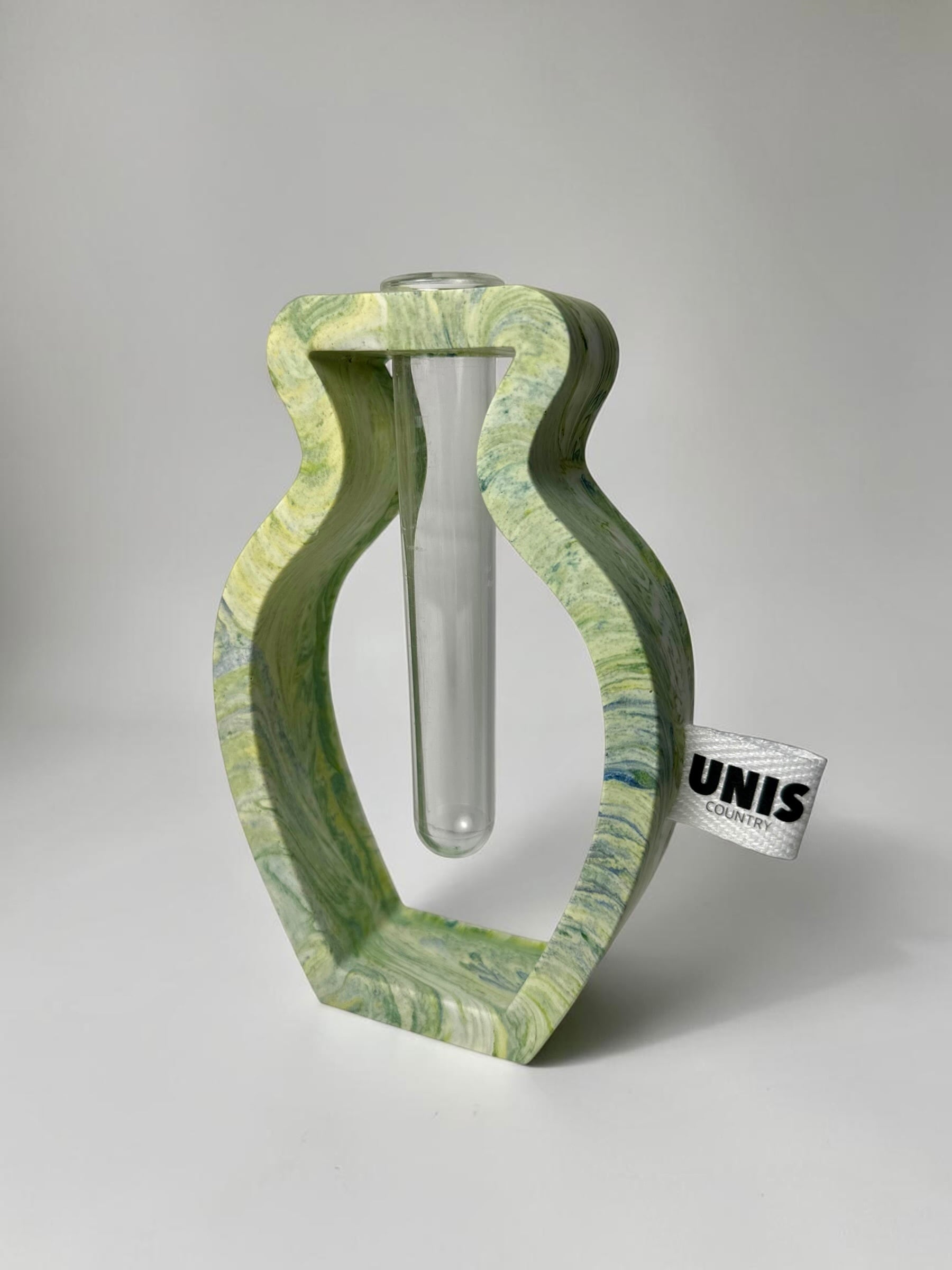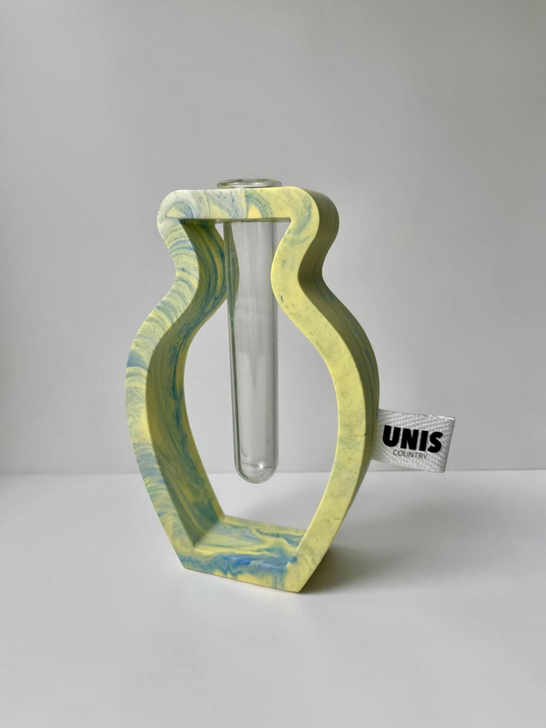 ジェスモナイトでひとつひとつ丁寧に作った本体に、試験管をゆらゆらっと通した、遊び心のあるフラワーベースです。